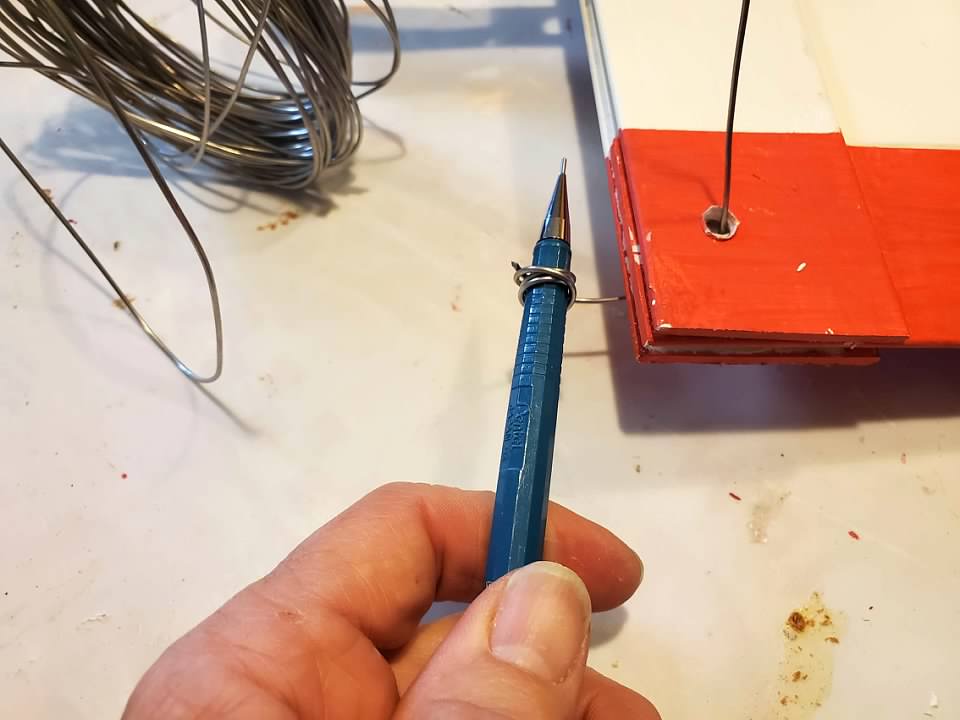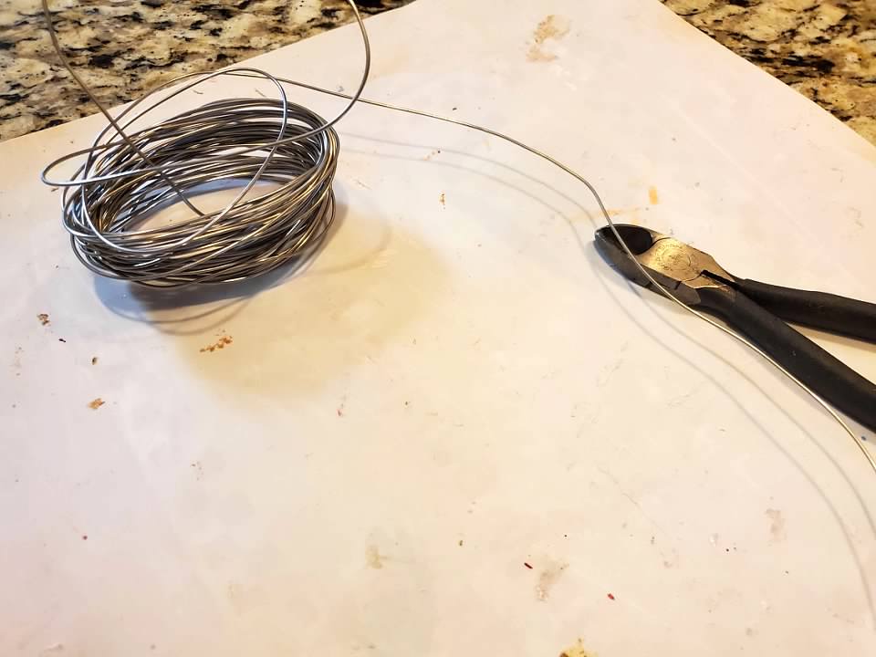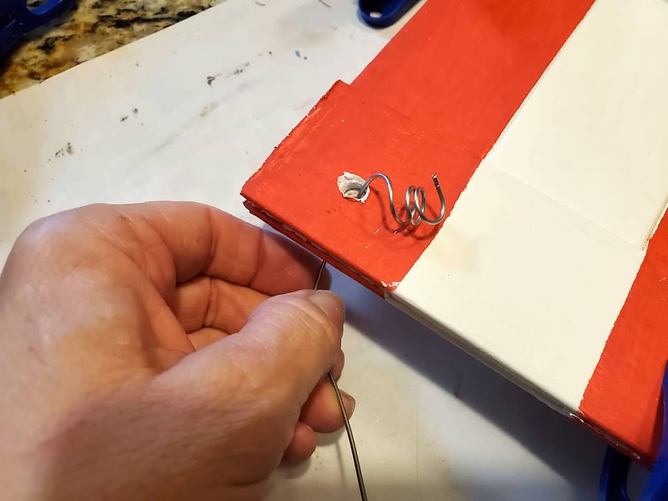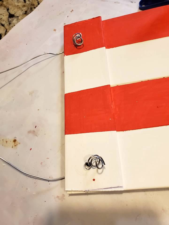 Taking some strong wire and adding it to the top of my hat.  I thread the wire through the drilled hole wrapped it around a pin.  This will stop the wire from going through the hole when hanging.  I did my wire two ways for you, one to use as a wall hanger and the other way to use on a flag pole like I am doing.