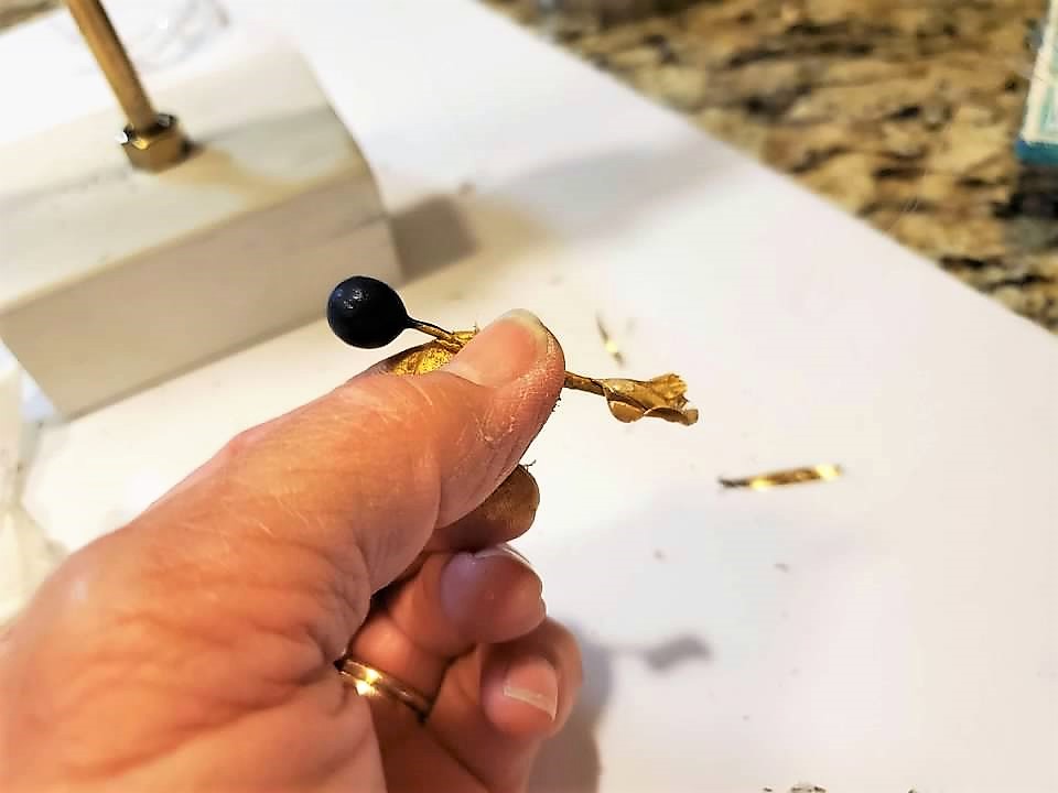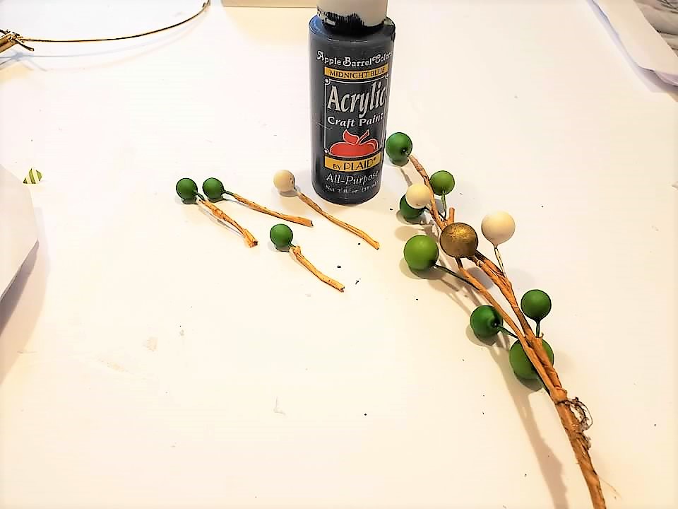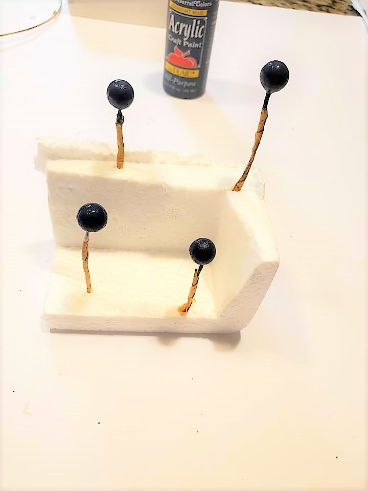 On to the Olives. I am using some of my wooden bead picks. Taking the smallest of the beads and painting them navy. I am not too sure what color the olives are on the Kotinos wreath, I am painting mine with midnight blue.
