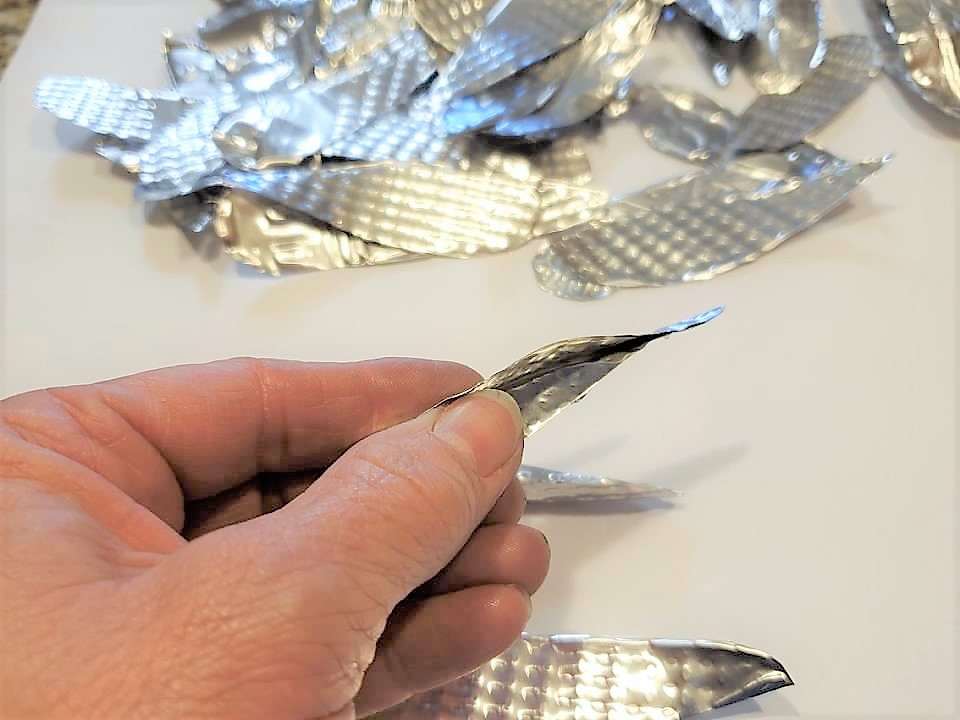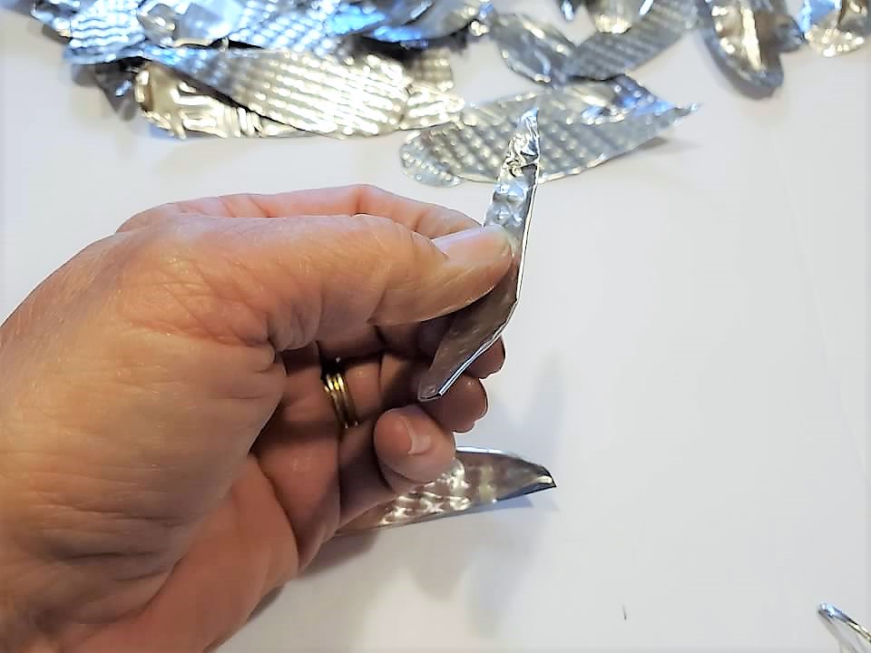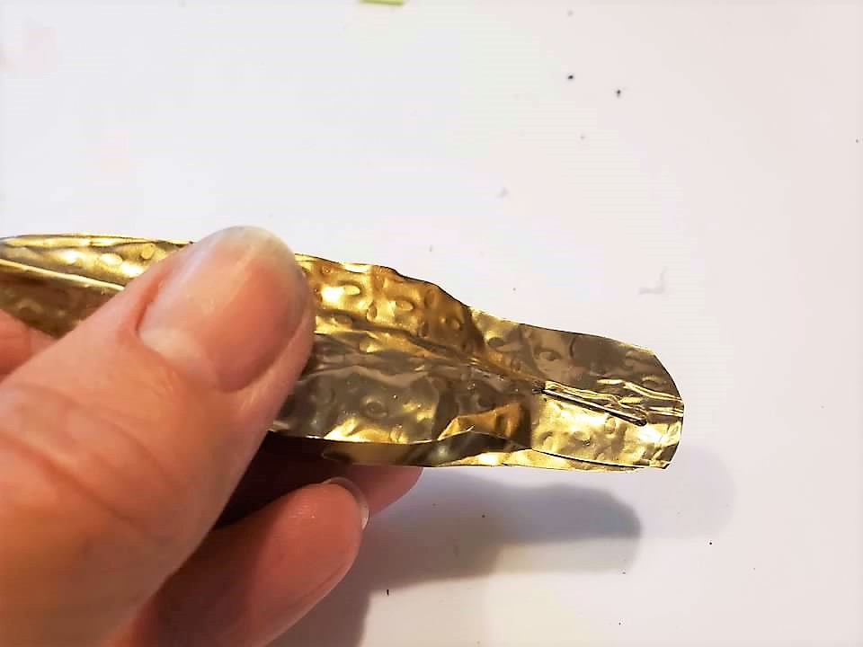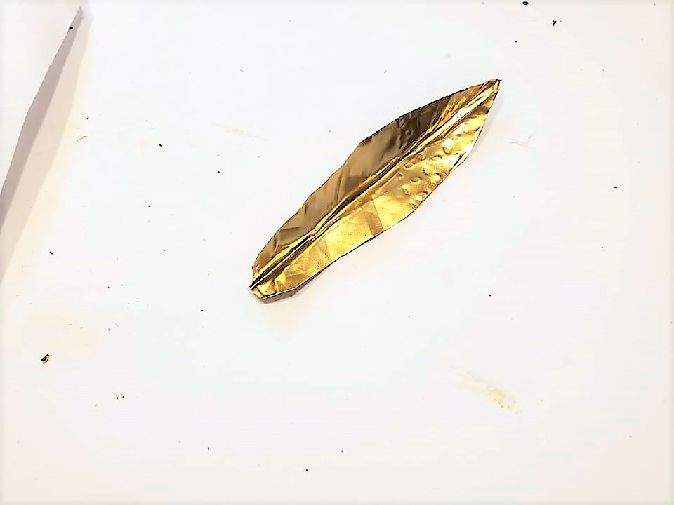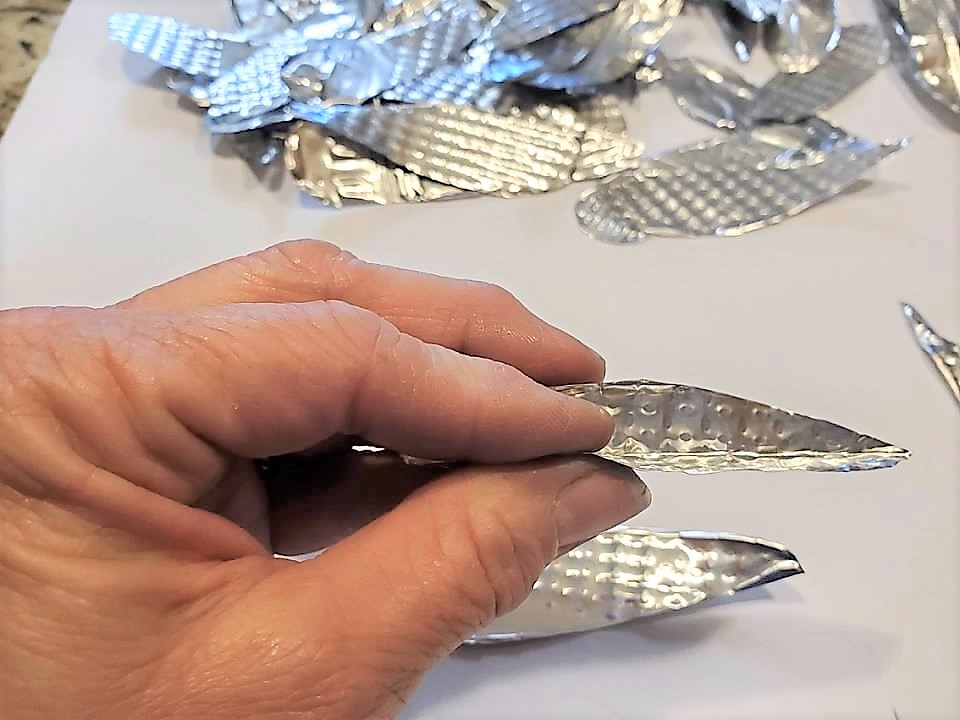 Making them look like metal leaves I took one leaf and folded it lengthwise in half. Flatten the leaf with my fingers and then unfolded it. Did this with all my leaves.