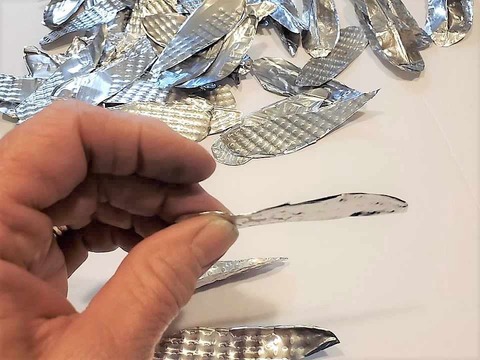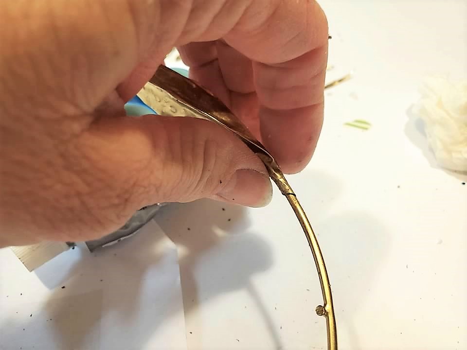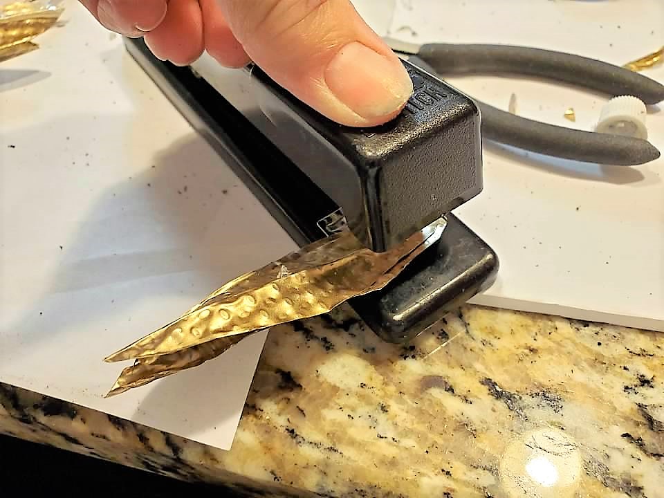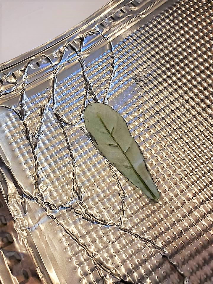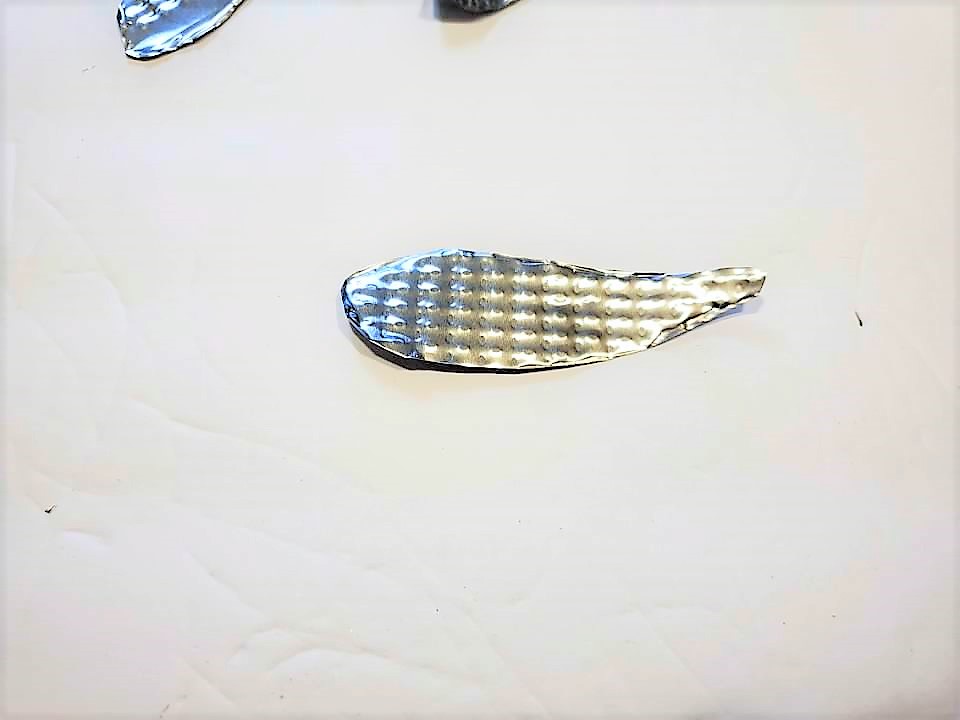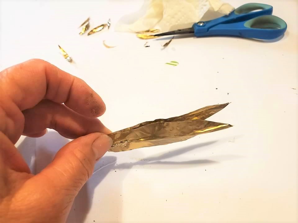 Making them look like metal leaves I took one leaf and folded it lengthwise in half. Flatten the leaf with my fingers and then unfolded it. Did this with all my leaves.
