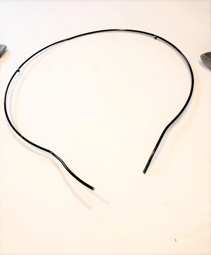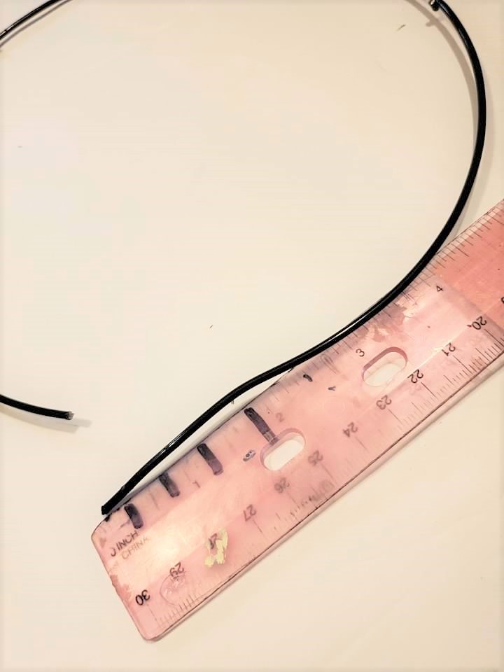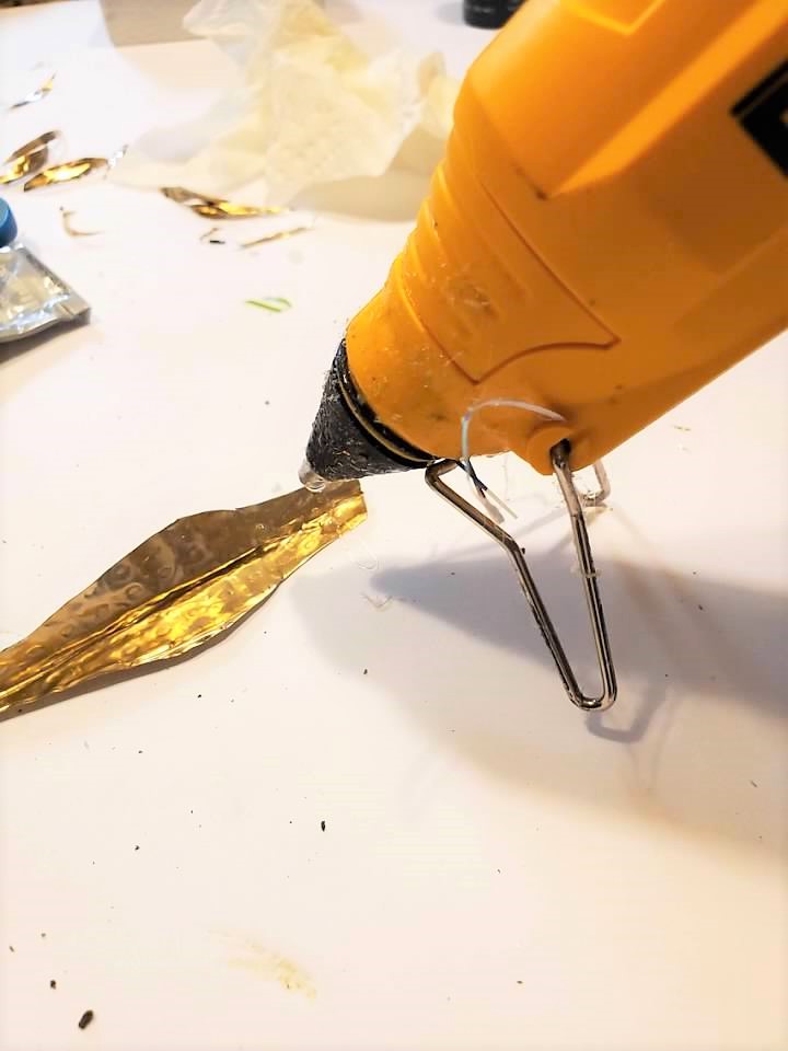Here is another part I had to rack my brain with. The obvious thing to use for the wreath part was one of the Dollar Tree’s mini wreath forms. I cut the outer ring off the form and used for the wreath. I sniped it to create an opening. I bent the ends outward about 2 inches.