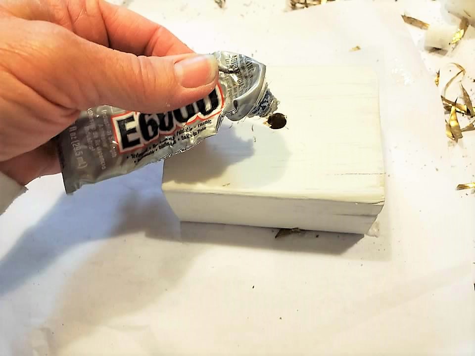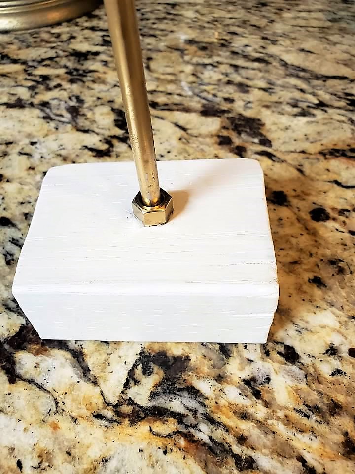 I gave the whole thing one more coat of gold spray paint. On the inspirational wreath it has a little metal ring on top of the base. I looked through all my stash and found a large nut that will allow the antenna to fit into nicely. I placed the nut onto the stand, applied E6000 inside the drilled hole. I placed the stem into the drilled hole and glued the nut to the base.