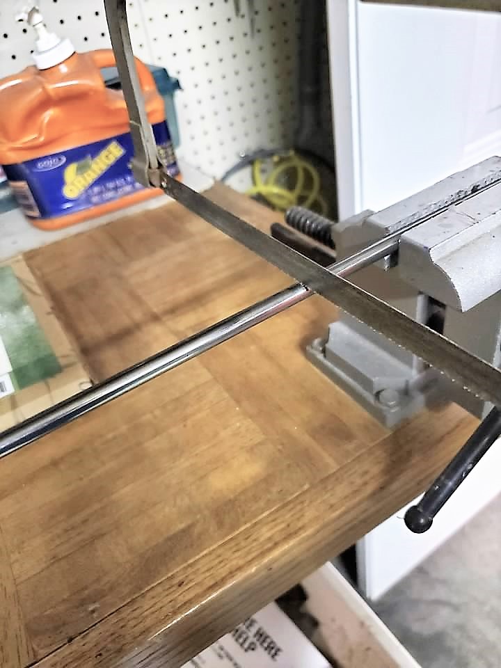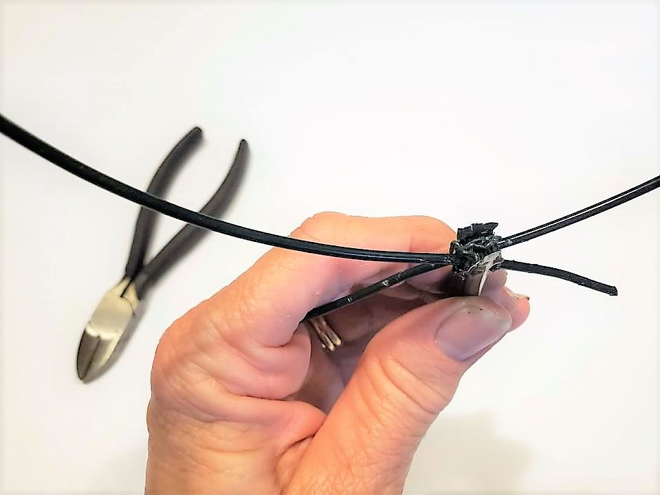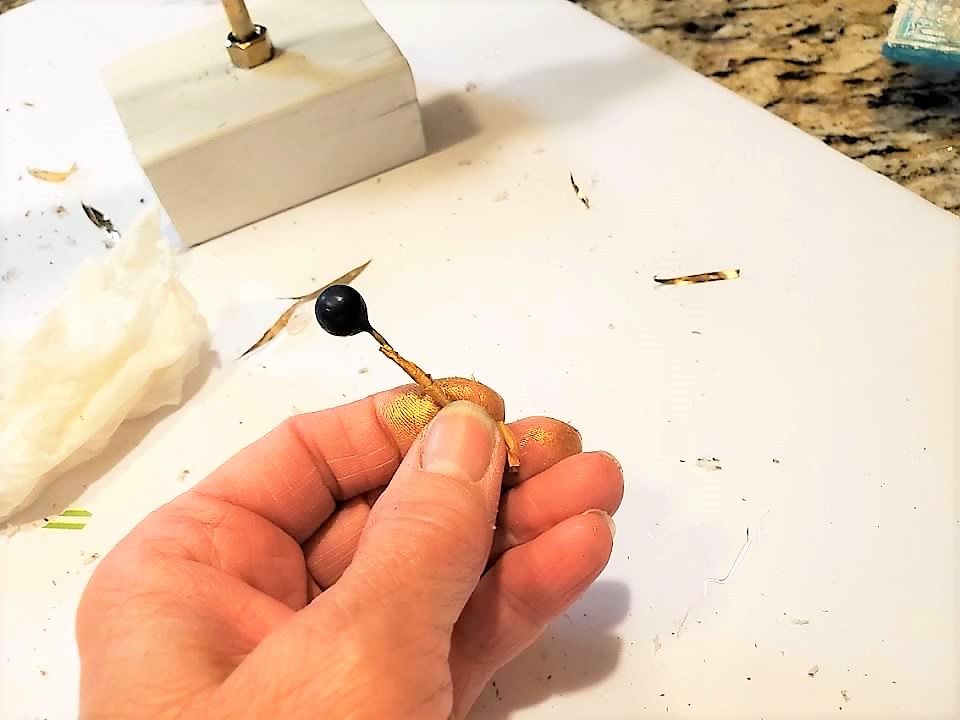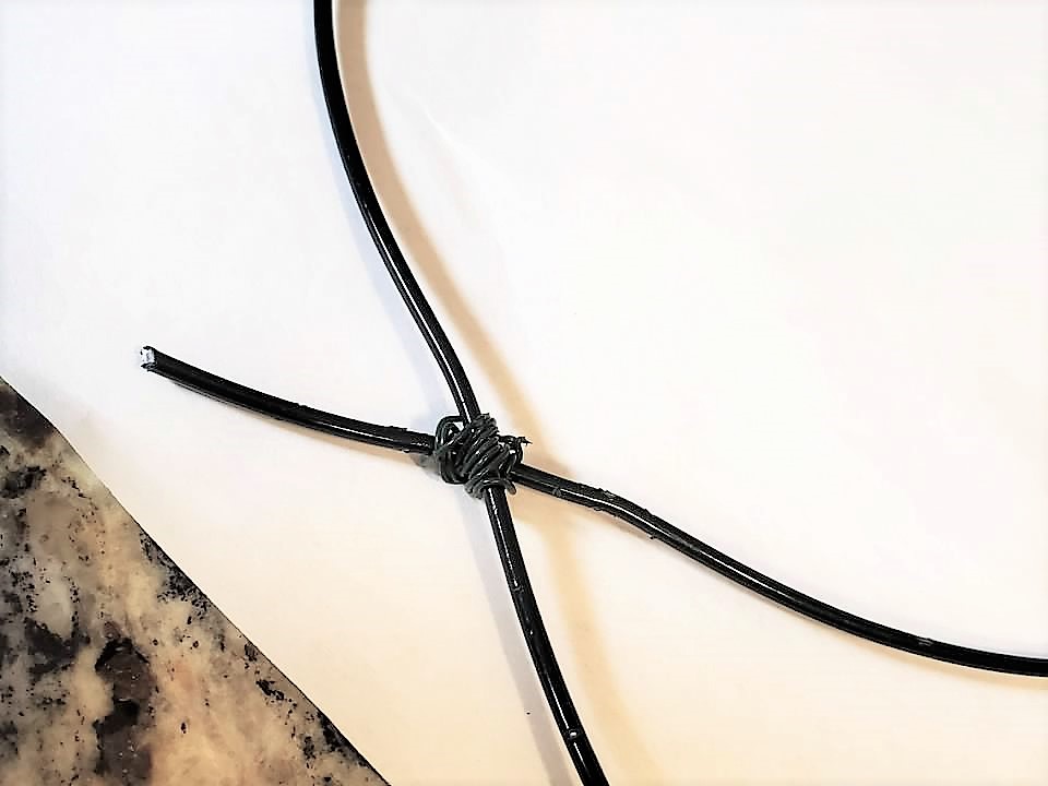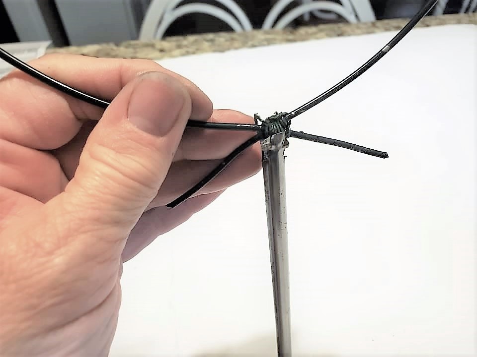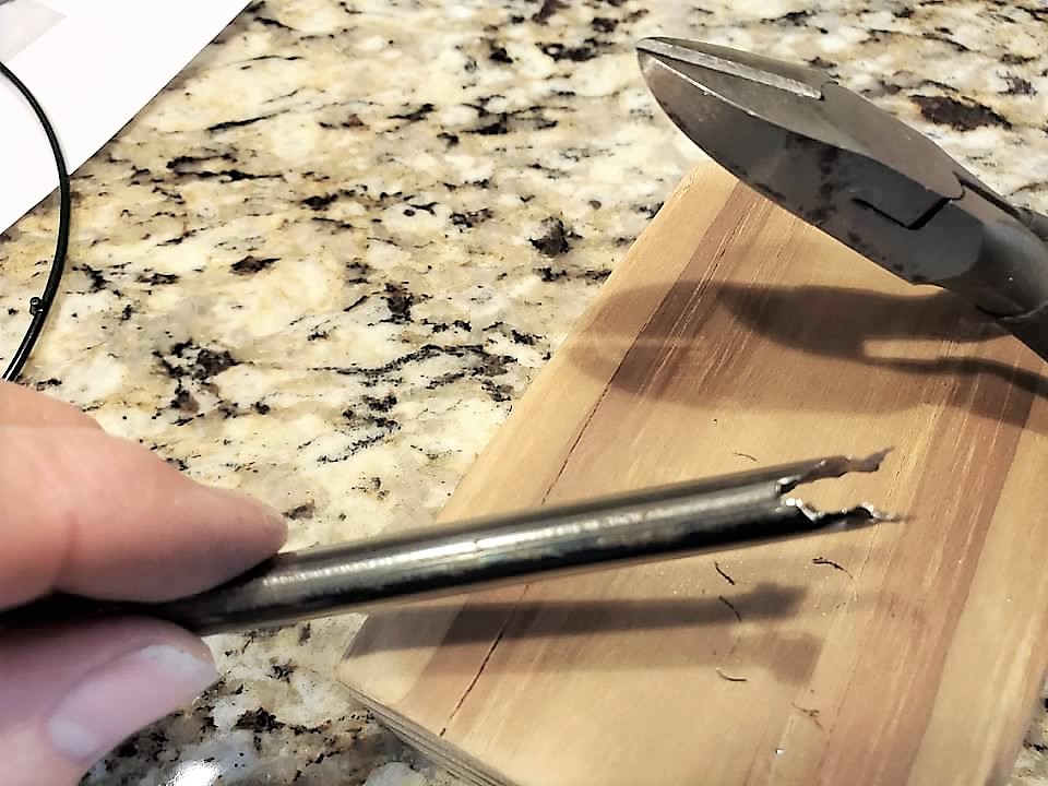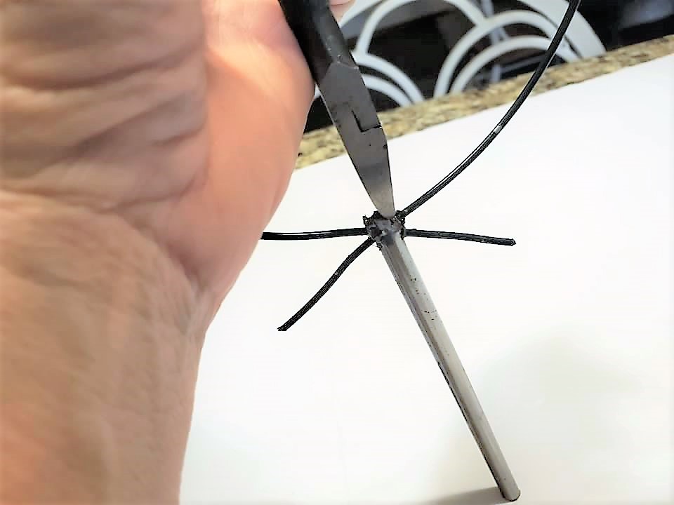 I was going to use a very thin dowel rod but that wouldn’t hide the wire. I looked in my craft drawer for a piece of radio antenna I saw when organizing my craft supplies. I know I have just about everything you can imagine. Seriously! I cut it to 9 inches by cutting it with a hacksaw. Worked perfectly. I made a notch at the top and trimmed it to the depth so the floral wire knot would slip right into.