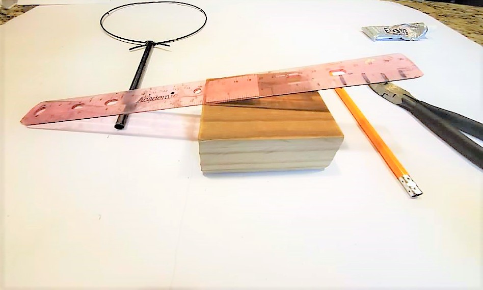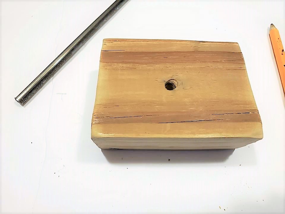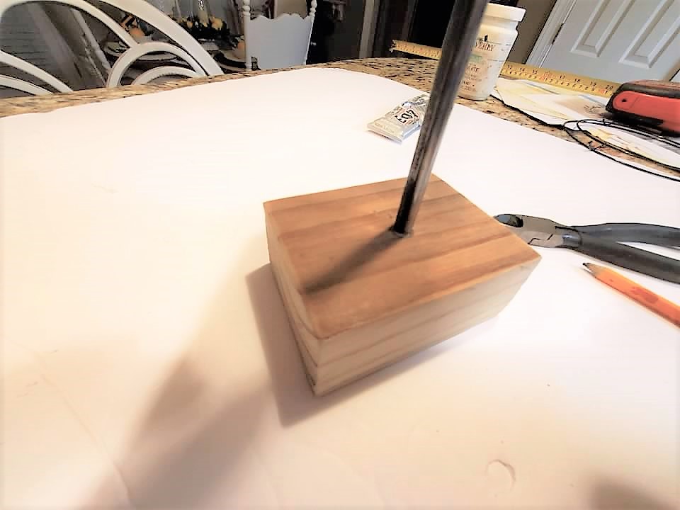 This was the easiest part to find. I used a piece of scrap wood and cut it 4″ x 3″. Found the center and drilled a hole a little smaller than the antenna. Fits snug. I am going to paint the wreath stand and base first before putting it all together.
