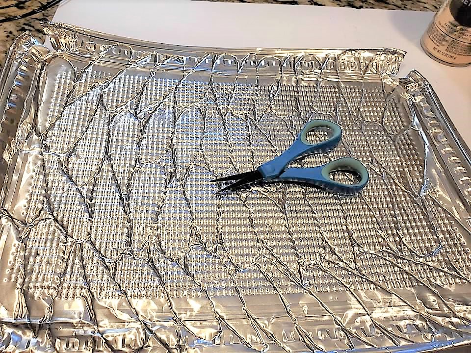 Finding something sturdy for the leaves was tricky. I wanted something that will keep it’s shape and to hold up. I don’t have anything I can cut metal so that’s out. I saw someone use a Dollar Tree foil baking sheets in one of their crafts which gave me an idea on what I can use for the leaves. I can cut the leaves out with scissors. The baking sheets comes in a set of two for $1. I used half of one sheet for my DIY Dollar Tree Wash board so I only have 1 1/2 sheets left. That should be enough.