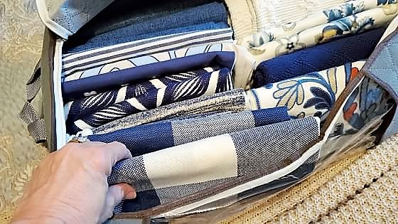 Now the organizing and purging begins. I organized my covers by color and seasons, placing them in their own group, folding and placing them neatly in the organizer.