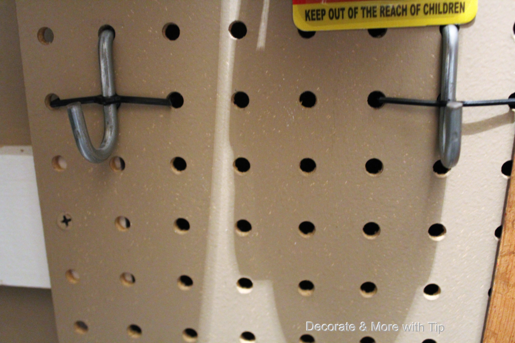 I purchased a 2′ x 4′ piece of peg board at Lowe’s.  To bring it off the wall for the hooks to set in I purchased two 1″ x 2″ and cut to size.  I attached them to the wall where the studs were.  Then just attached the peg board on the 1 x 2s.