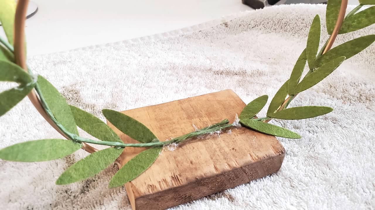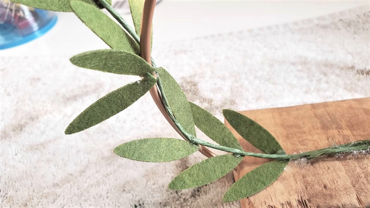 I took the two felt leaves and glued them to the base with hot glue, wrapping around the hoop.