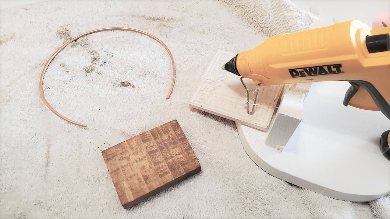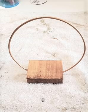 To attach the hoop to the board I took a drop of hot glue to each drilled hole and placed the ends of the hoop into the glued hole.