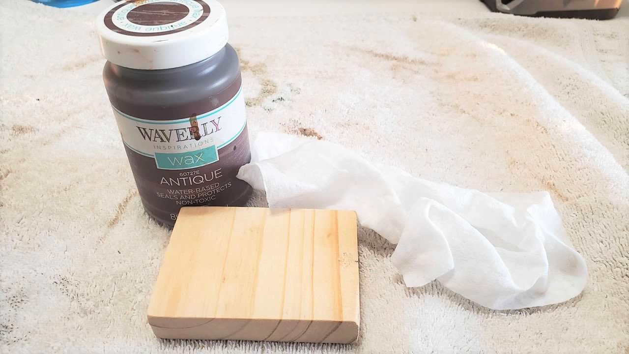 After I drilled the holes I took Waverly antique wax and stained the piece of wood.