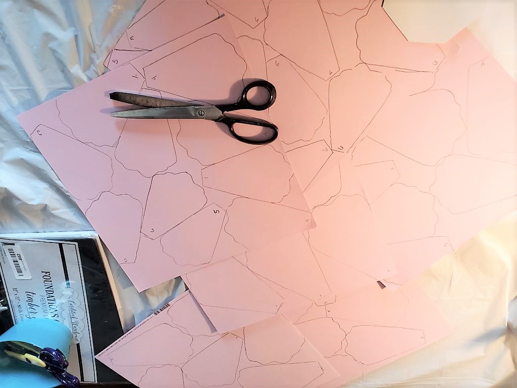 I traced all the patterns out on the scrapbook paper and cut then all out. There are 6 patterns cutting 8 pieces per pattern besides the last one you will cut 12. You will also want to make an octagon base. I just made a 6 inch square and cut the corners off.