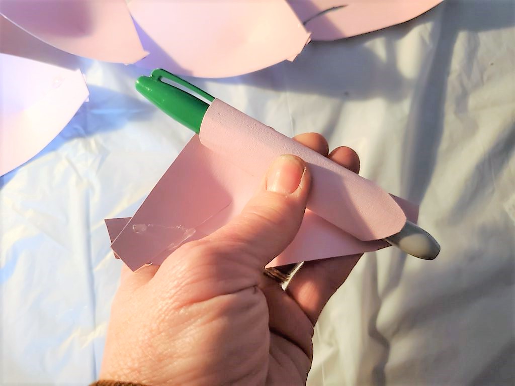 Add a line of hot glue to one edge of the cut and place the unglued side on top of the hot glue line. Take something to roll the petal top edge, roll 1/4 down the petal. This gives the petal a shape.