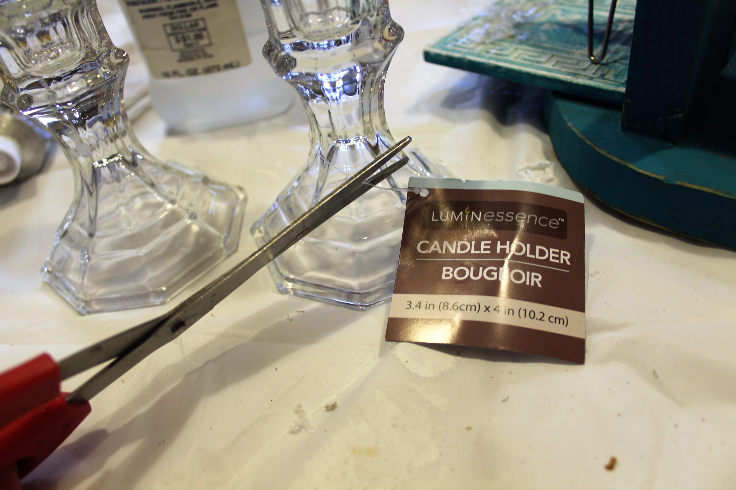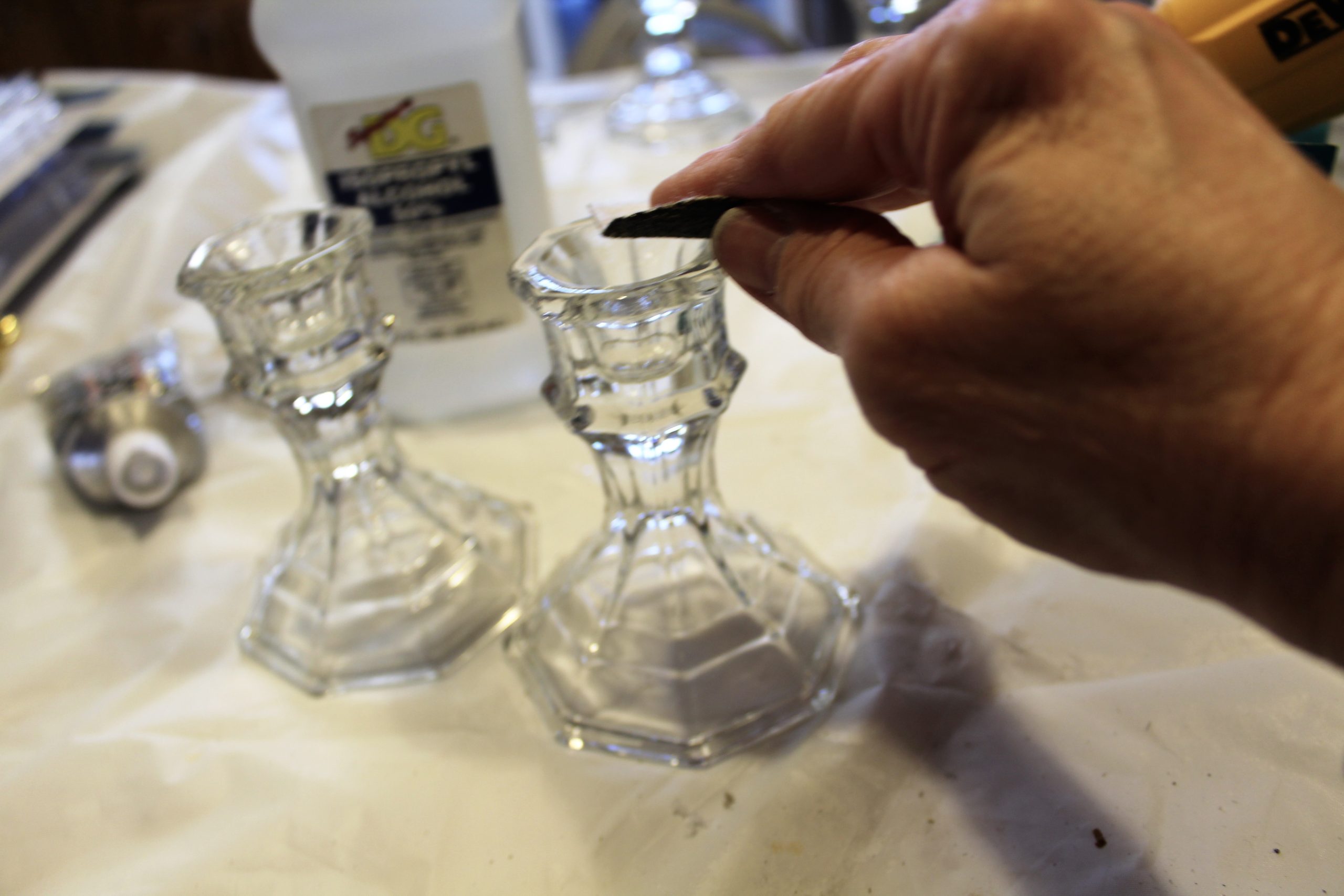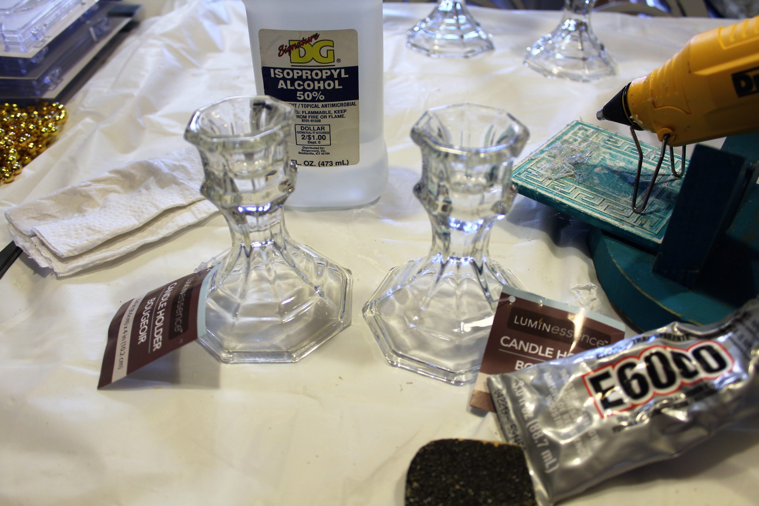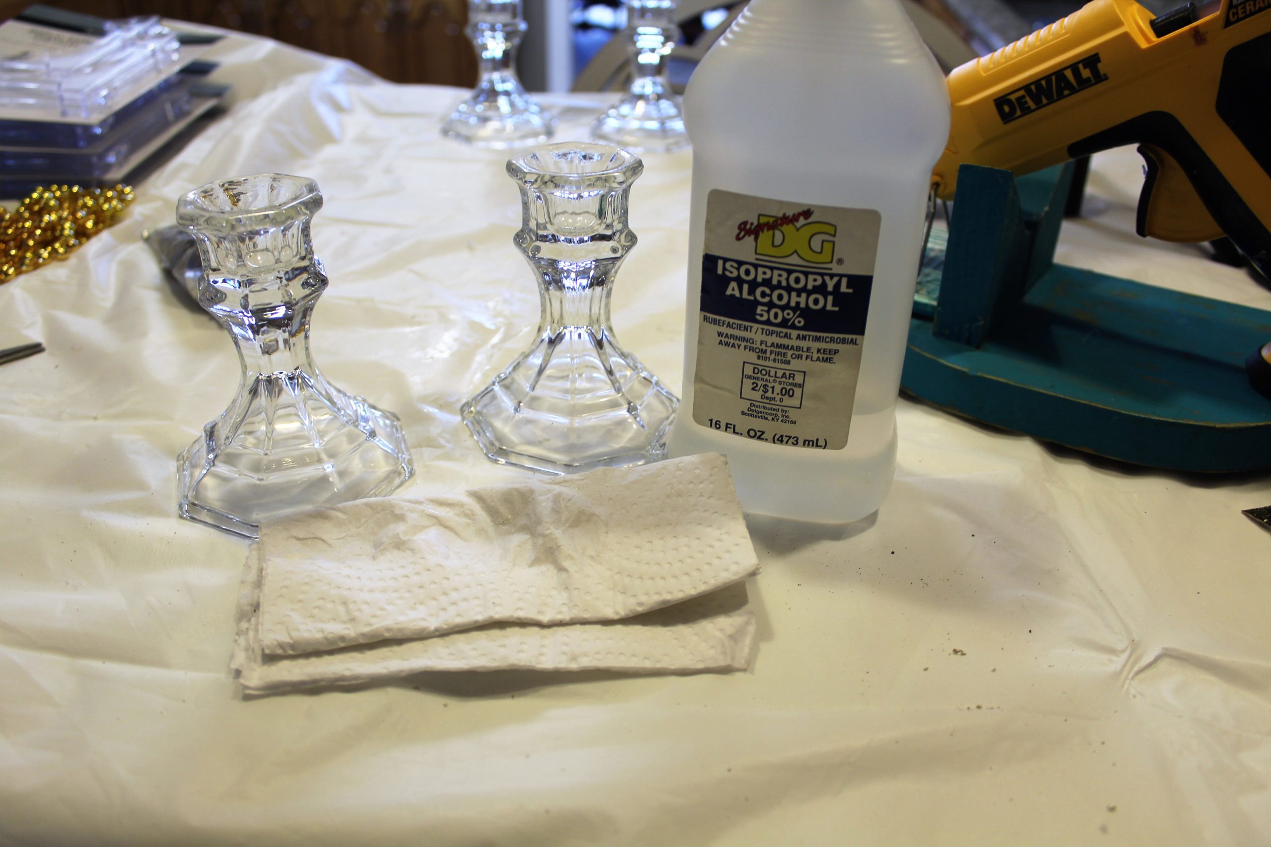 Take your candle holders and remove the tag. Use sandpaper gently sand the top of the candle holder. Take a paper towel and alcohol and clean the sanded area.