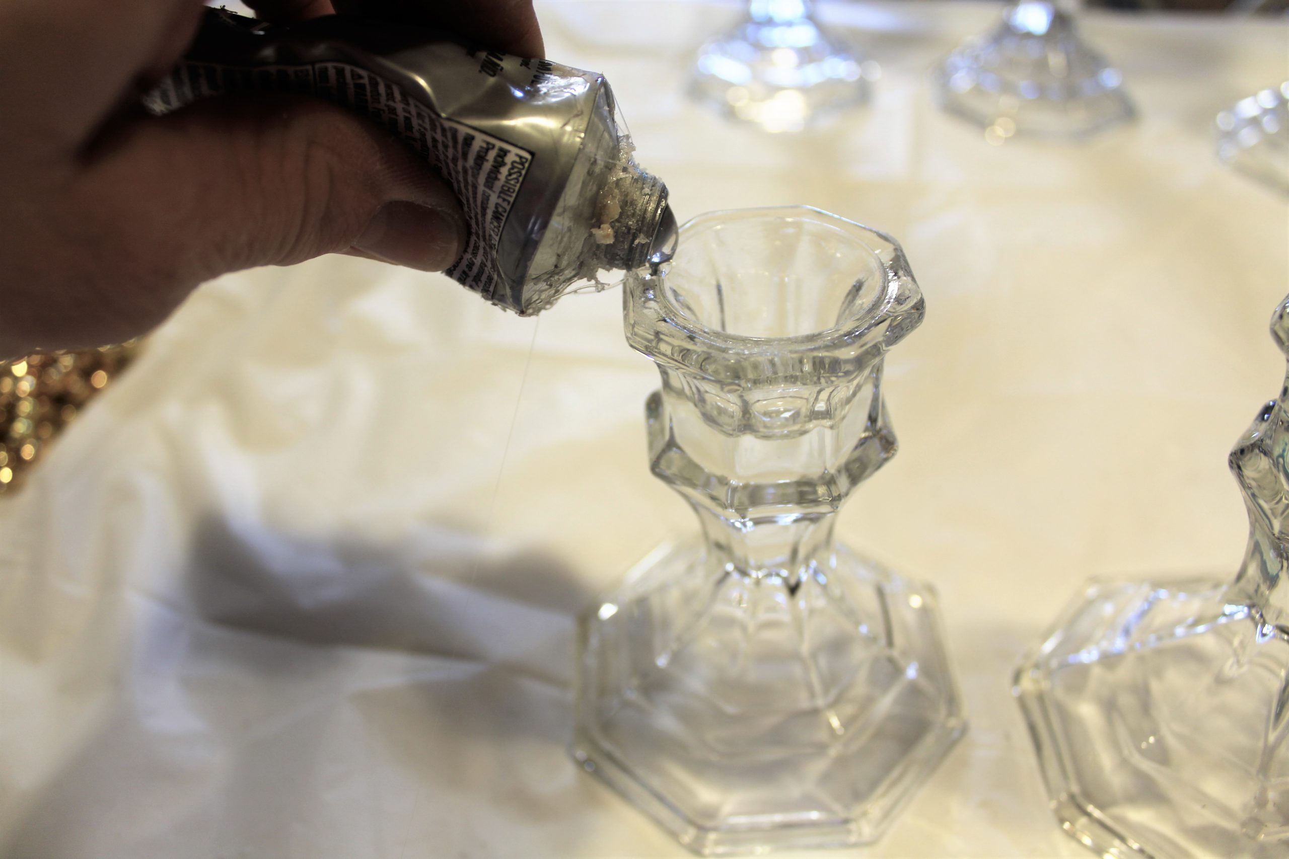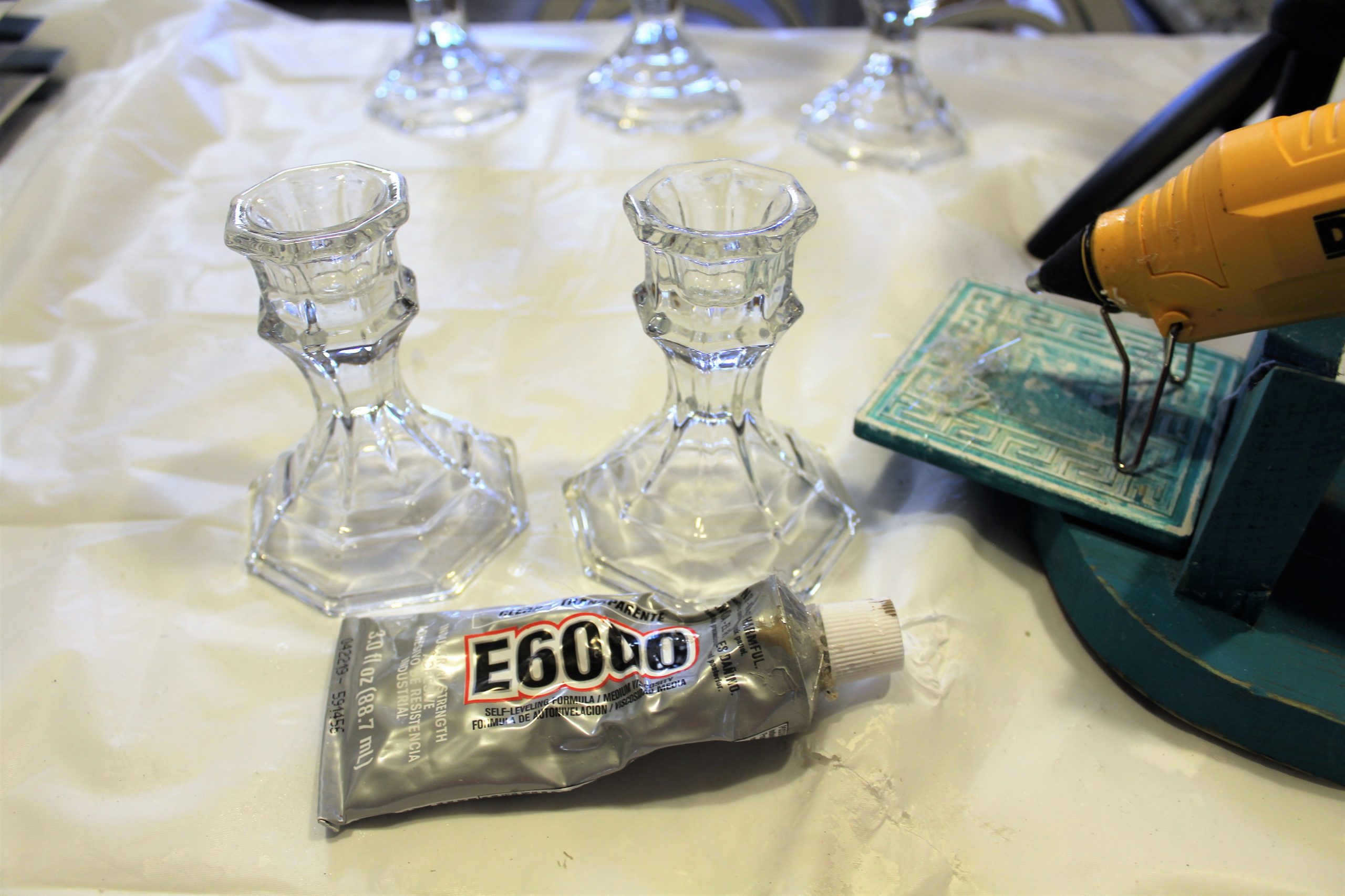 Apply E6000 to both candle holder’s top. Apply a touch of hot glue to the E6000 to help hold together until the E6000 dries.