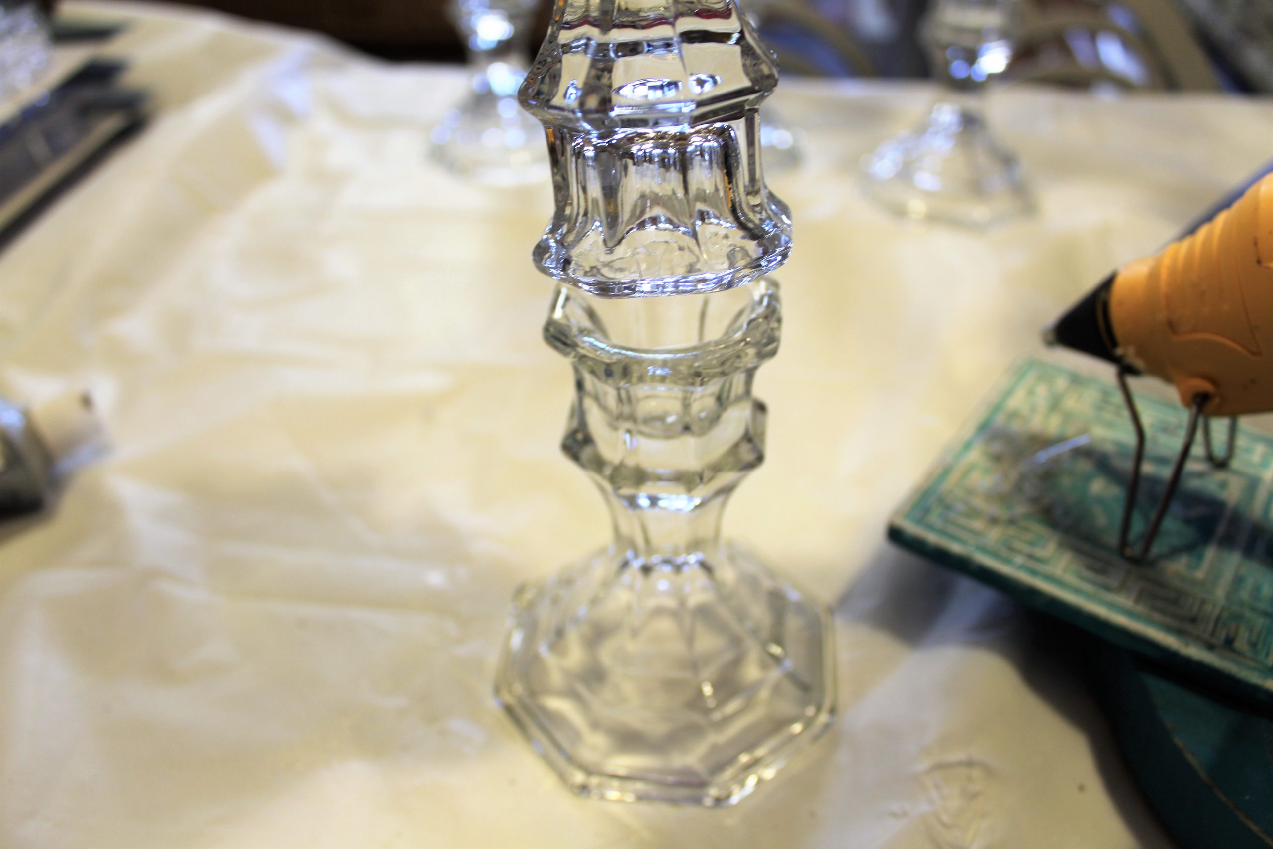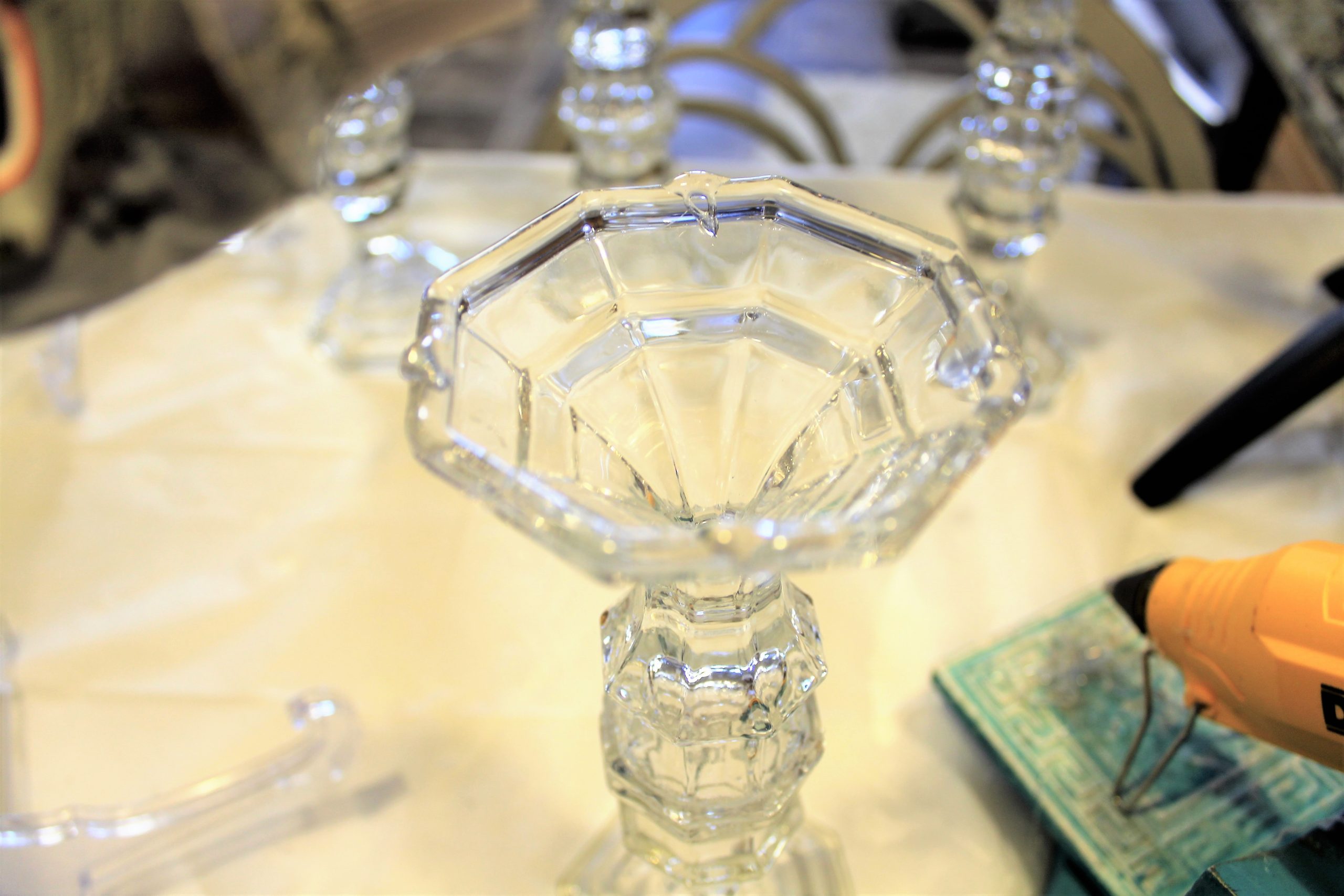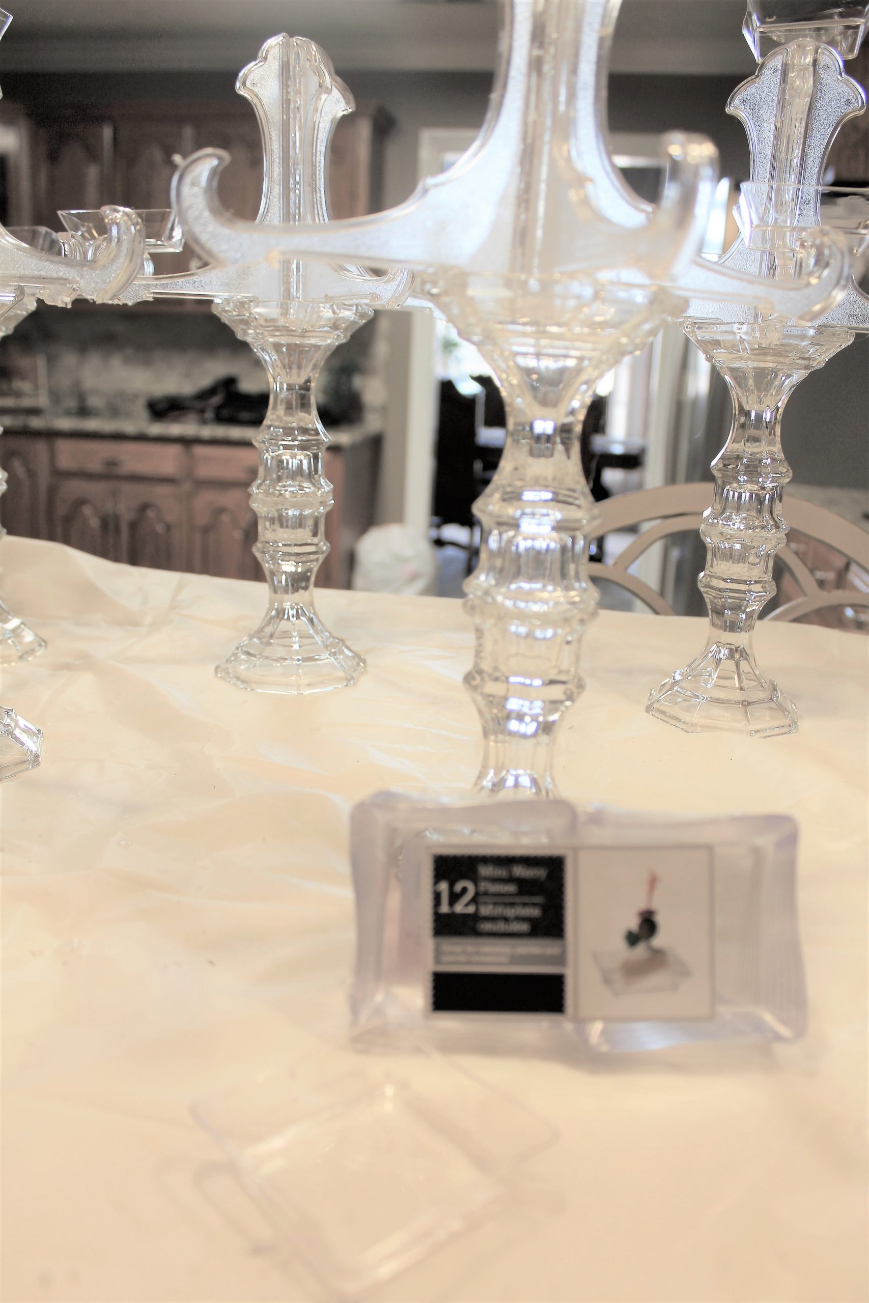 Adding a plate for candles to sit on. Taking the Dollar Tree clear mini plates, applying hot glue to each arm and place the mini plates.