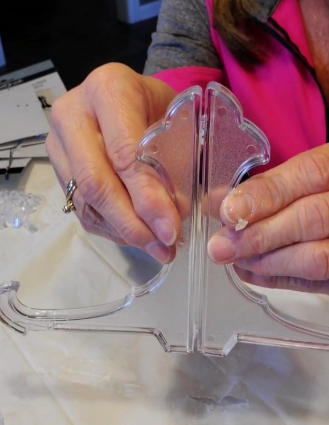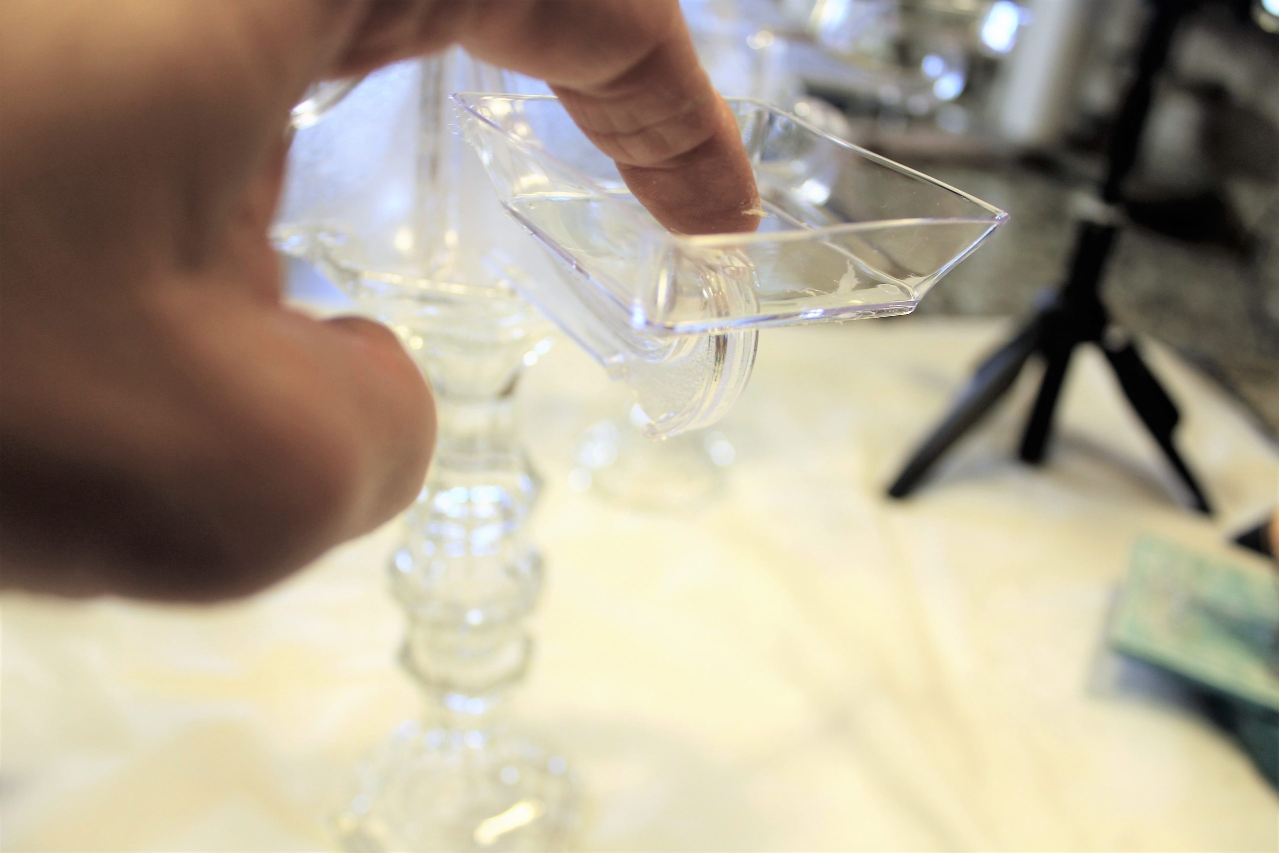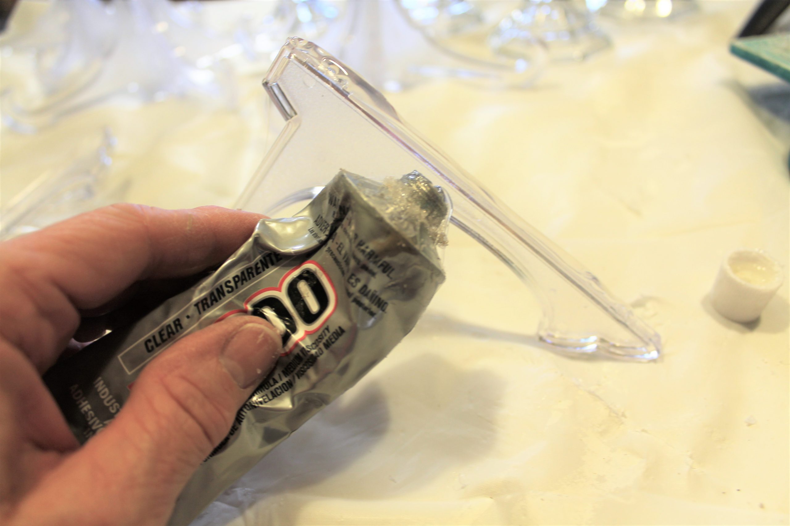 Adding a plate for candles to sit on. Taking the Dollar Tree clear mini plates, applying hot glue to each arm and place the mini plates.