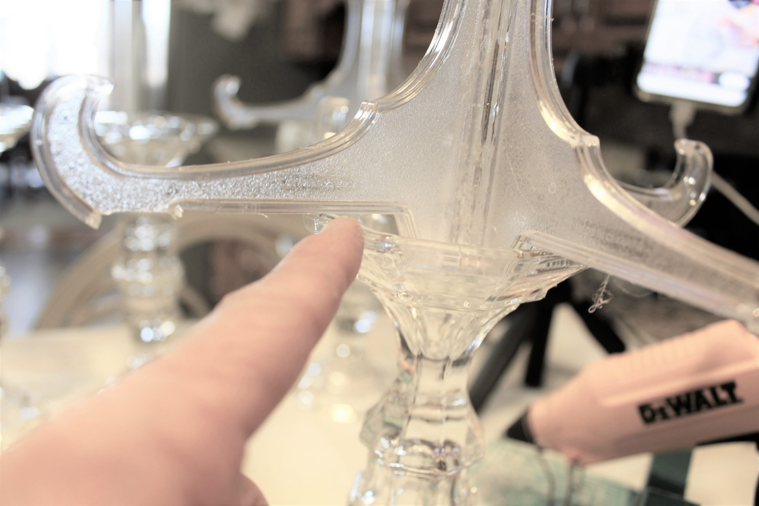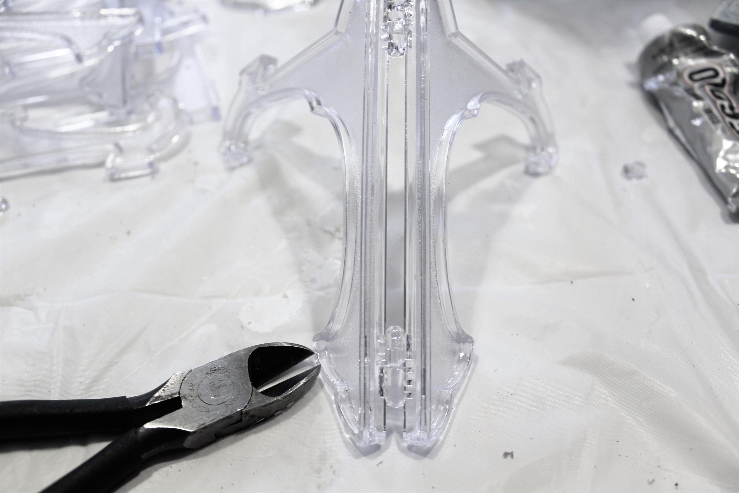 Take 4 sections and hot glue to the bottom inner part of the easel arm and to the outer part where we removed the foot.