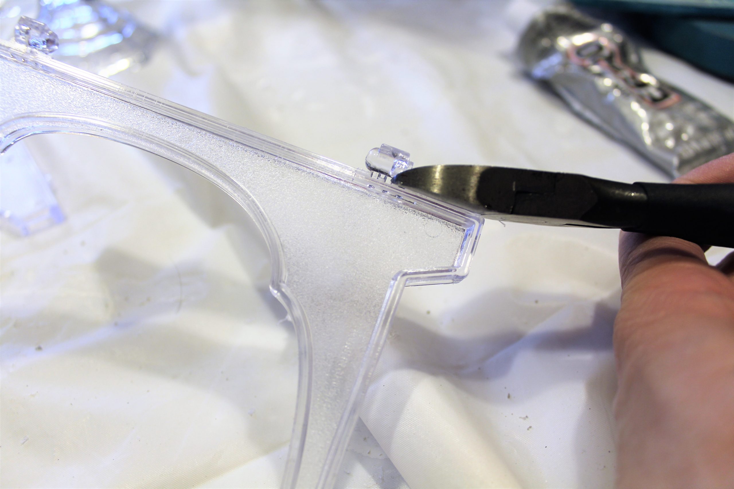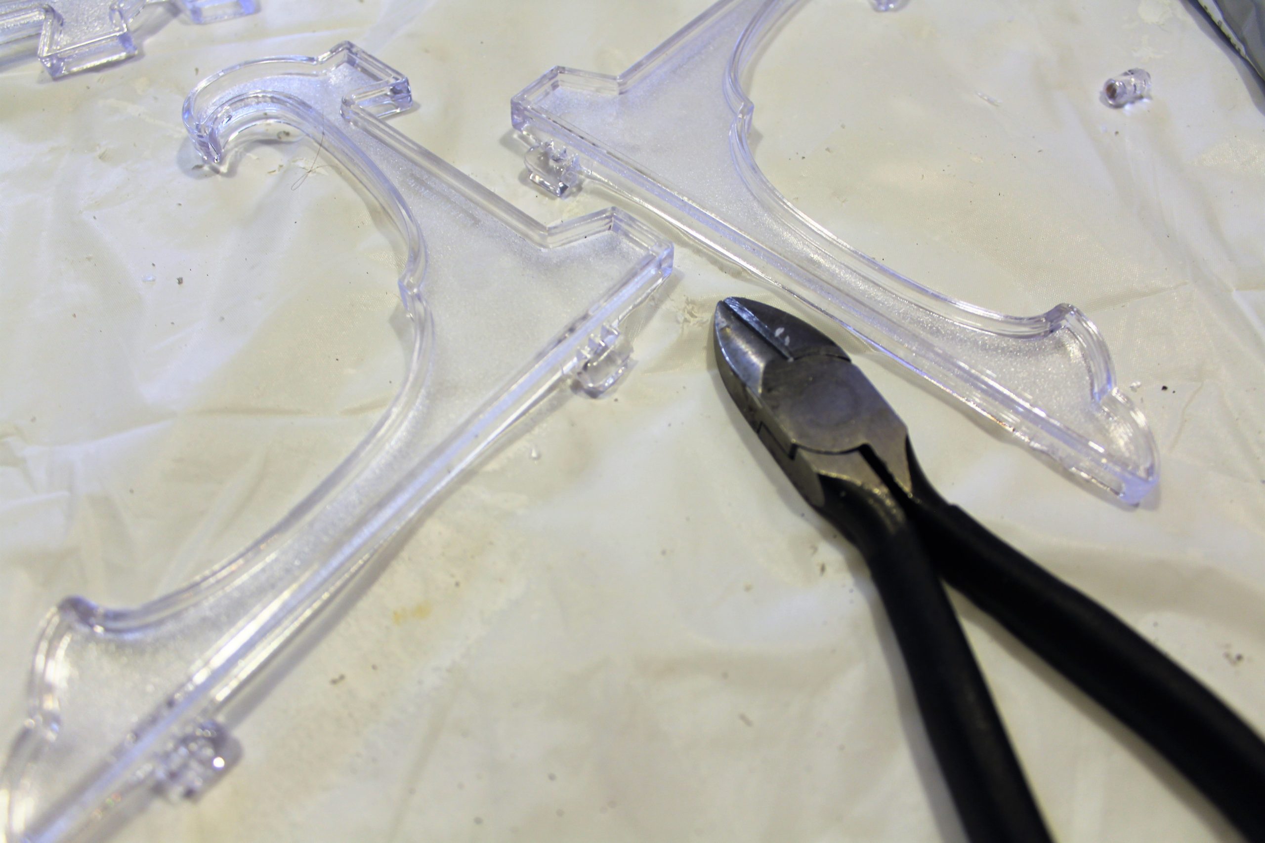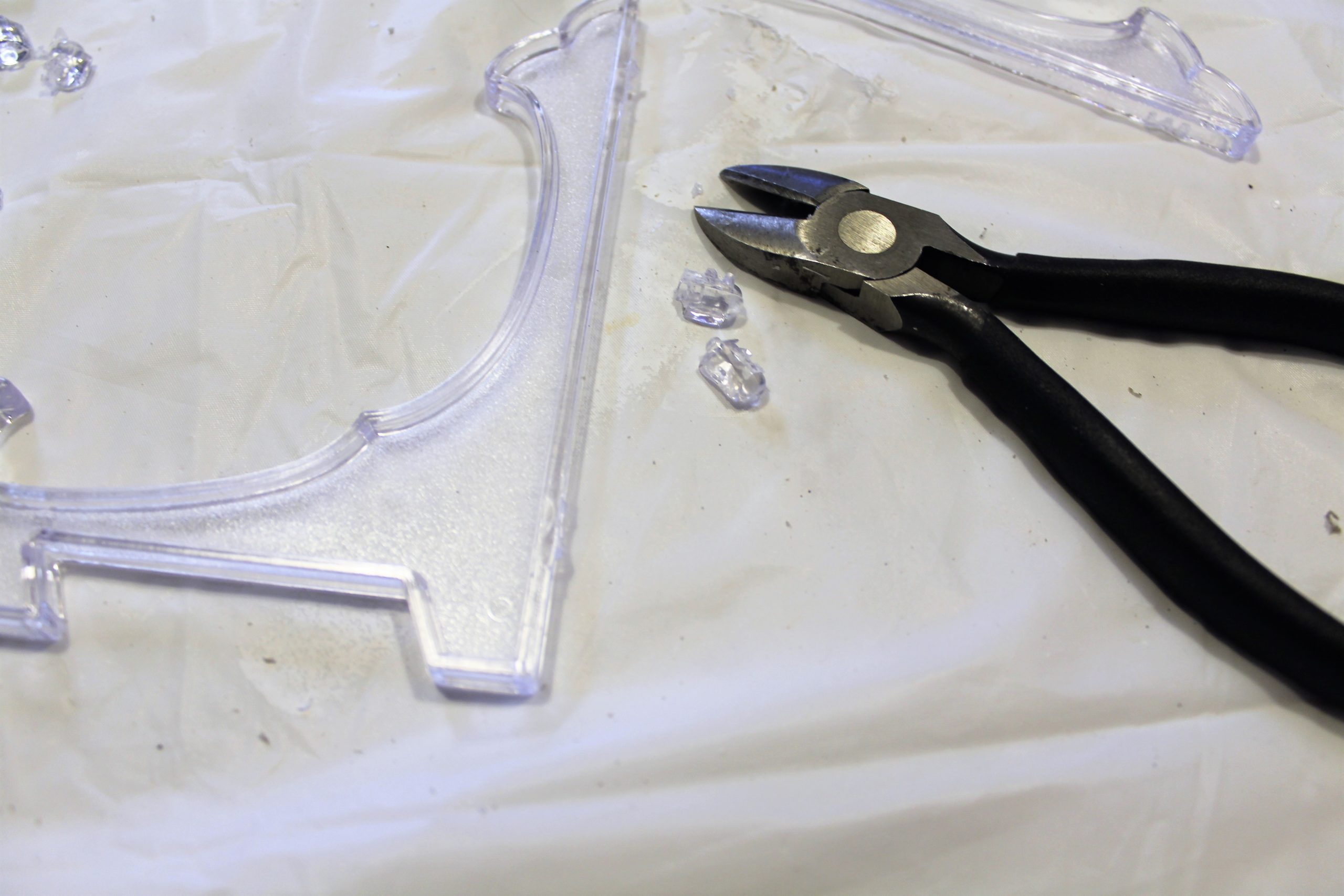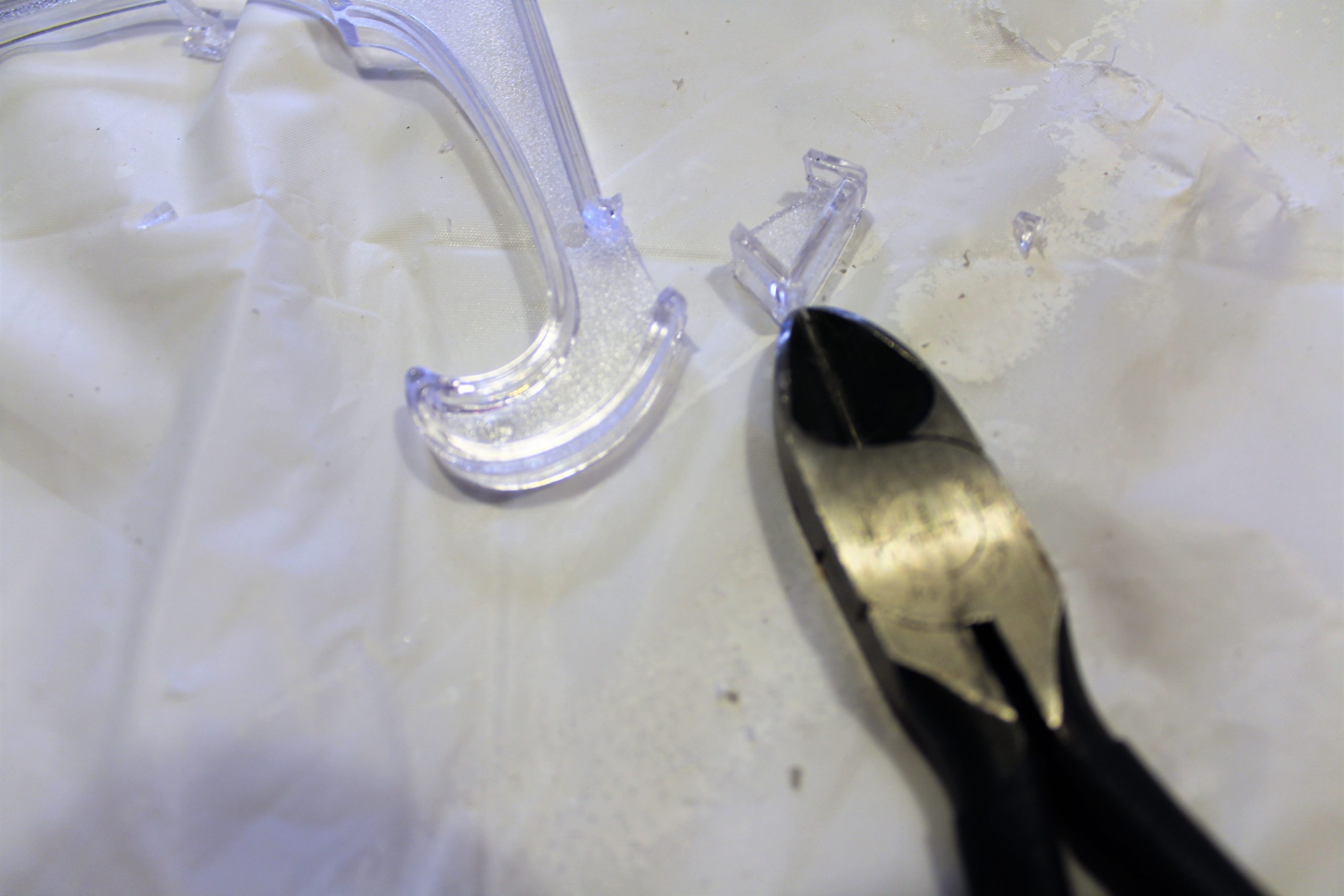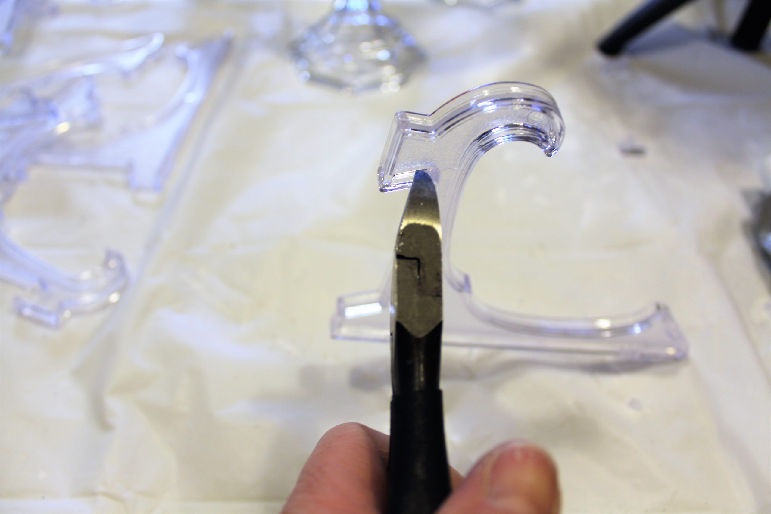 Still on the easel preparation. The easel has two little feet on the bottom. We will be removing the front foot. Taking your wire snips, place the tip on the little ledge trim of the foot with gentle pressure the front foot will break evenly on it’s own.