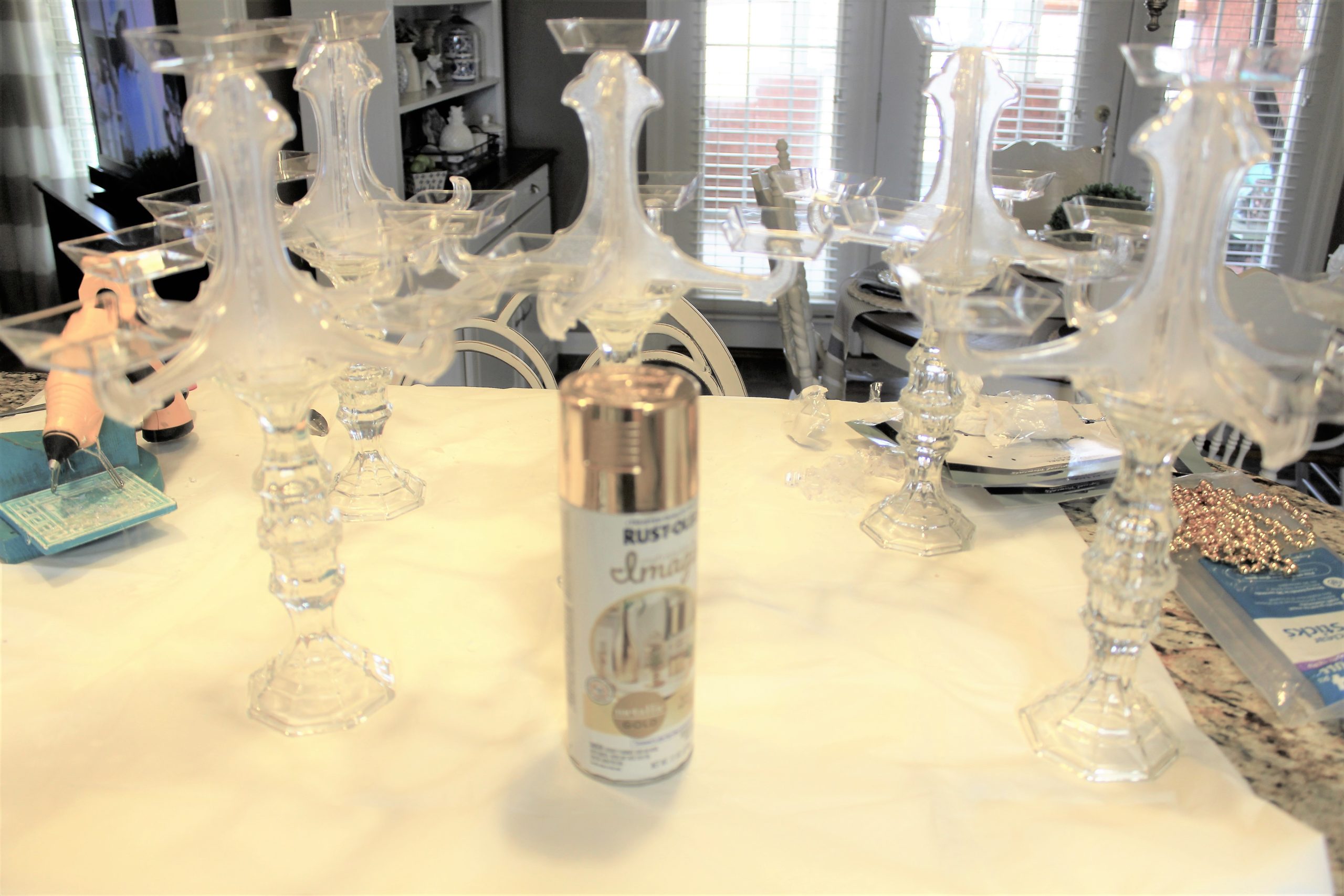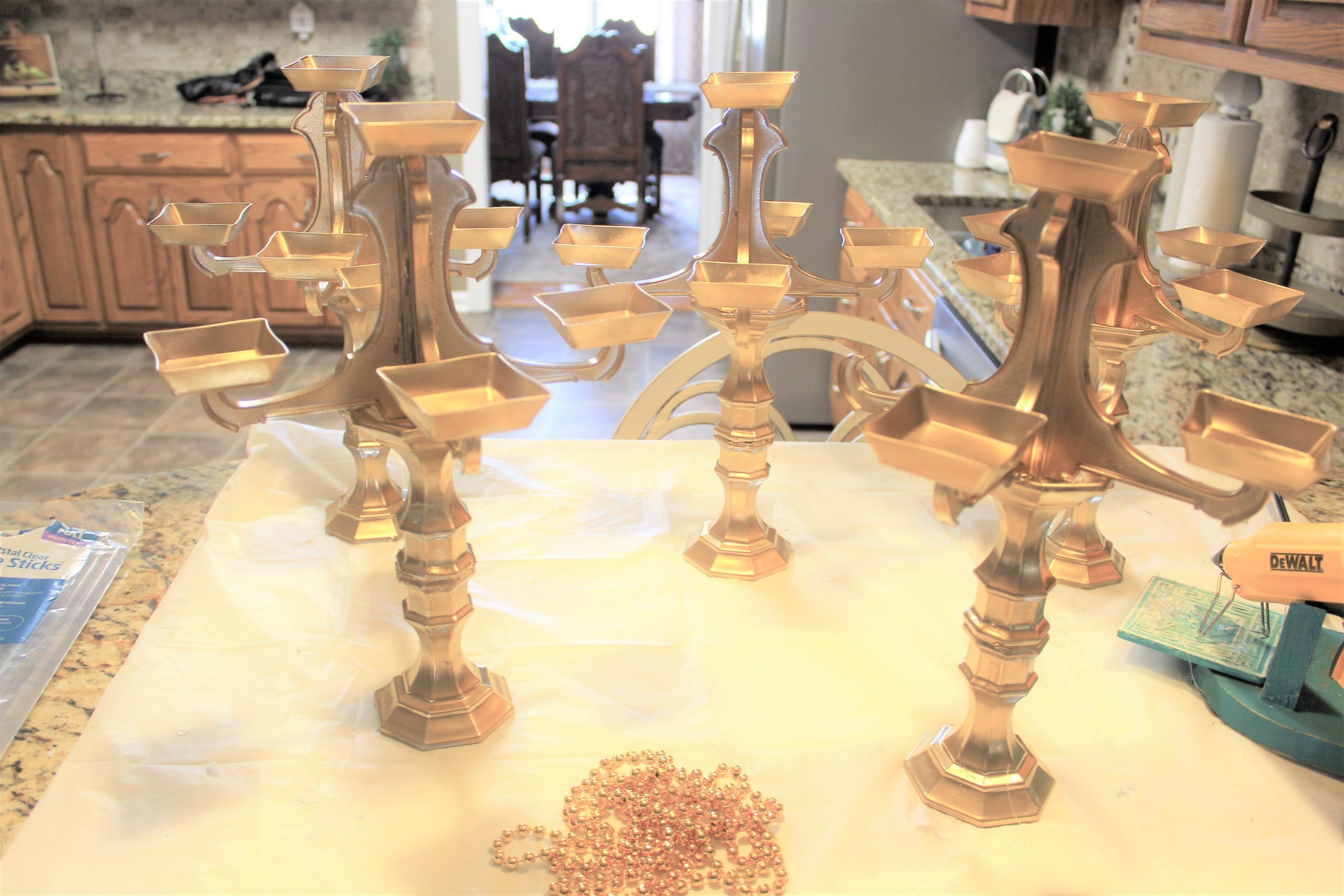 Spray paint the candelabra any color you want. I am spraying mine metallic gold.