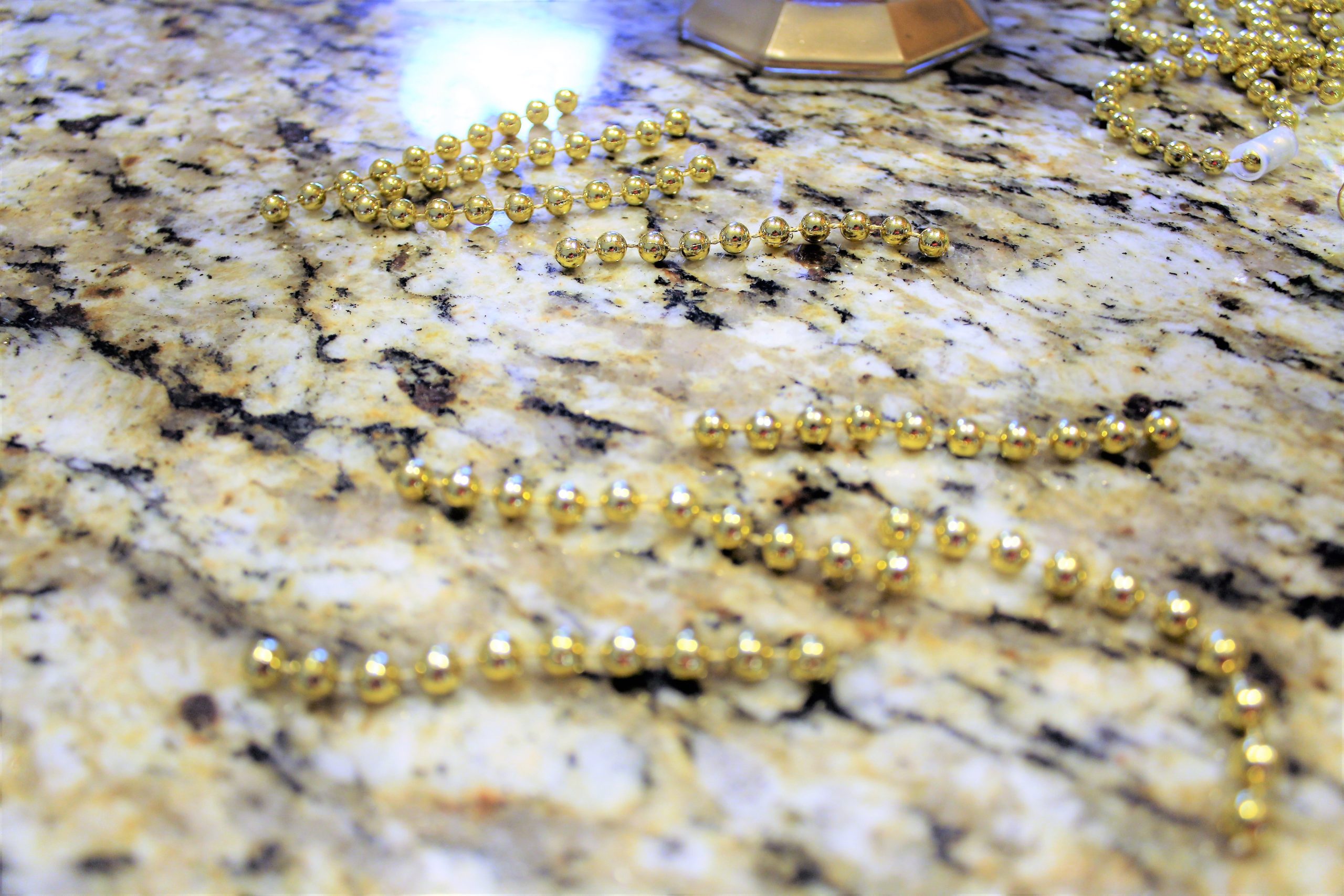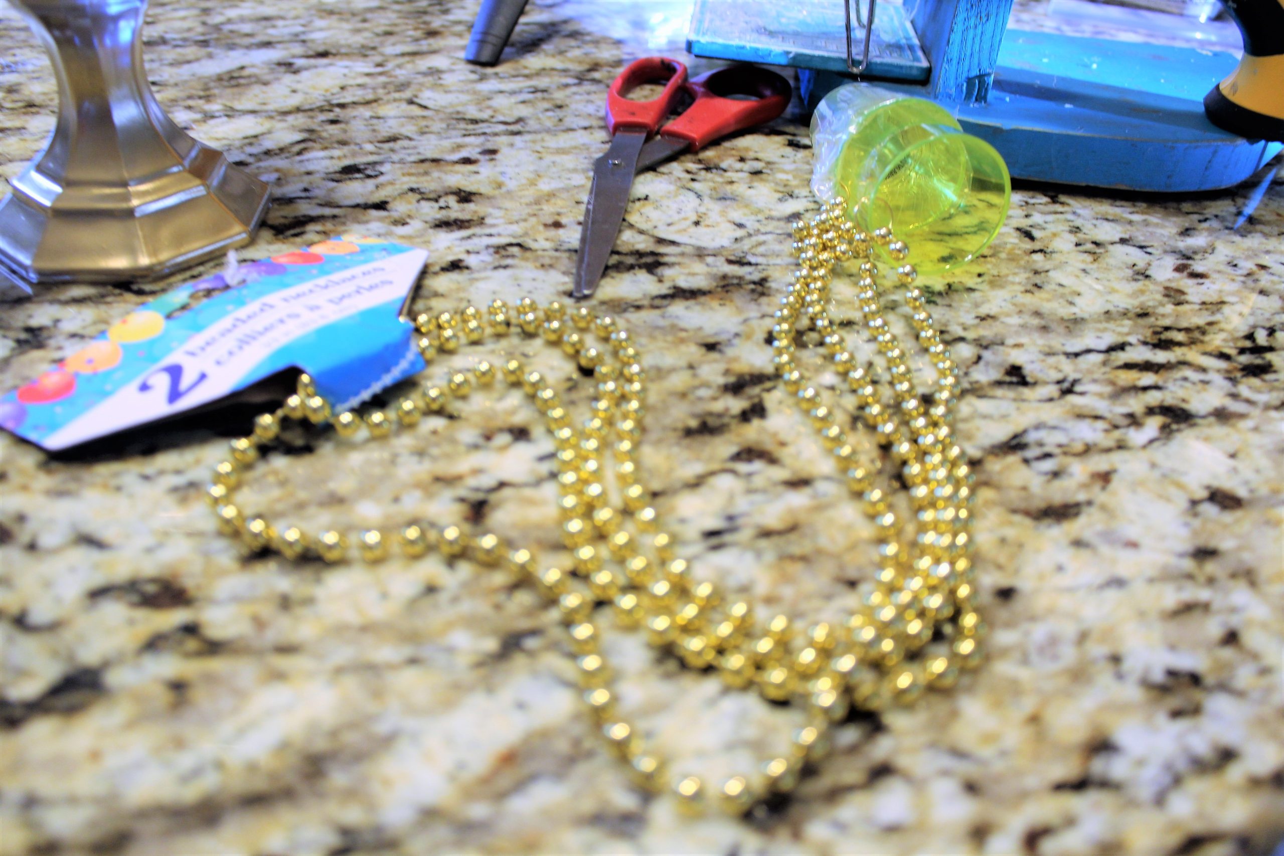 One gold Mari Gras necklaces is enough to decorate one candelabra. Cut your necklace in 10 bead sections.