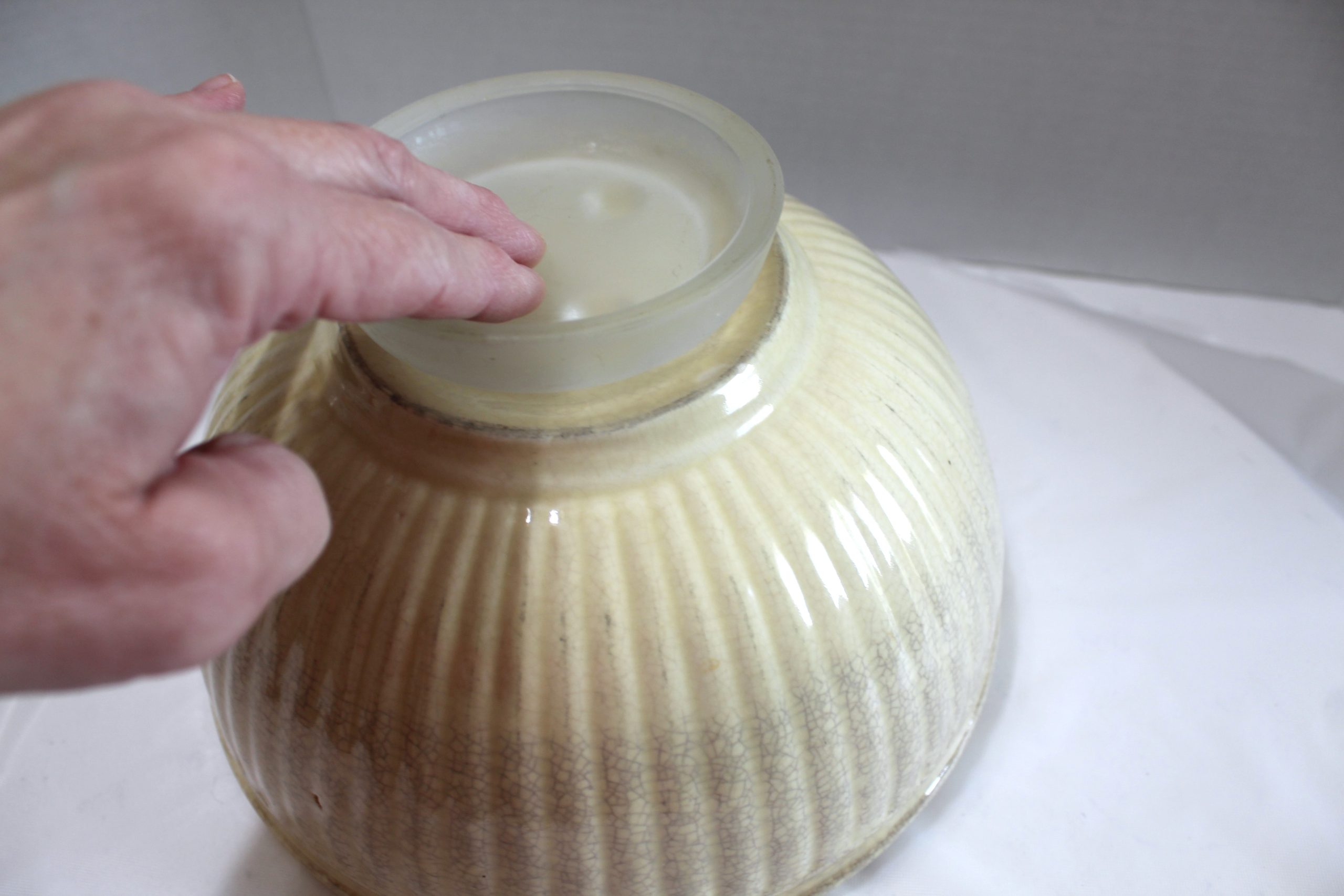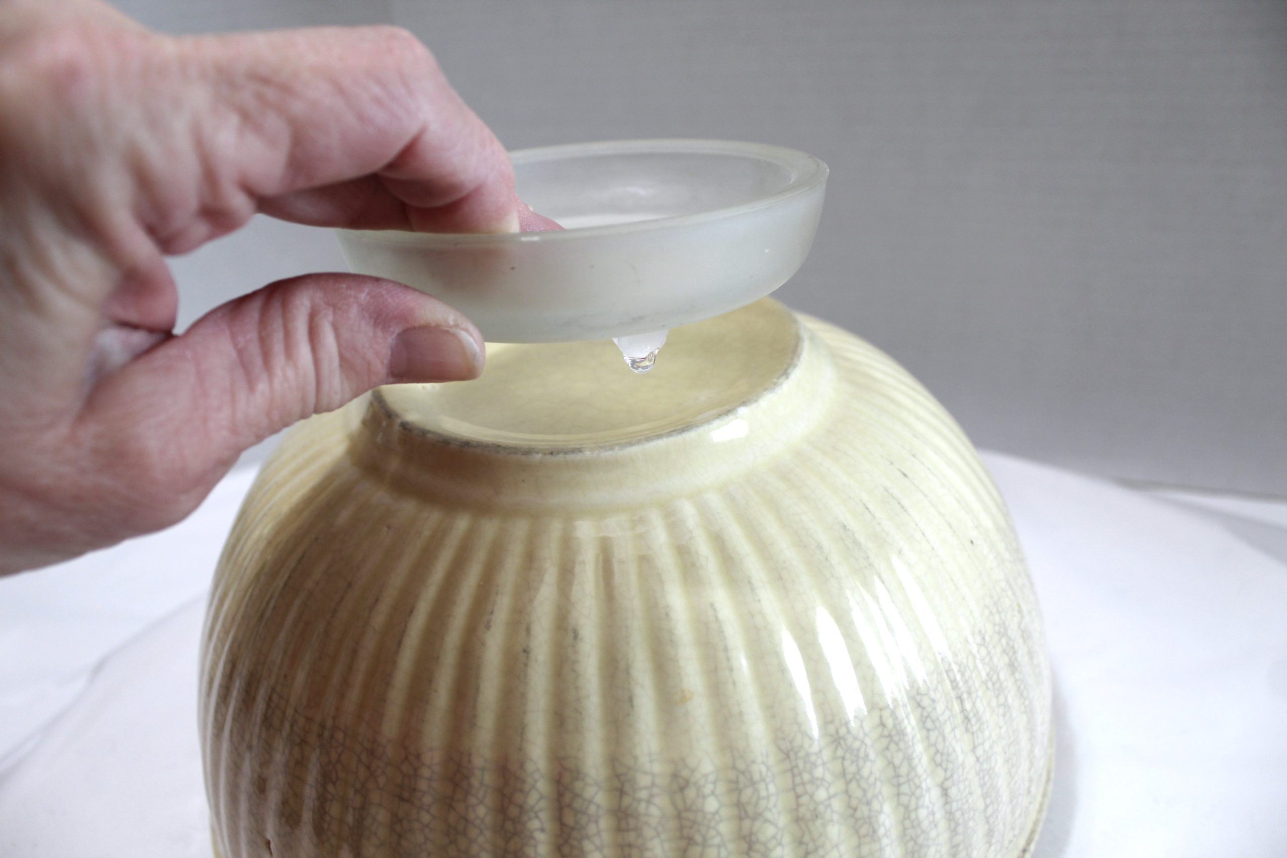 Placed it in the center of the bottom part of the bowl. I added something heavy into the bowl to keep both parts together until the glue takes hold.