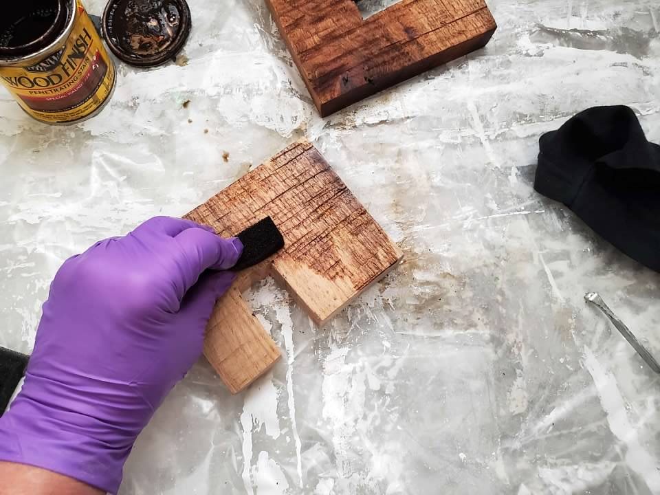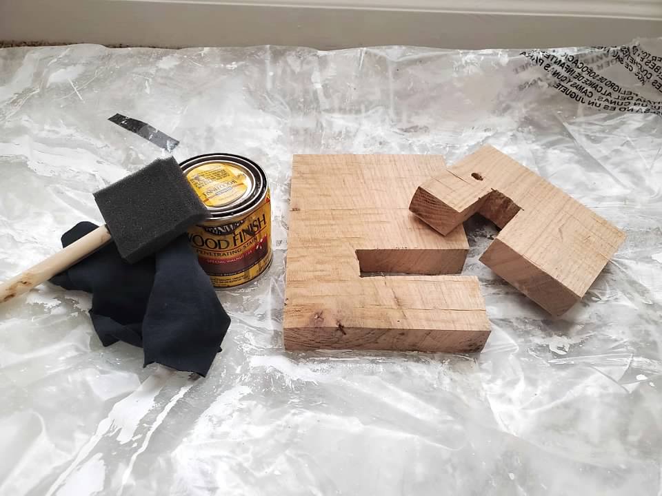 Clean the two boards with a damp cloth. I stained my pieces with Minwax English Chestnut and then used my Minwax finishing wax to seal the stain.