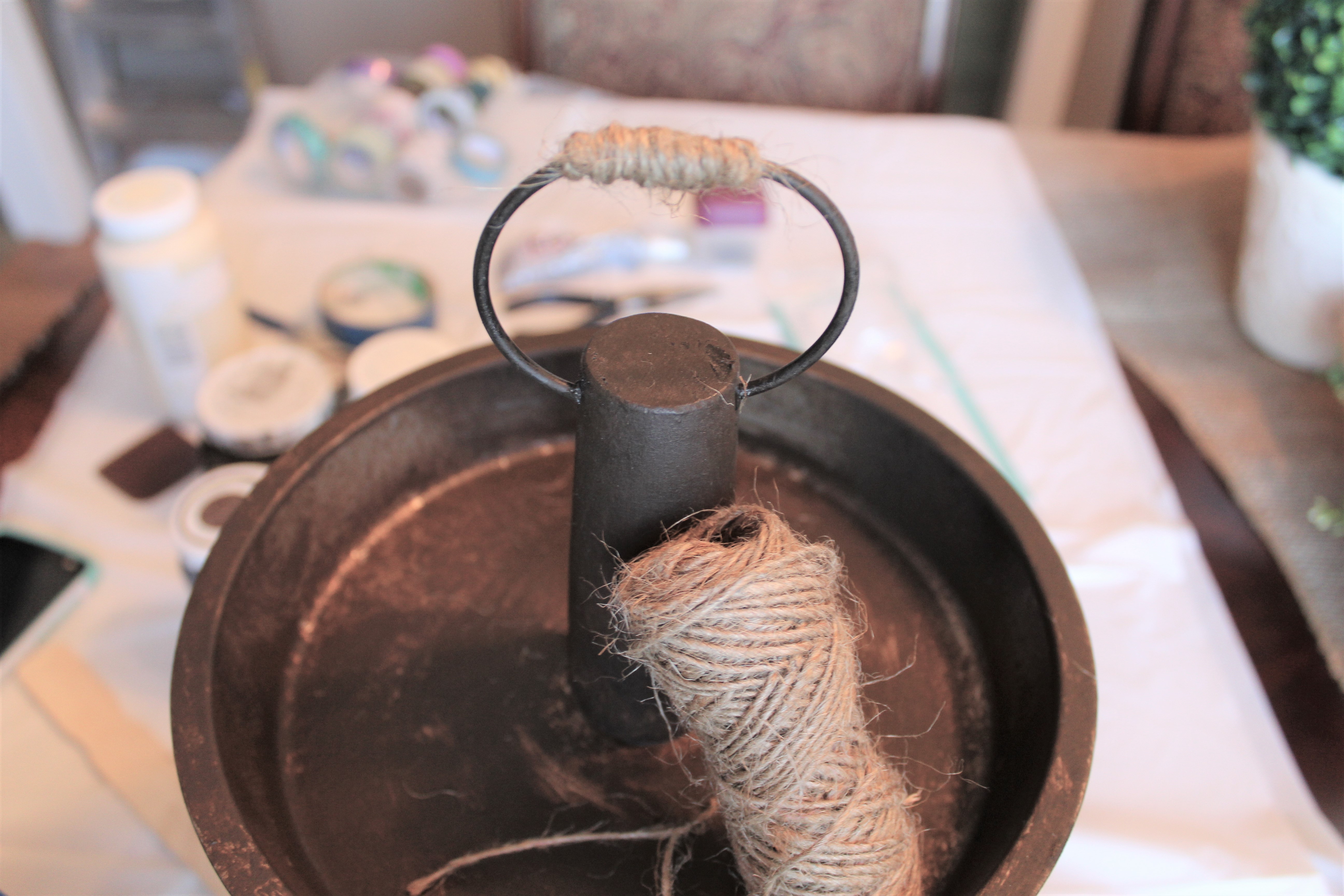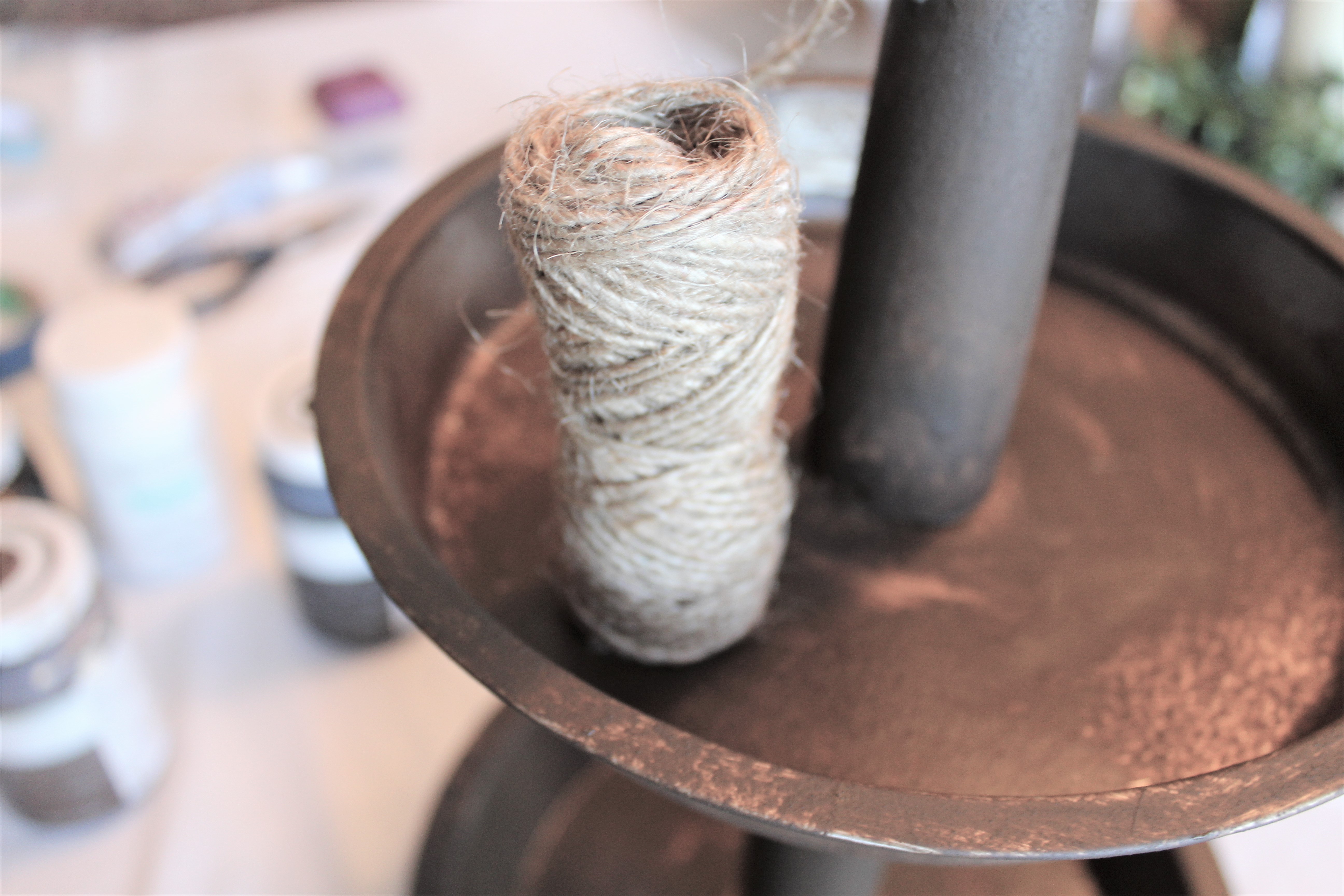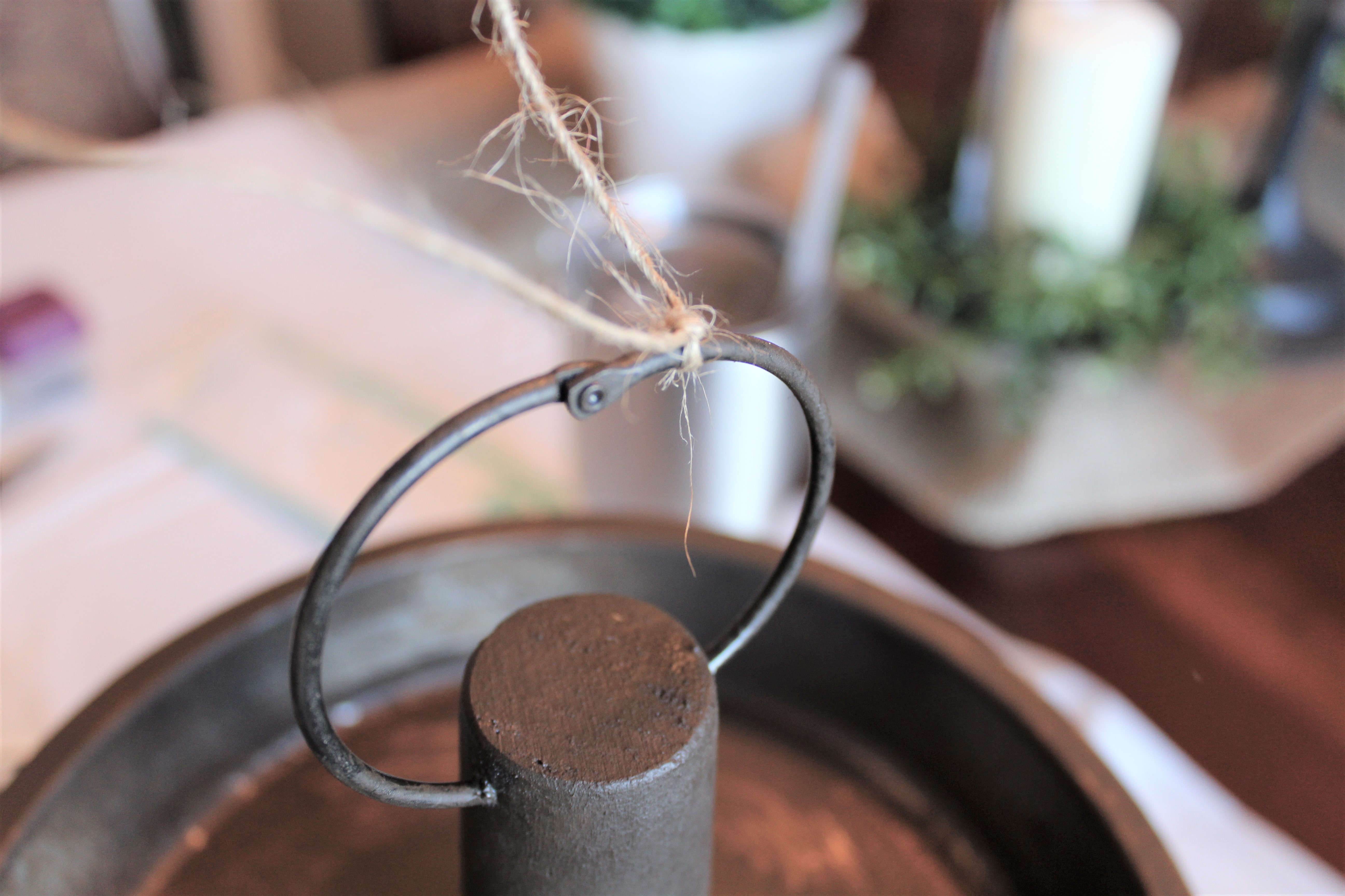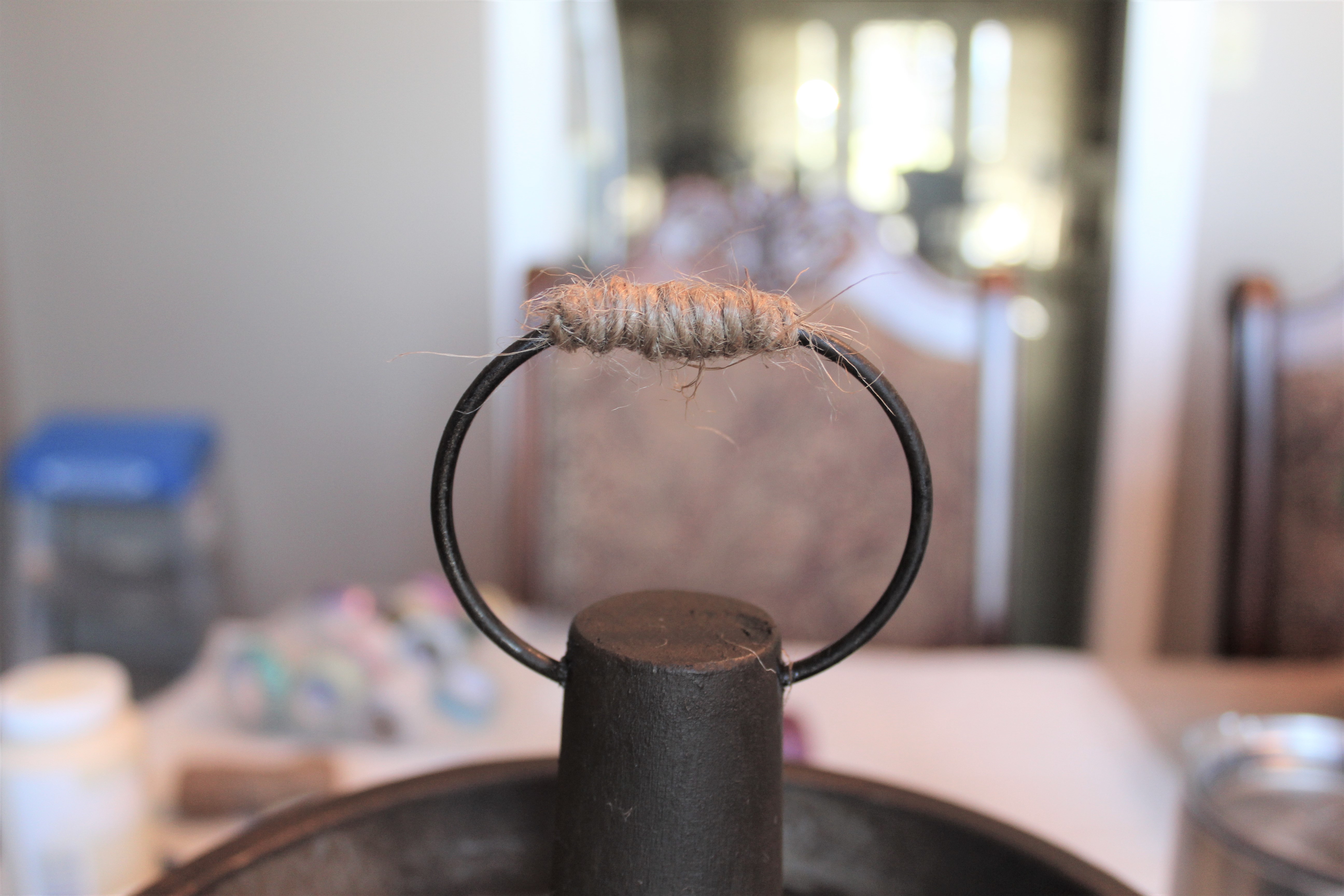 I did not want the hinge part of the shower ring to show. I took some twine (from the Dollar Tree) and wrapped it around several times.