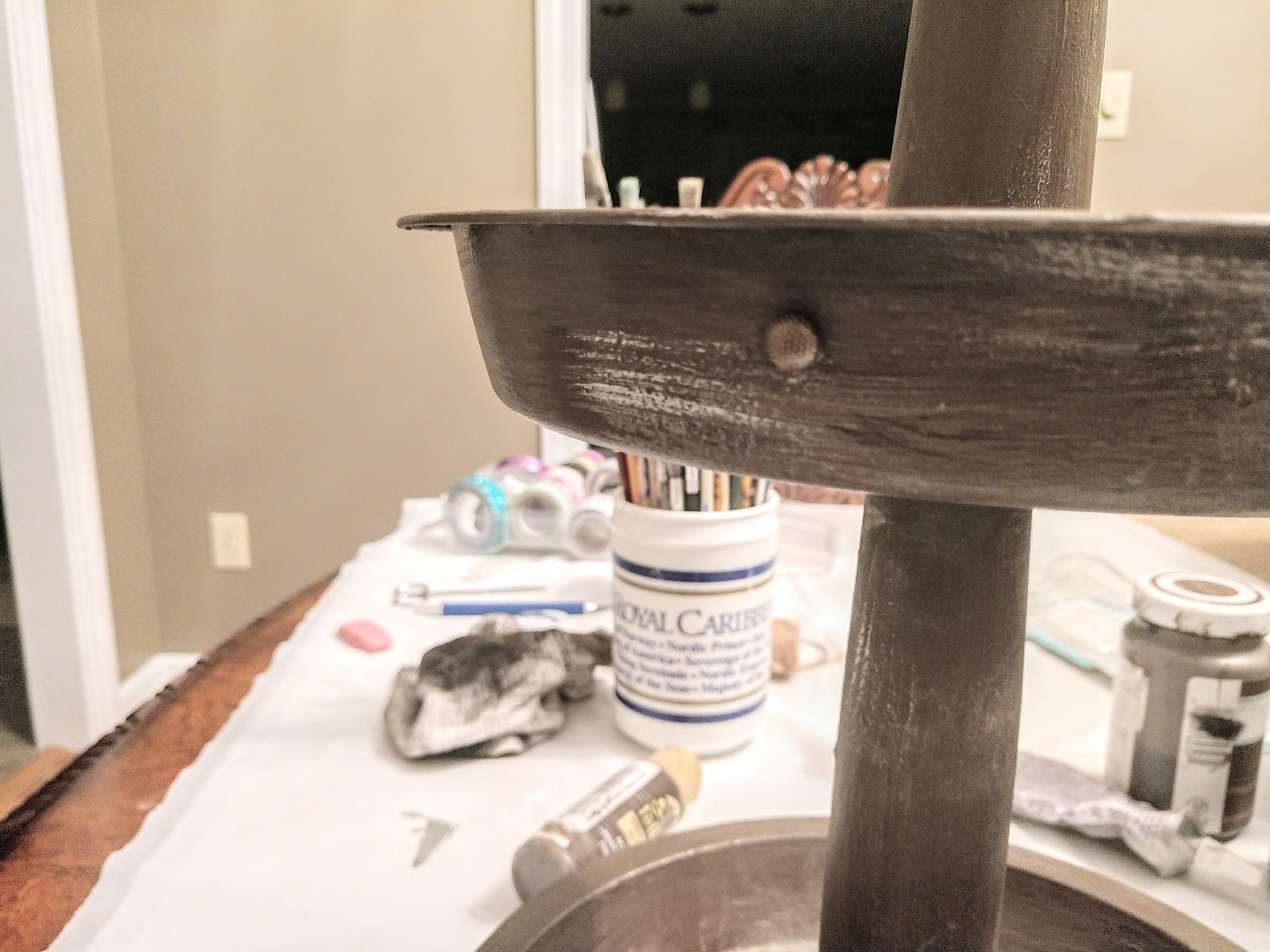 After the 2 coats of brown paint I painted the tray the same way I painted the candlestick that I shared with you last week. Except I changed the brown as the base and I didn’t use the silver metallic paint. If you hadn’t seen that post you can go HERE to see how I painted a faux wood look.