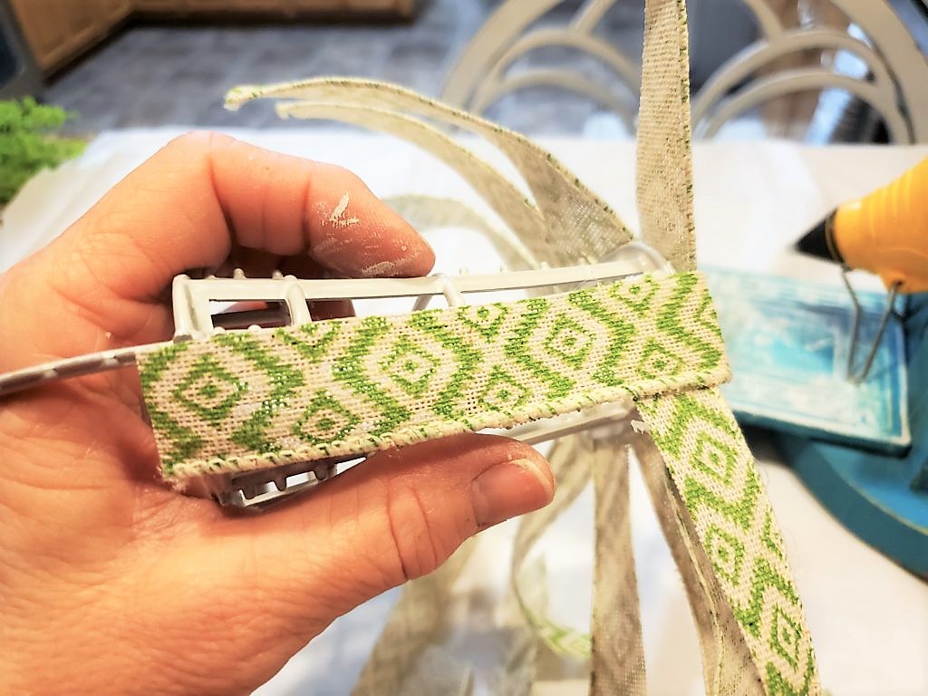 Second 9 inch strip you will do the opposite from the first strip. You will go over and under with the 4 1/2 inch ribbon. You continue with the other 9 inch strips the same way doing opposites weaving. The last strip will be the 12 inch strip. Use that for the last row. You can cut the excess off or roll it over to the inside of your top with hot glue.