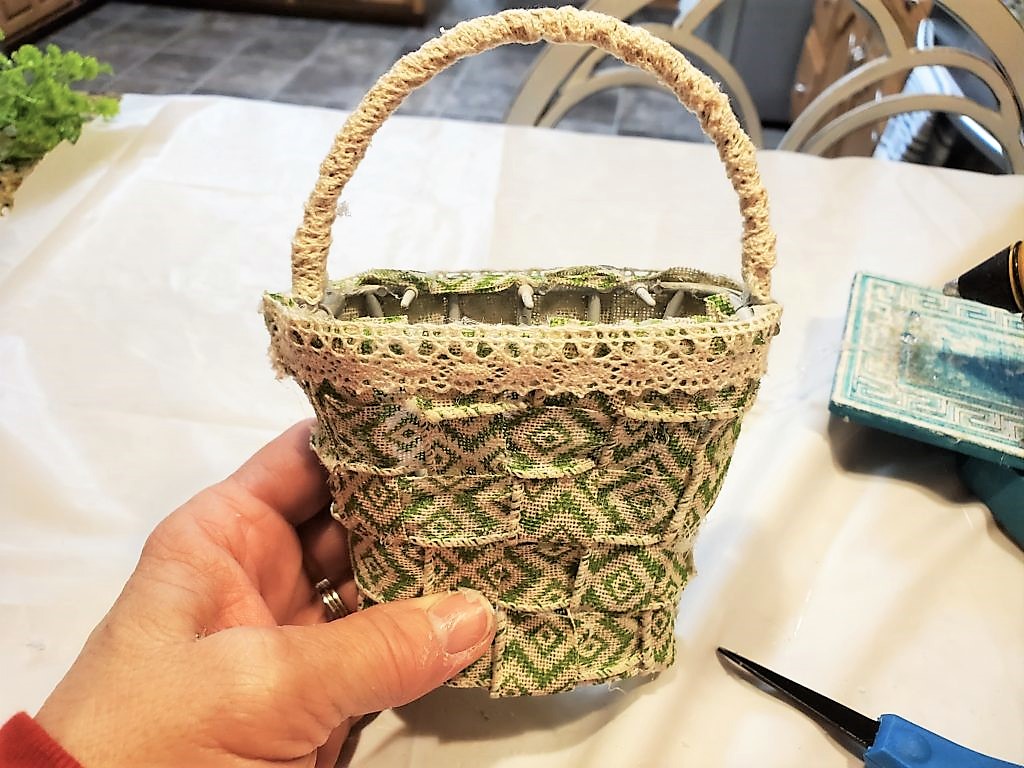 Taking the same lace ribbon and trimming the top of the basket.