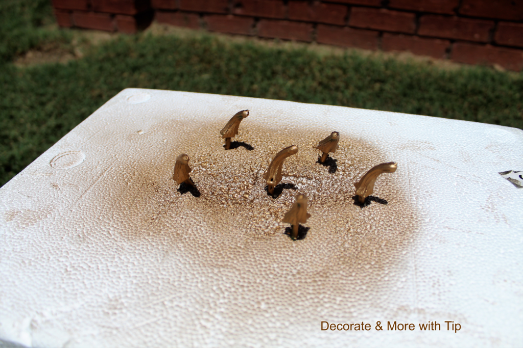 The gold leaf will not stick where there’s no mod podge. Once I had the amount of gold leaf I let it sit for about 3 minutes or so and then started brushing the gold leaf spots with a stiff brush. Lightly brushing until the loose leaf was removed.