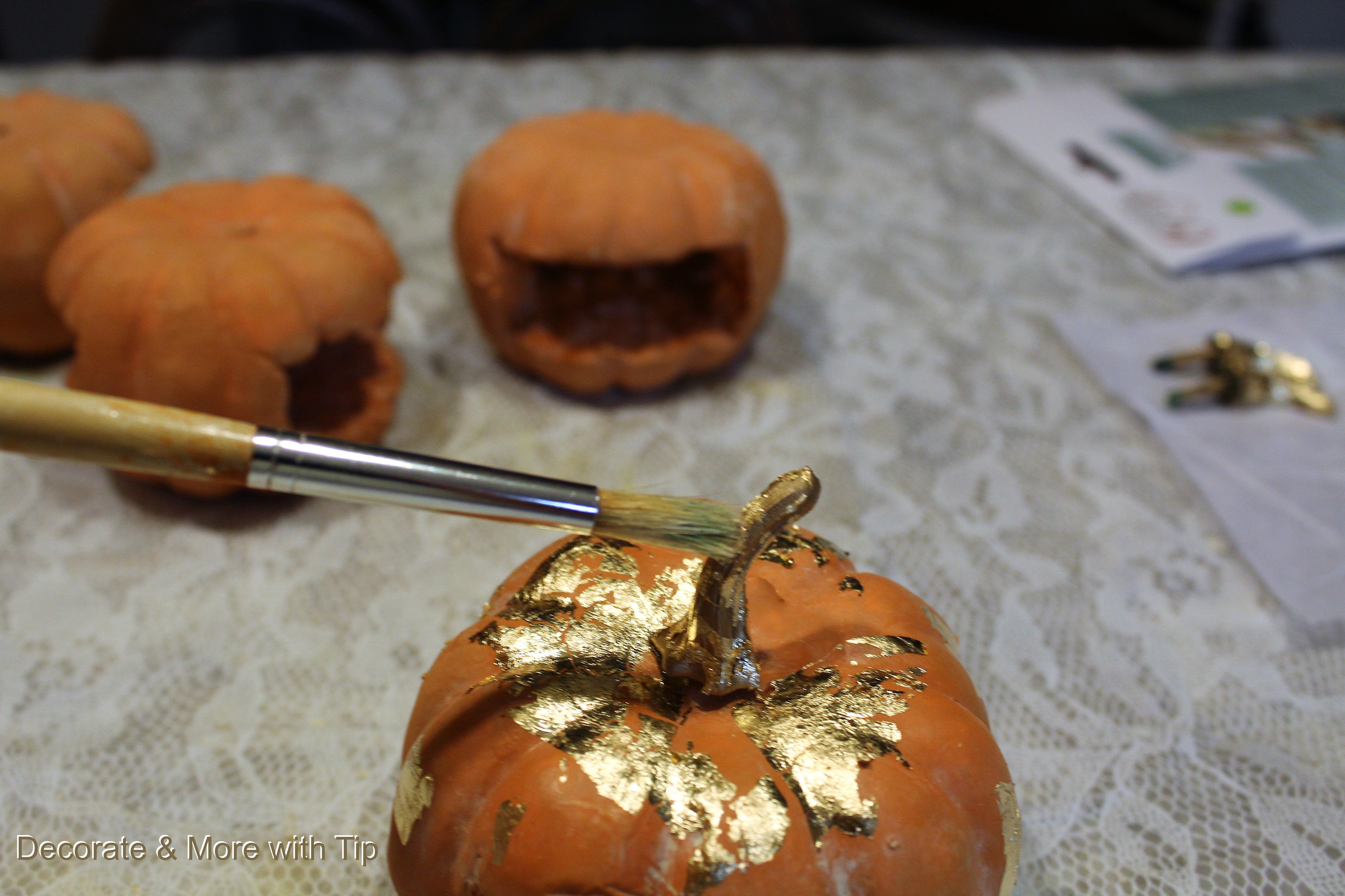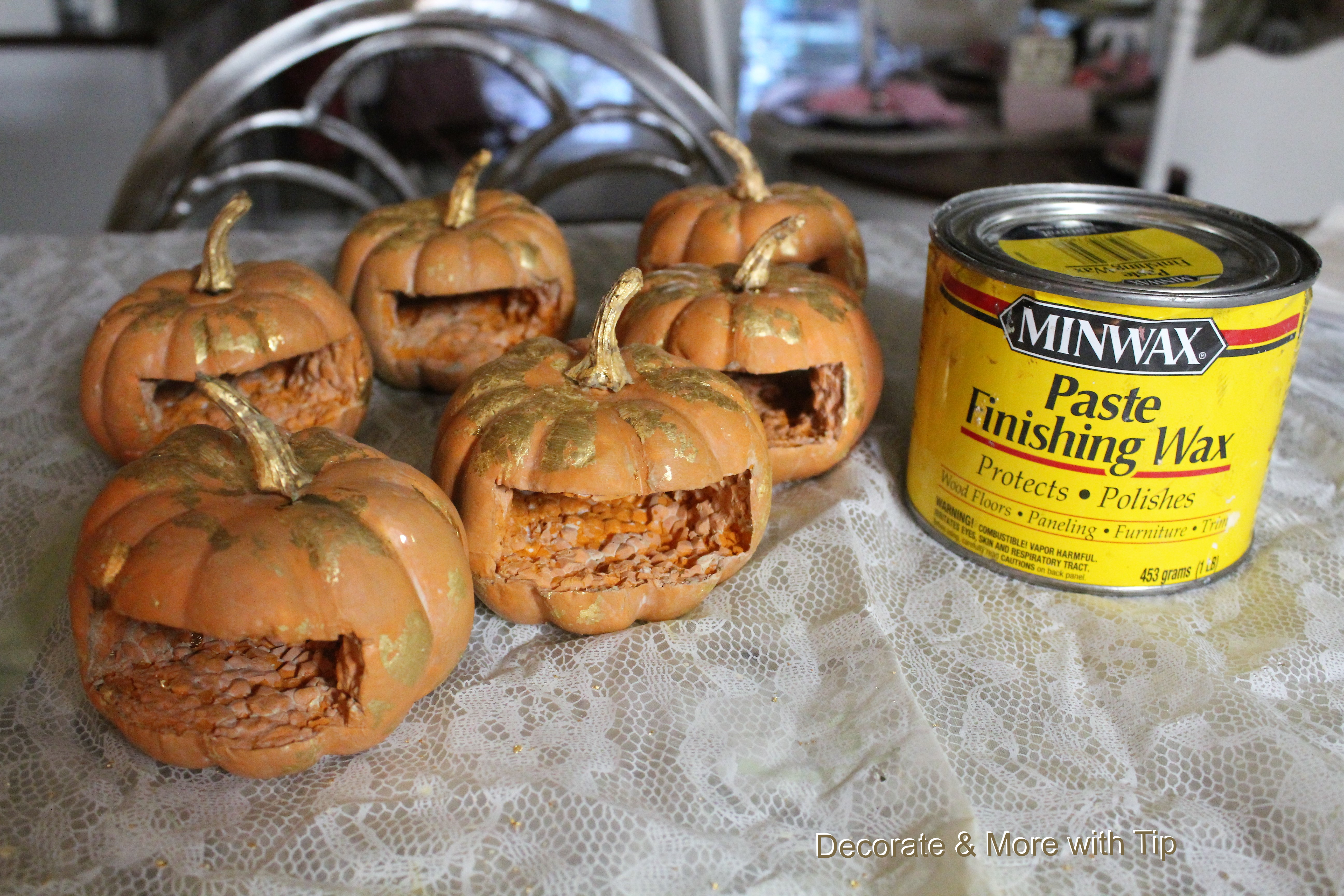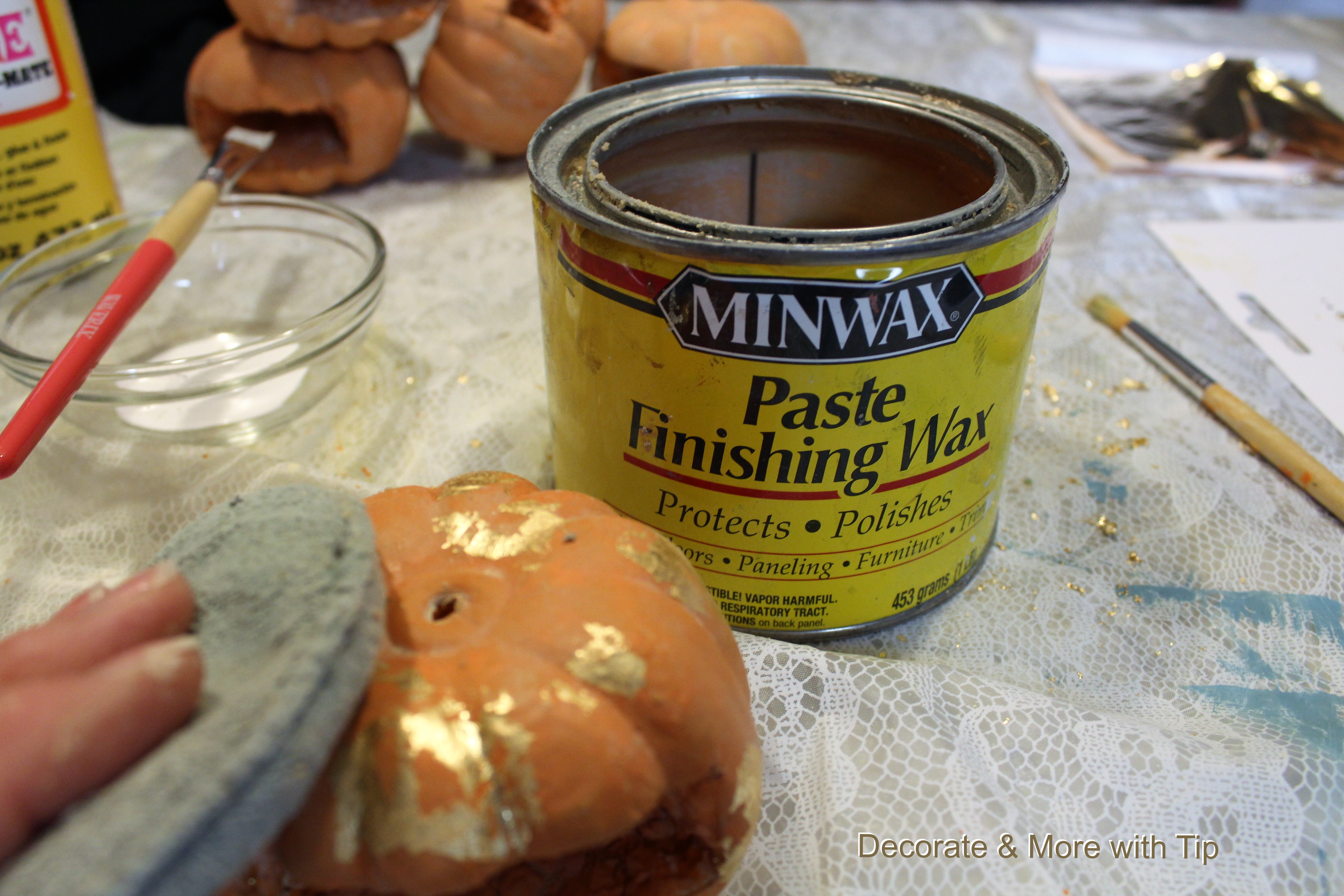 After all of my pumpkins had the gold leaf added, I applied a coat of minwax finishing paste on them all. I like to seal everything I do because it is easier to dust and clean.