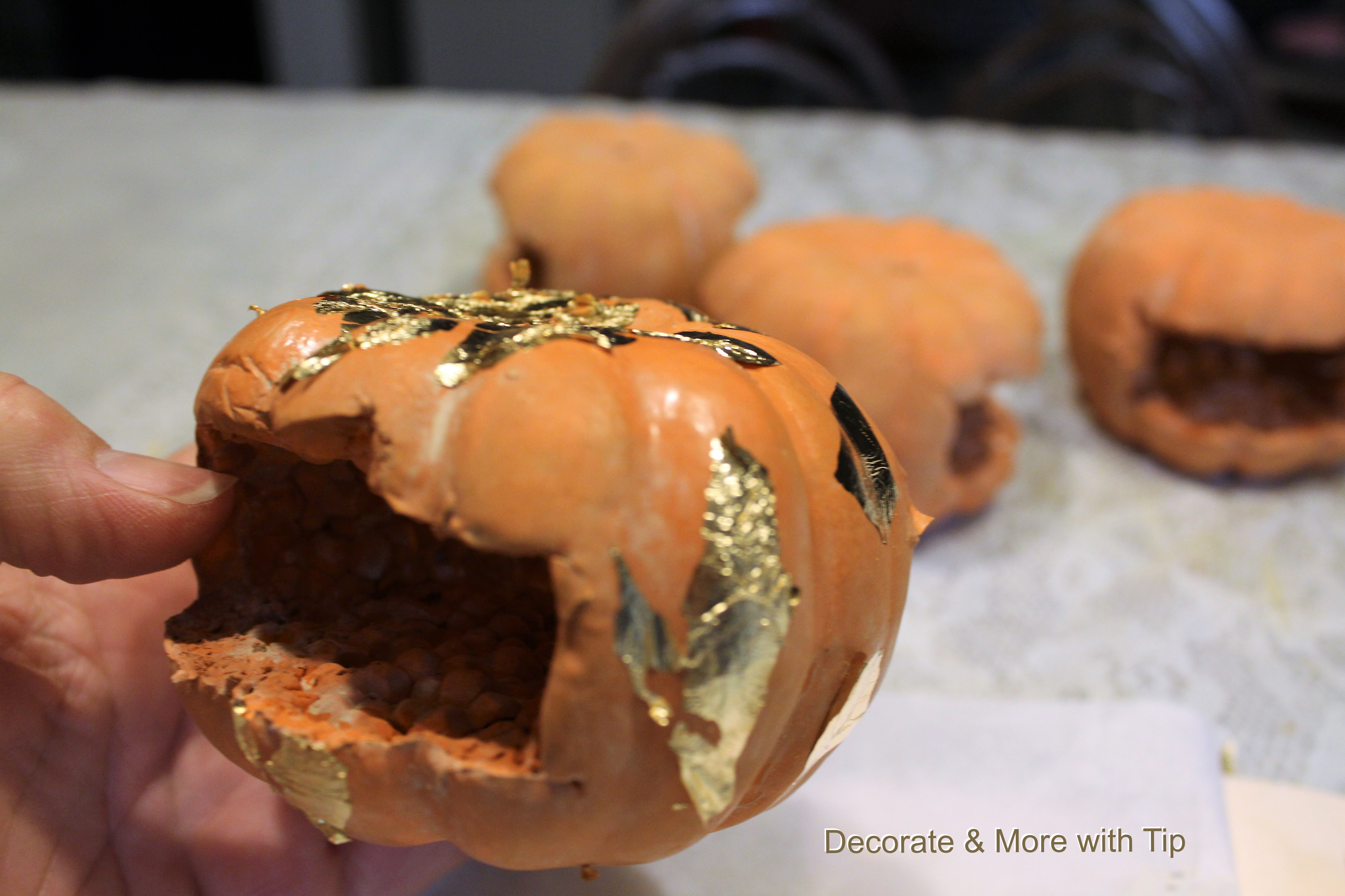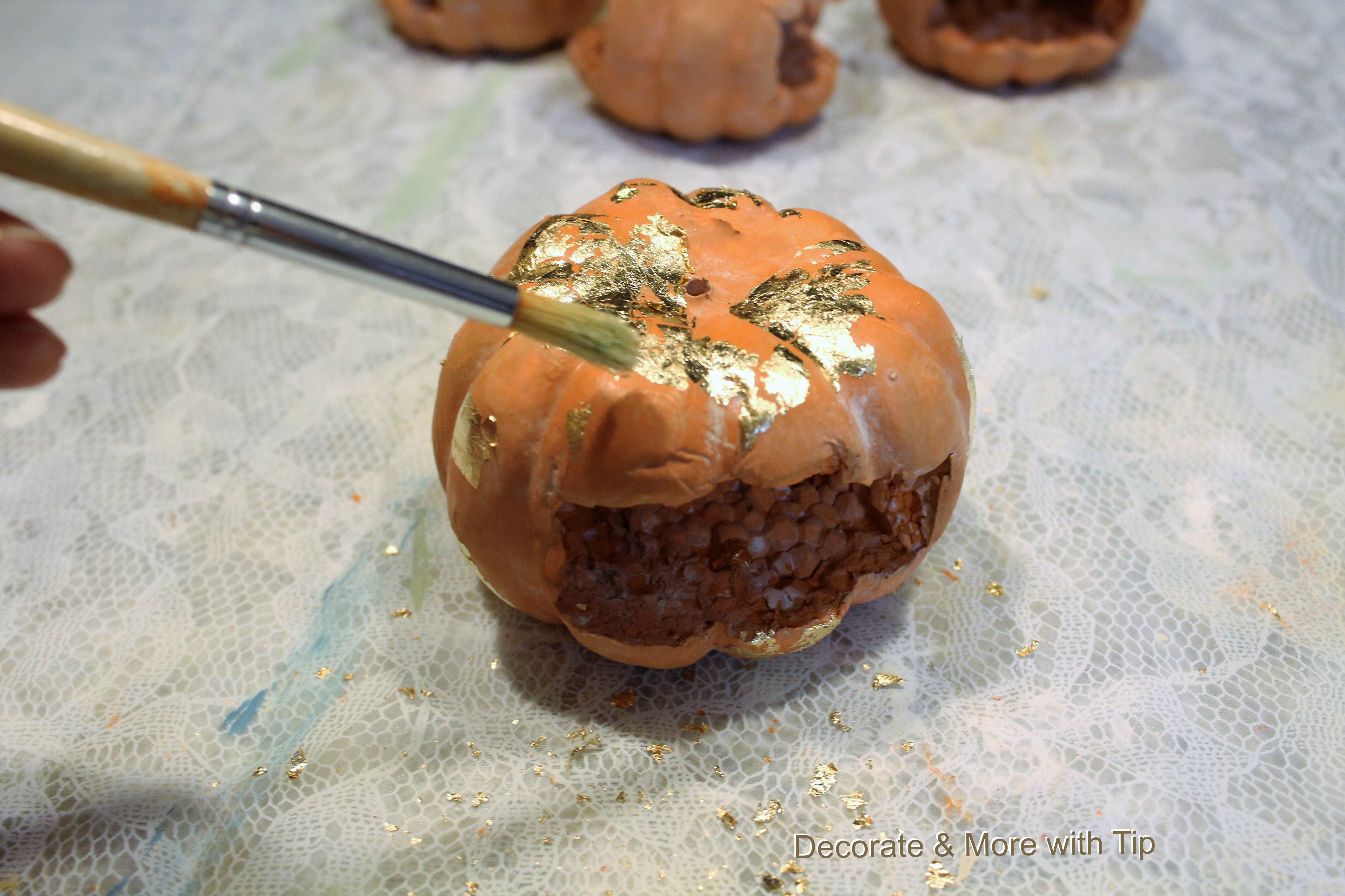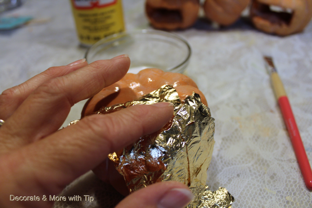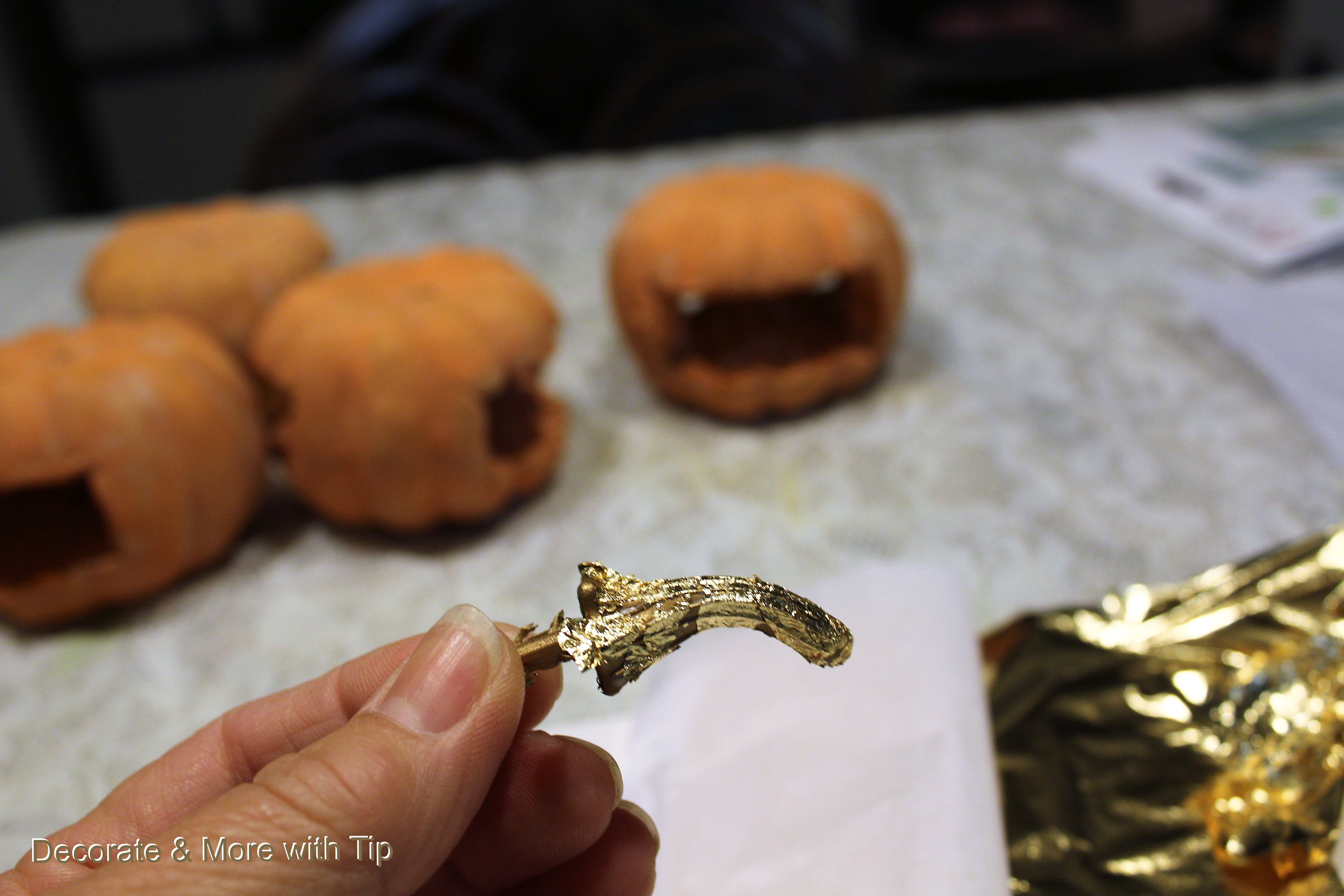 After all of my pumpkins had the gold leaf added, I applied a coat of minwax finishing paste on them all. I like to seal everything I do because it is easier to dust and clean.