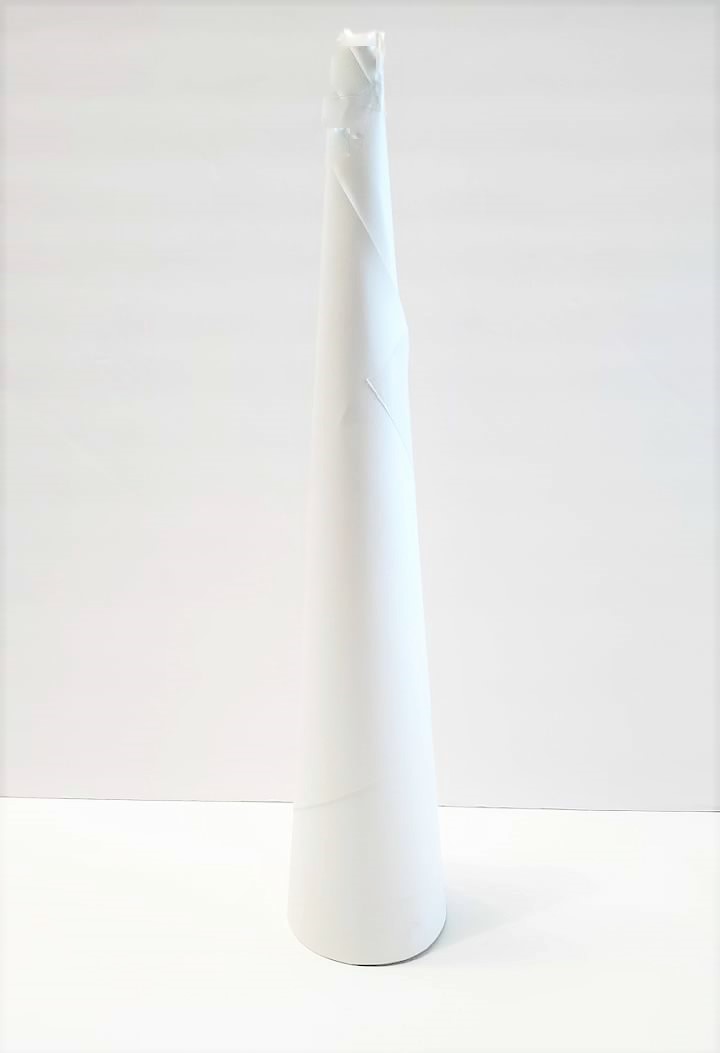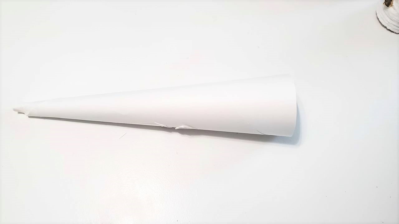 Make a cone with the poster board by putting pressure on one corner, curling up the other end of the poster board to shape a cone, tape the poster board together and trim the bottom of the cone.