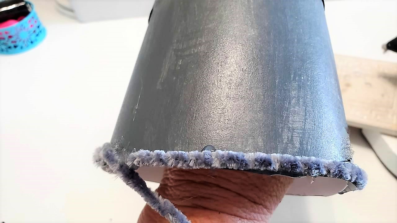 Place a stream of hot glue to the bottom edge of your cone and apply the yarn.