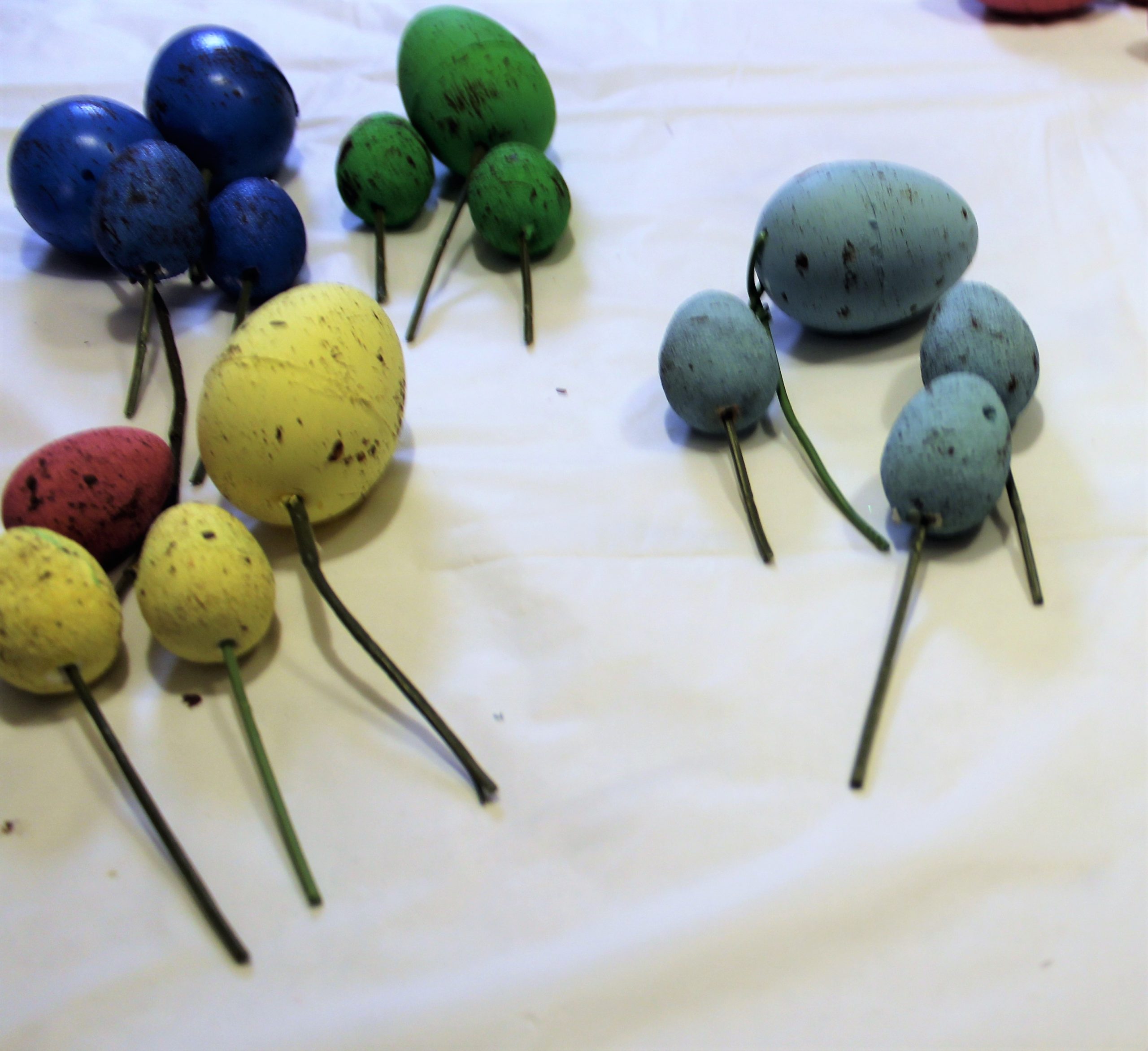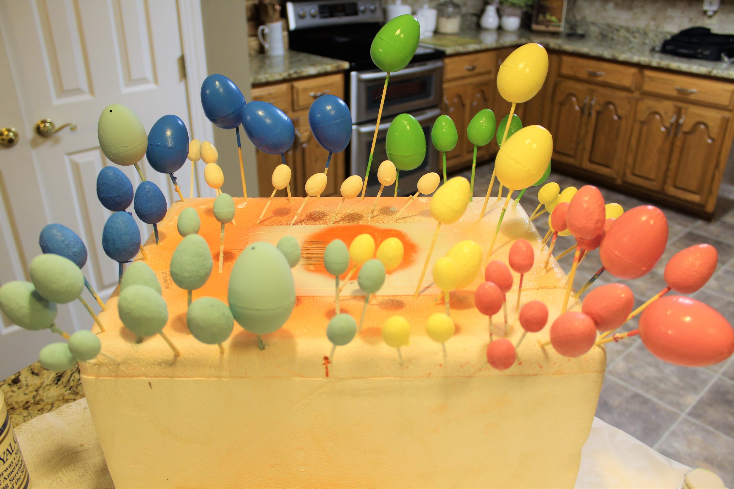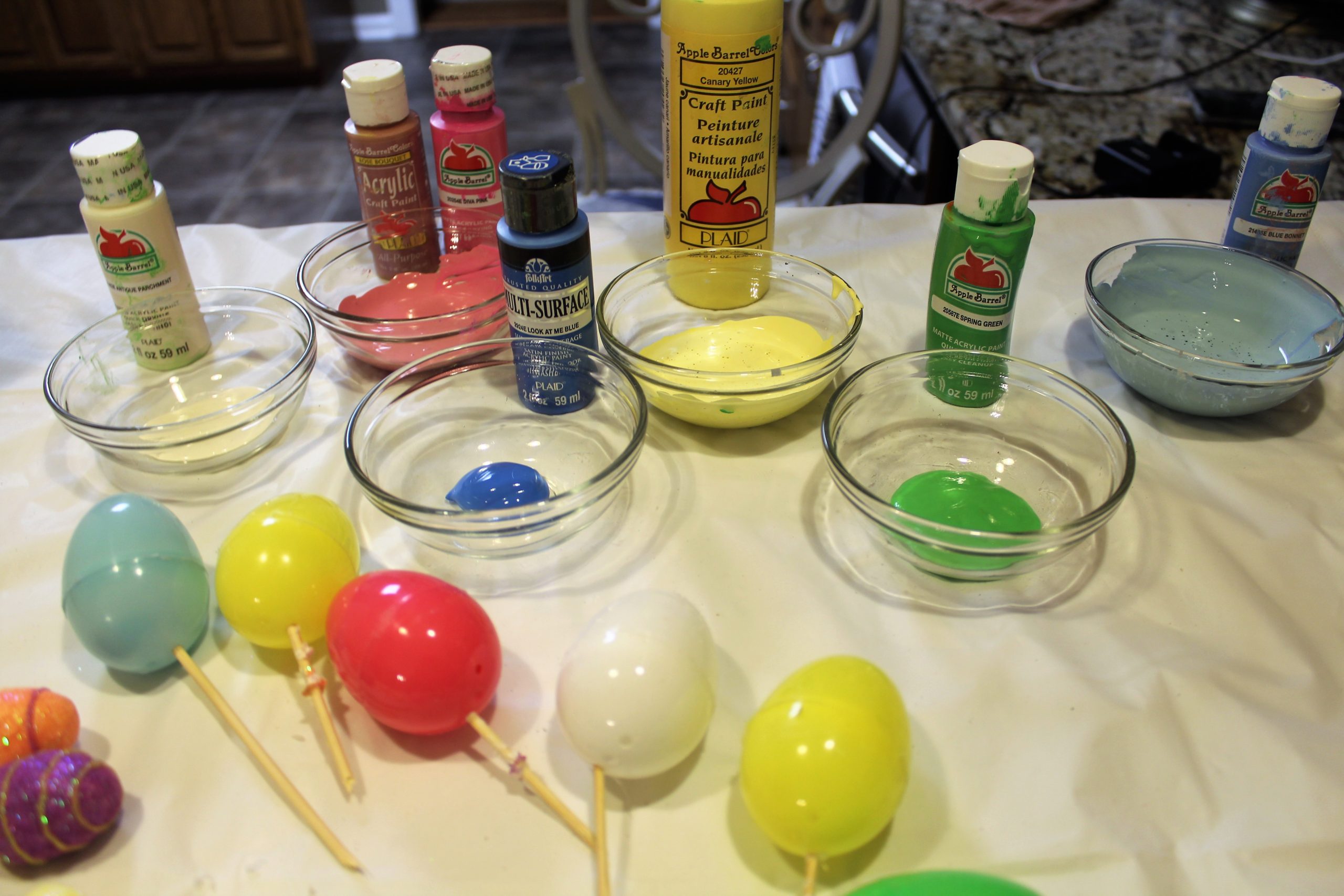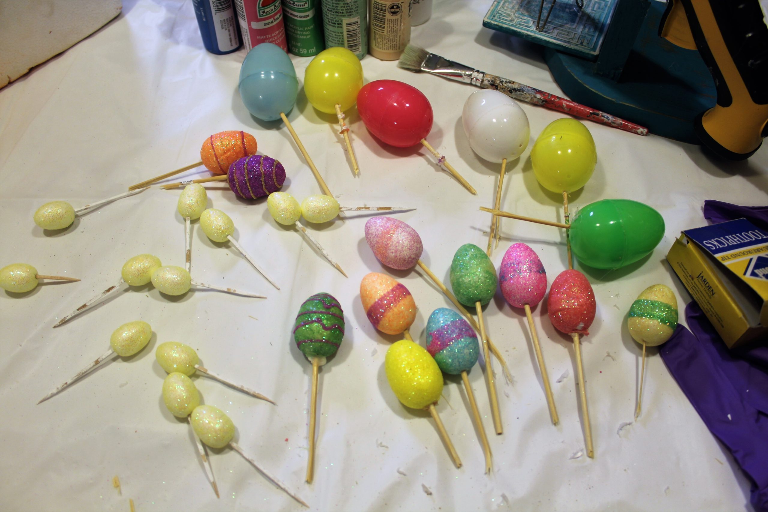Taking all the plastic eggs and gluing the two parts together with E6000 and a wooden stick.
