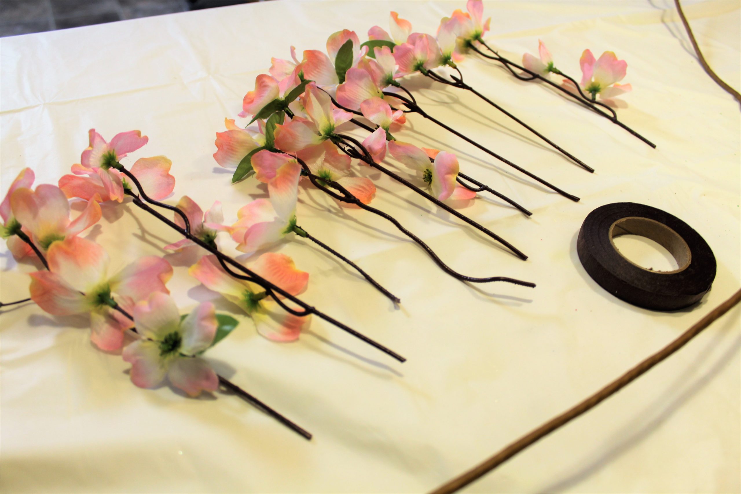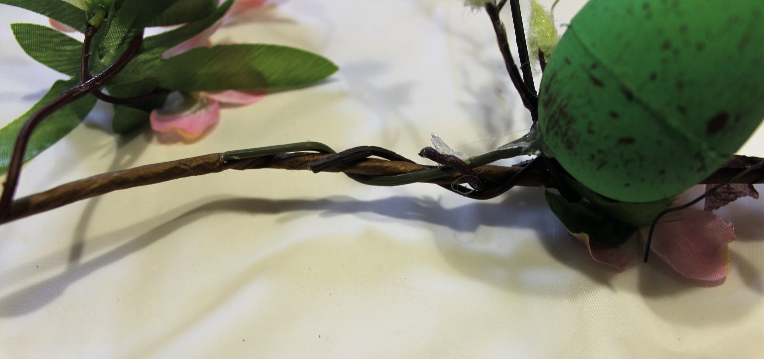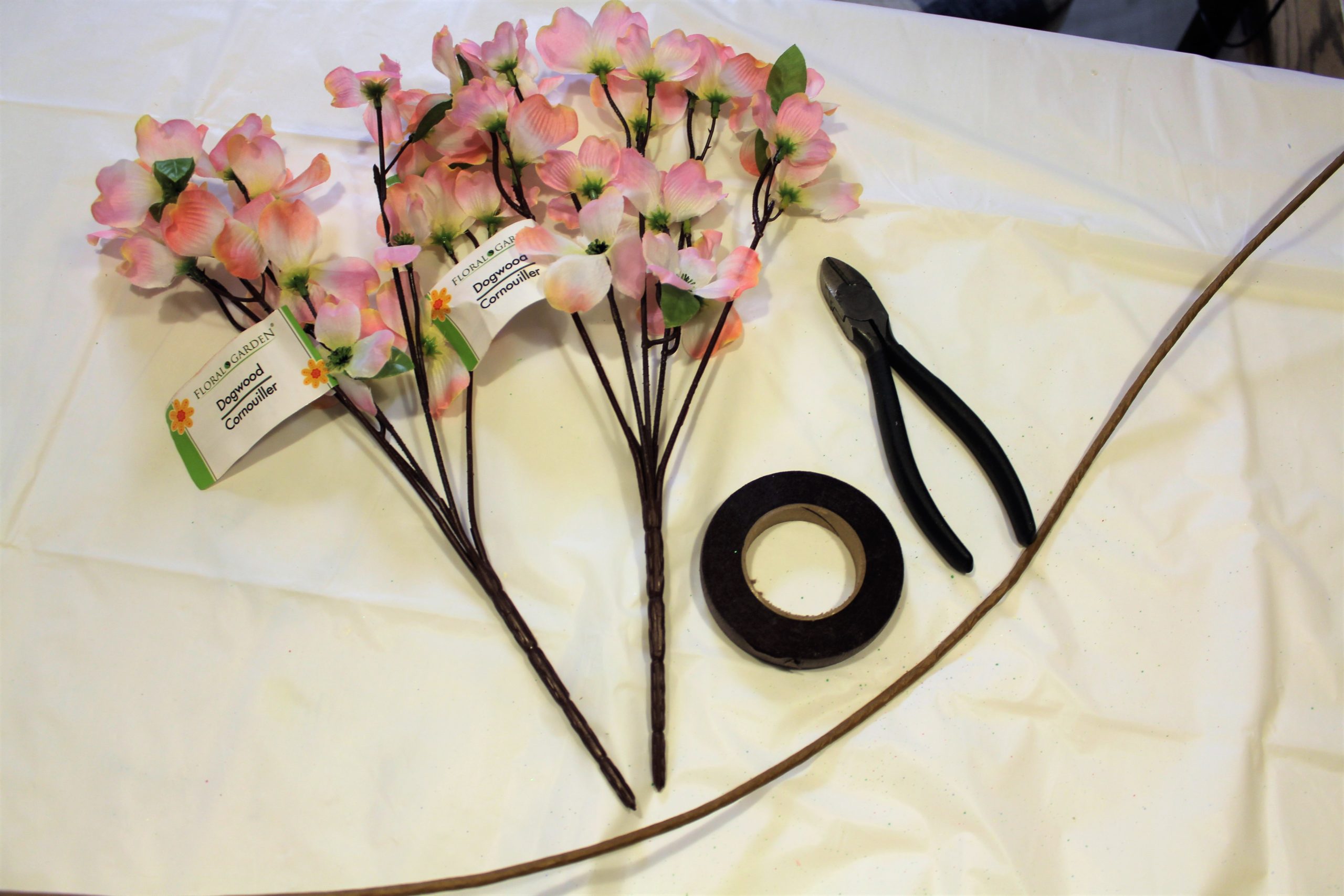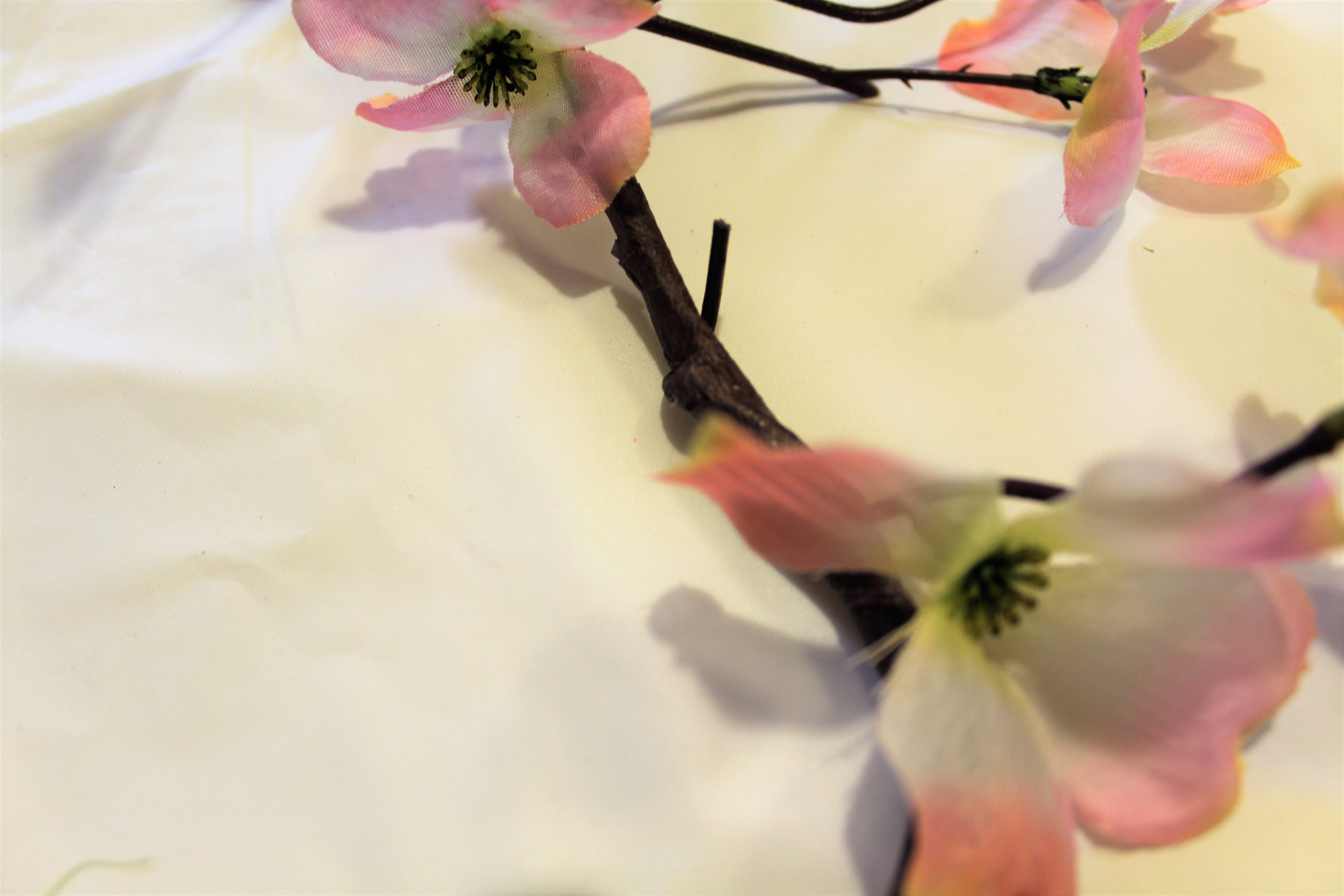 Just like the Kirkland’s garland I will be adding some pink flowers. Using the Dogwood blooms cutting them off the bundle. Twisting the stem around the brown wire. I wrapped brown floral tape around to secure the flowers onto the base.