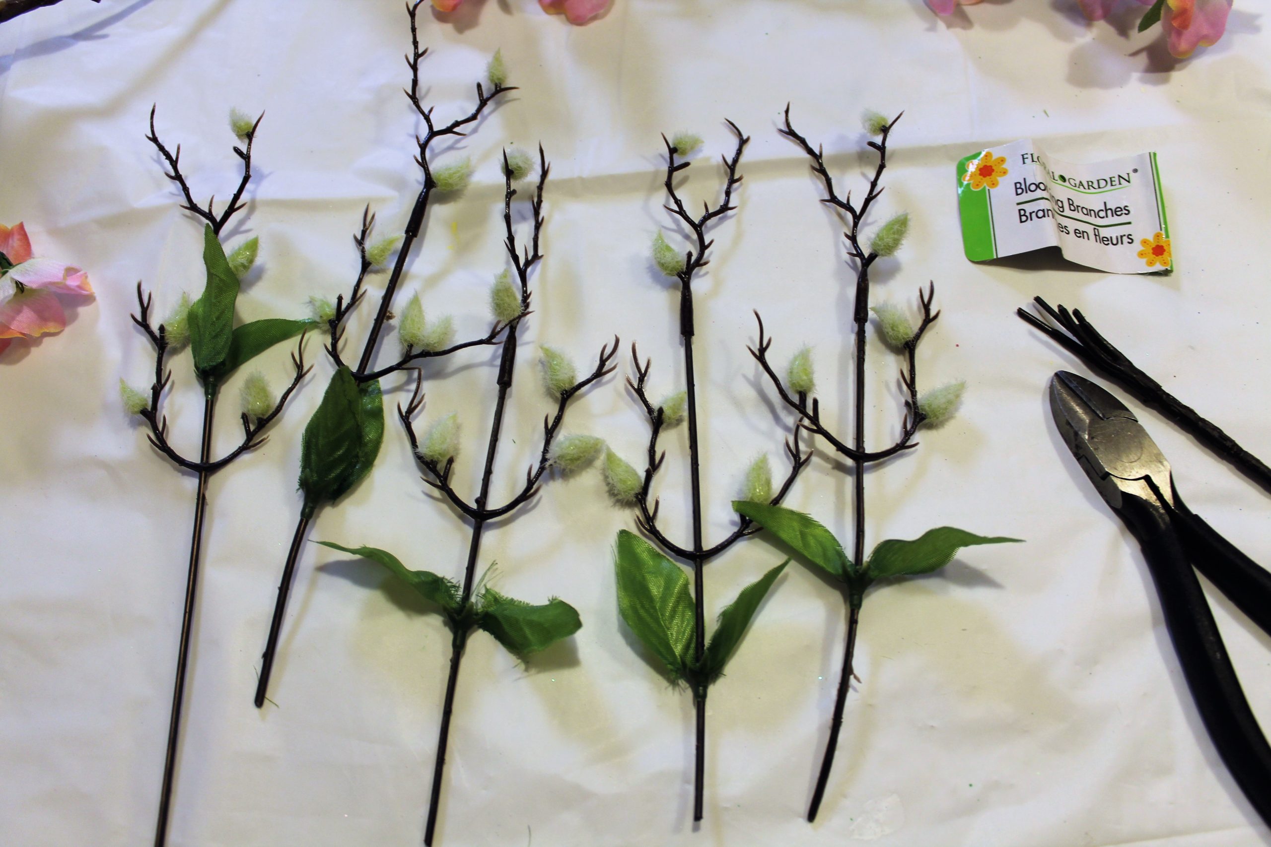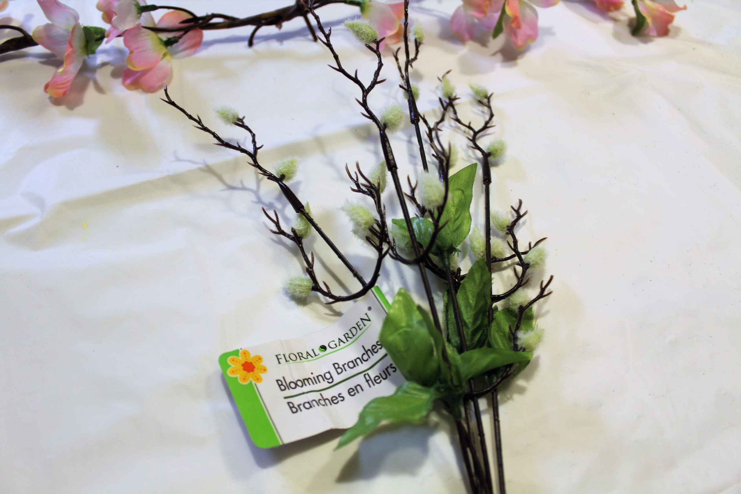 To give a more spiked look I am using 1 blooming branch I picked up at Dollar Tree. Doing the same thing as I did with the dogwood blooms.