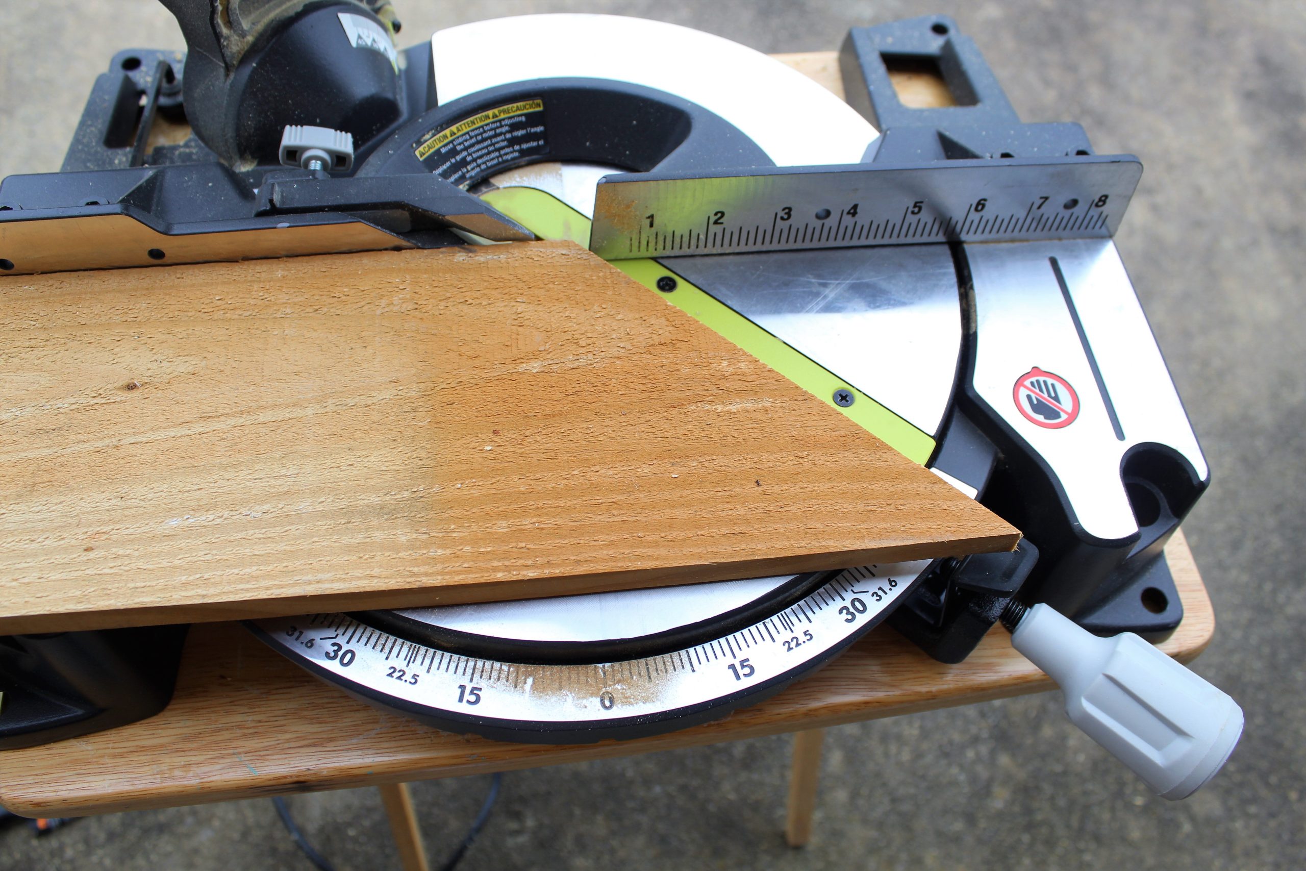 Cut each piece by placing the top cut (short side of the 45-degree cut) at the measurement of the board. Remember mine was at 5 1/2 inches. I hope this makes sense.