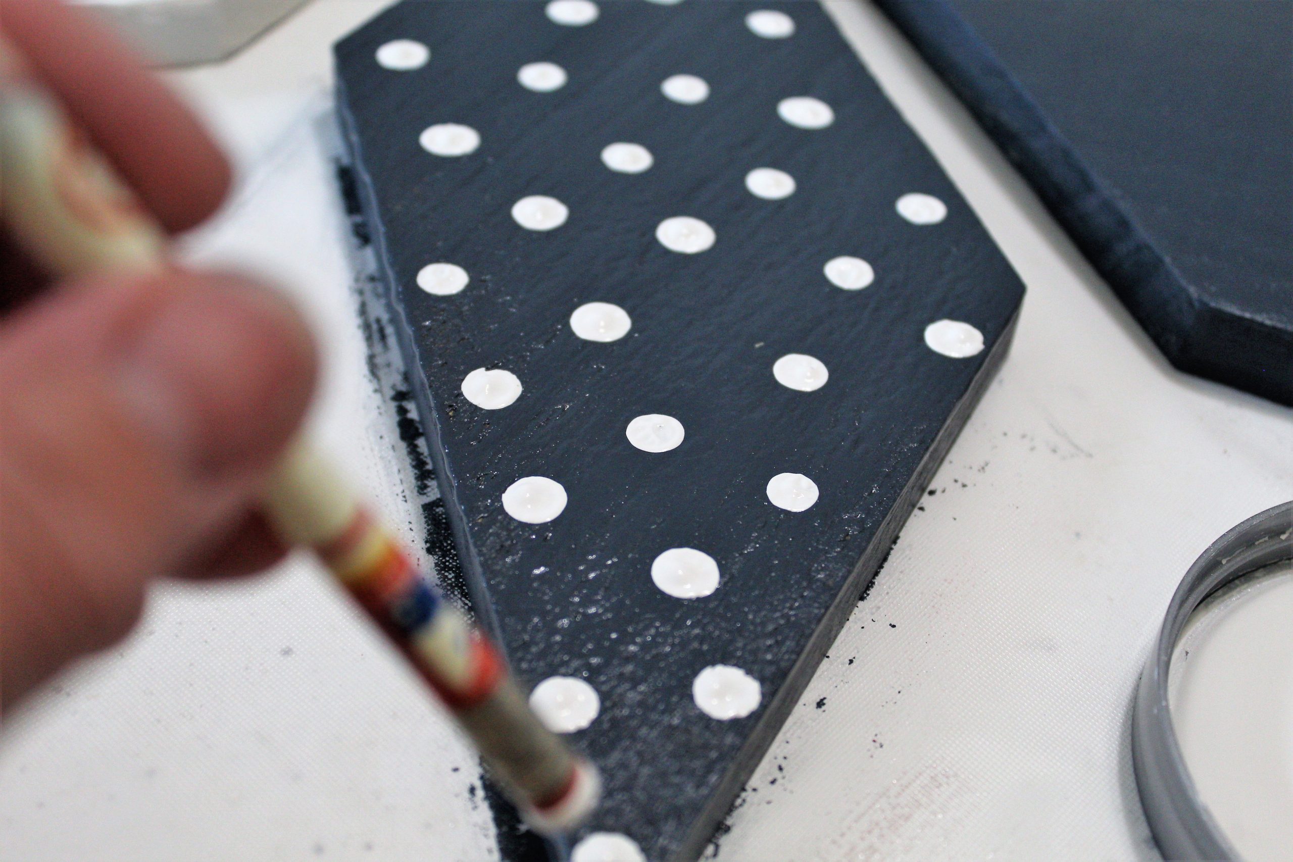 Adding some polka dots to the two blue pieces with a pencil eraser and white paint.