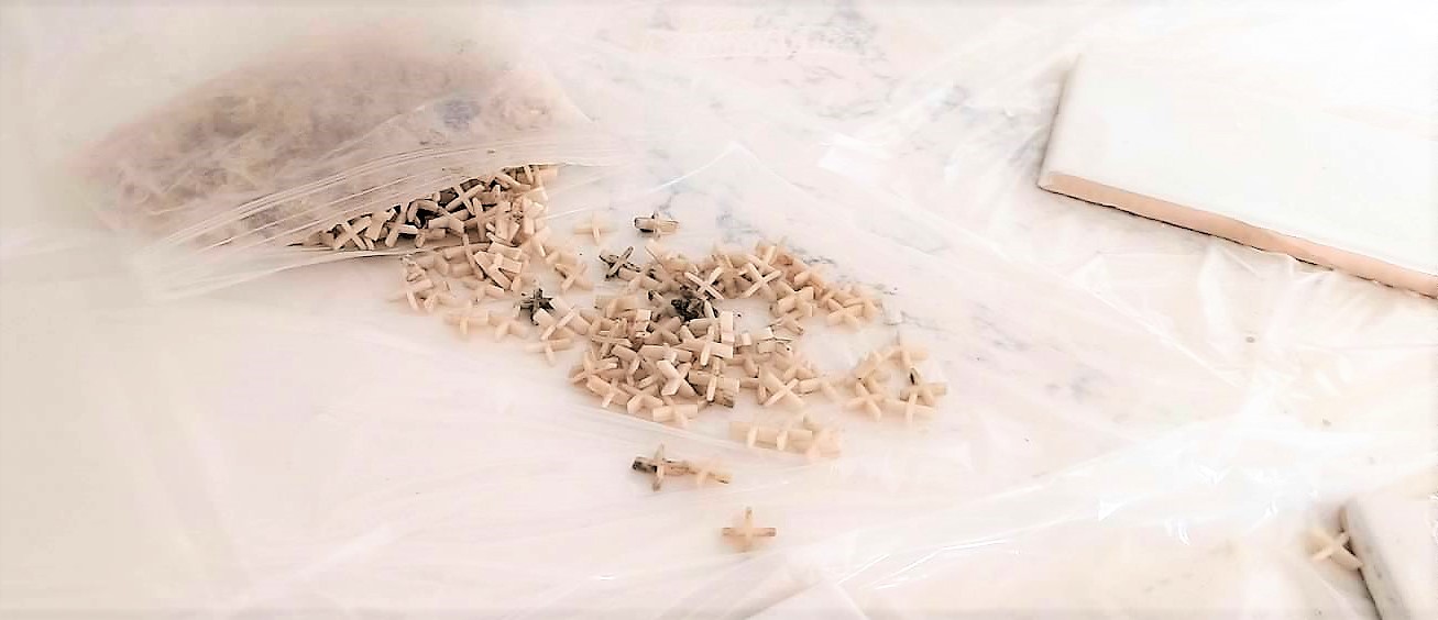 We continue to lay the tile the same way all around the countertops. After we were through placing the last piece. I went back to the first wall, removed all the spacers and cleaned the grout lines and the excess adhesive off the tiles.