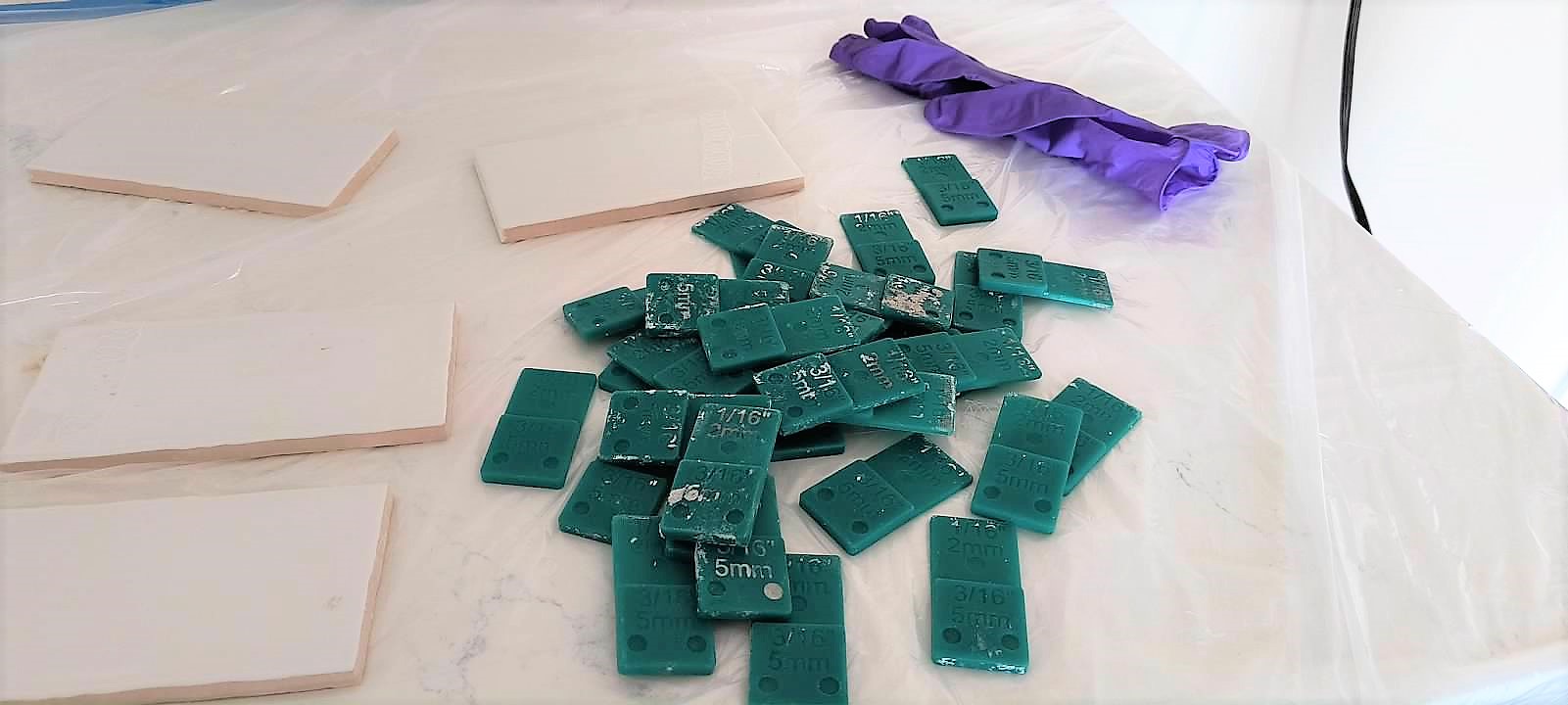 Mr. Tip took the marked tiles and cut them with a wet tile saw.