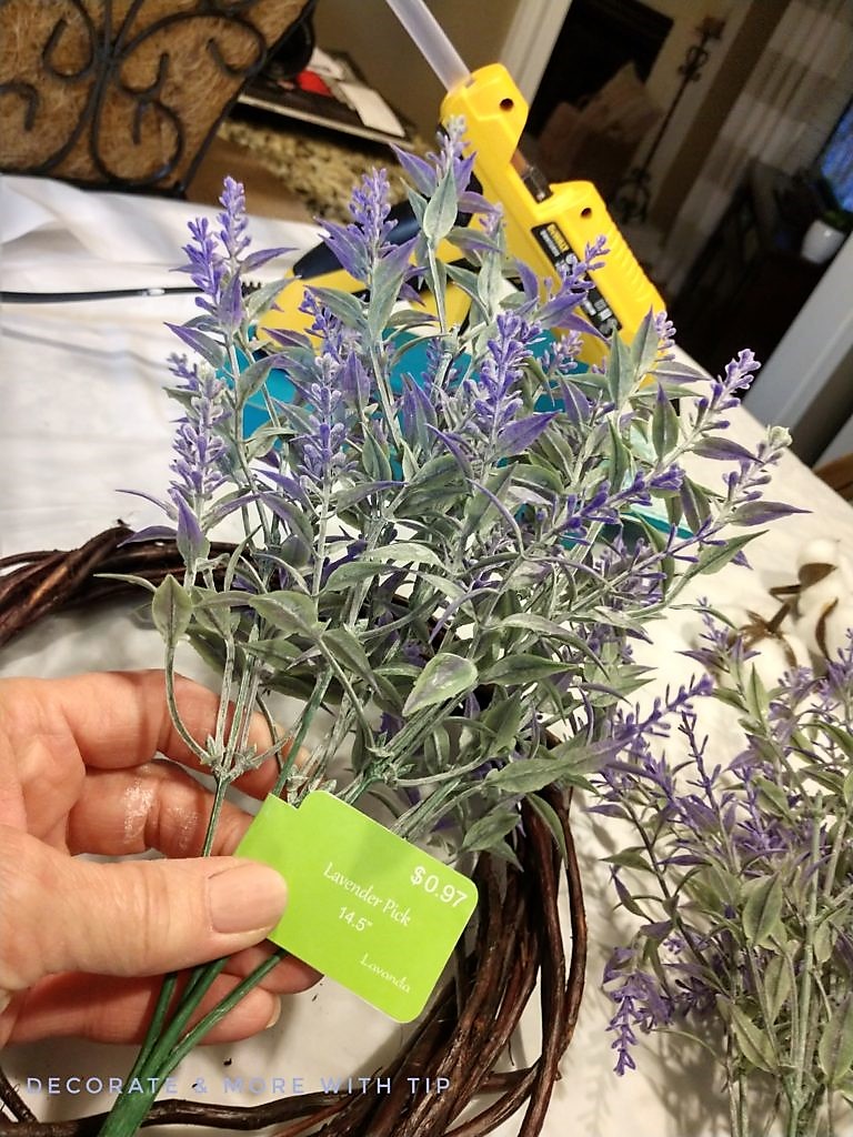 Where there is space between the lamb’s ear on the wreath I place a dab of hot glue and place the lavender piece to fill in the space.