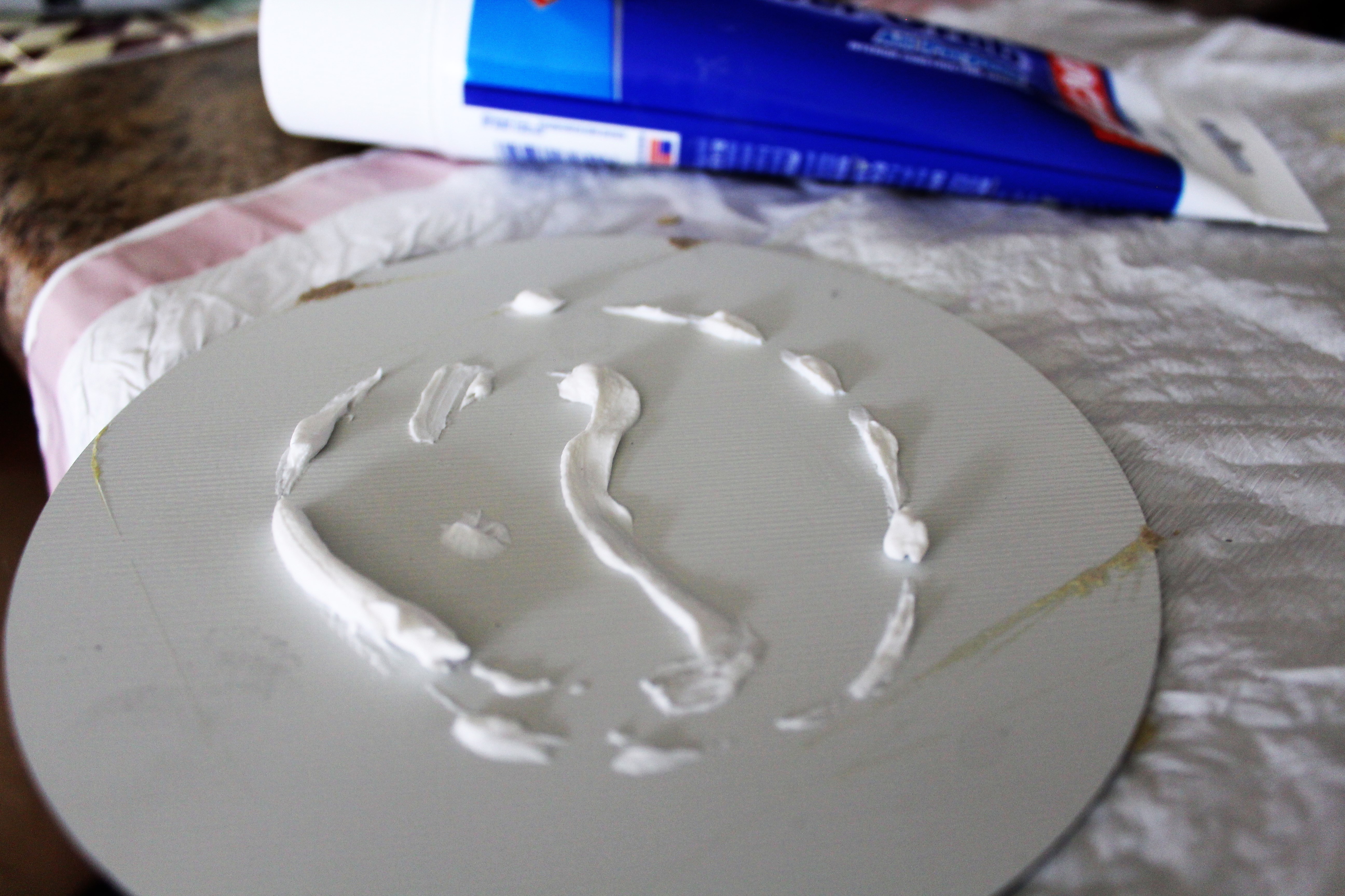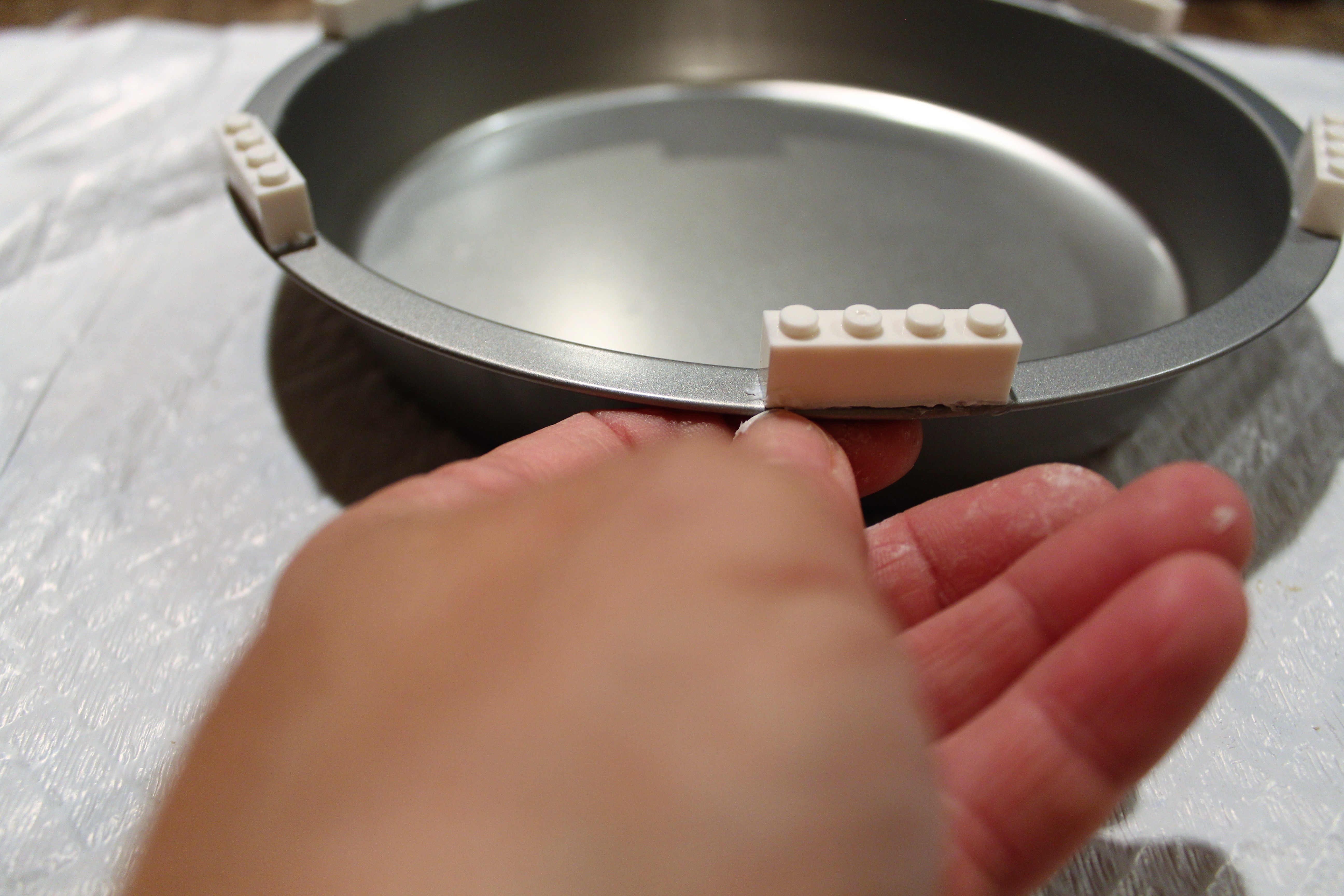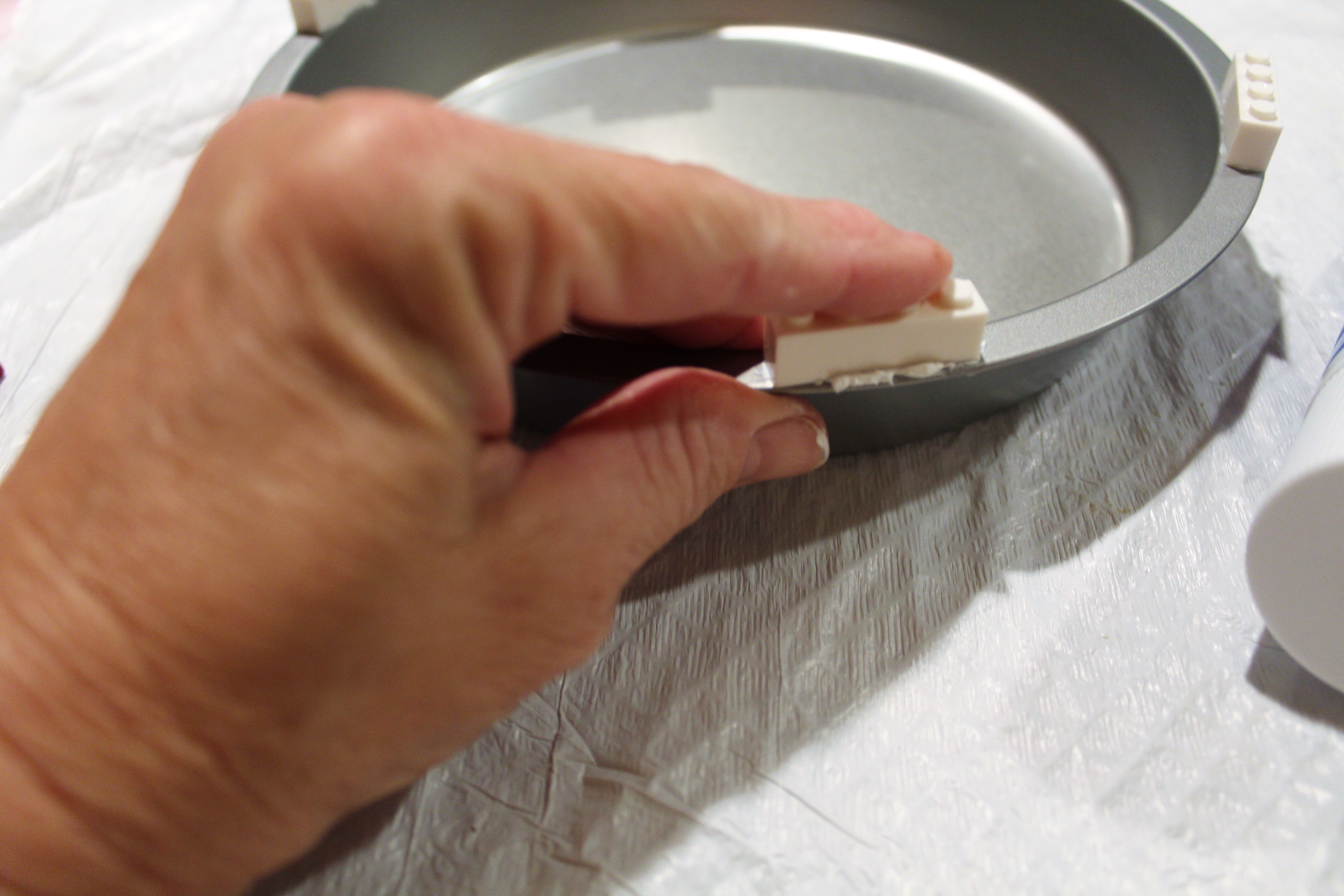 Gluing the pieces to the rim of the cake pan. I spaced the pieces evenly around the pan cleaning off the glue.