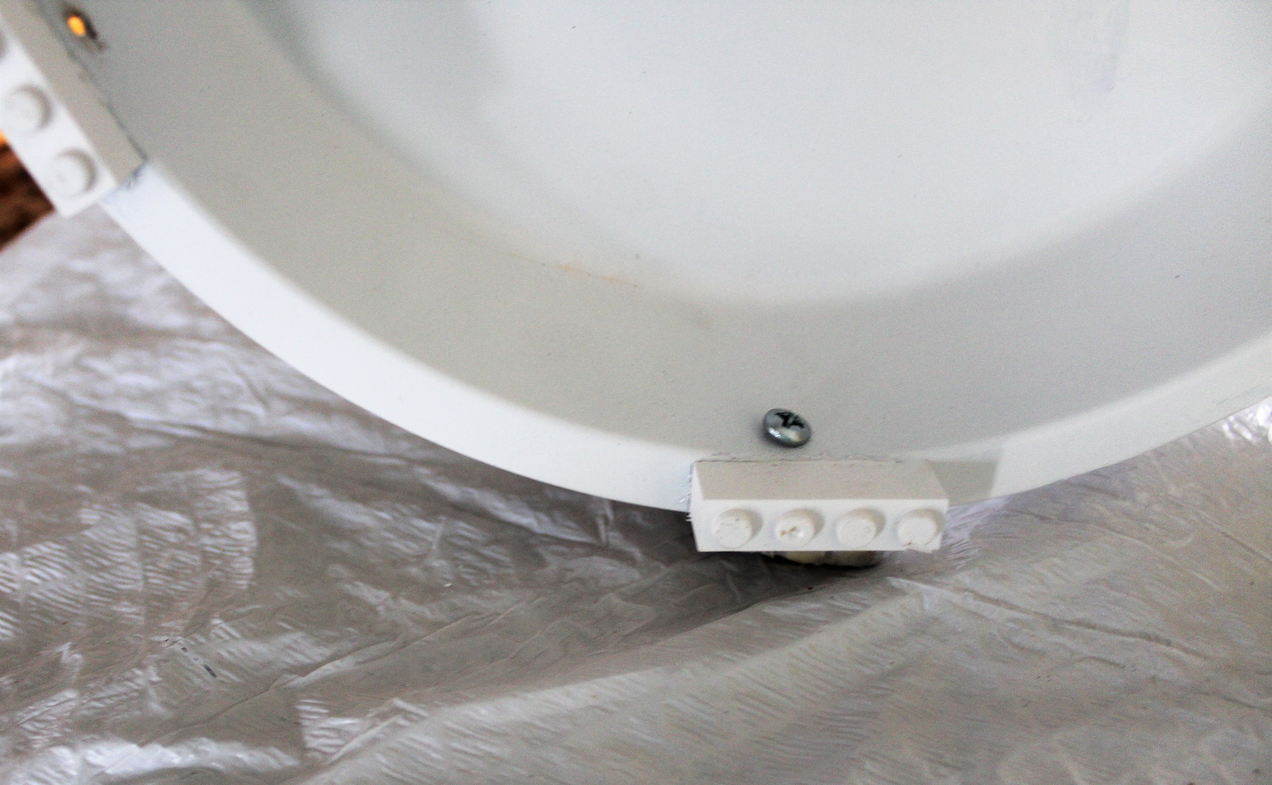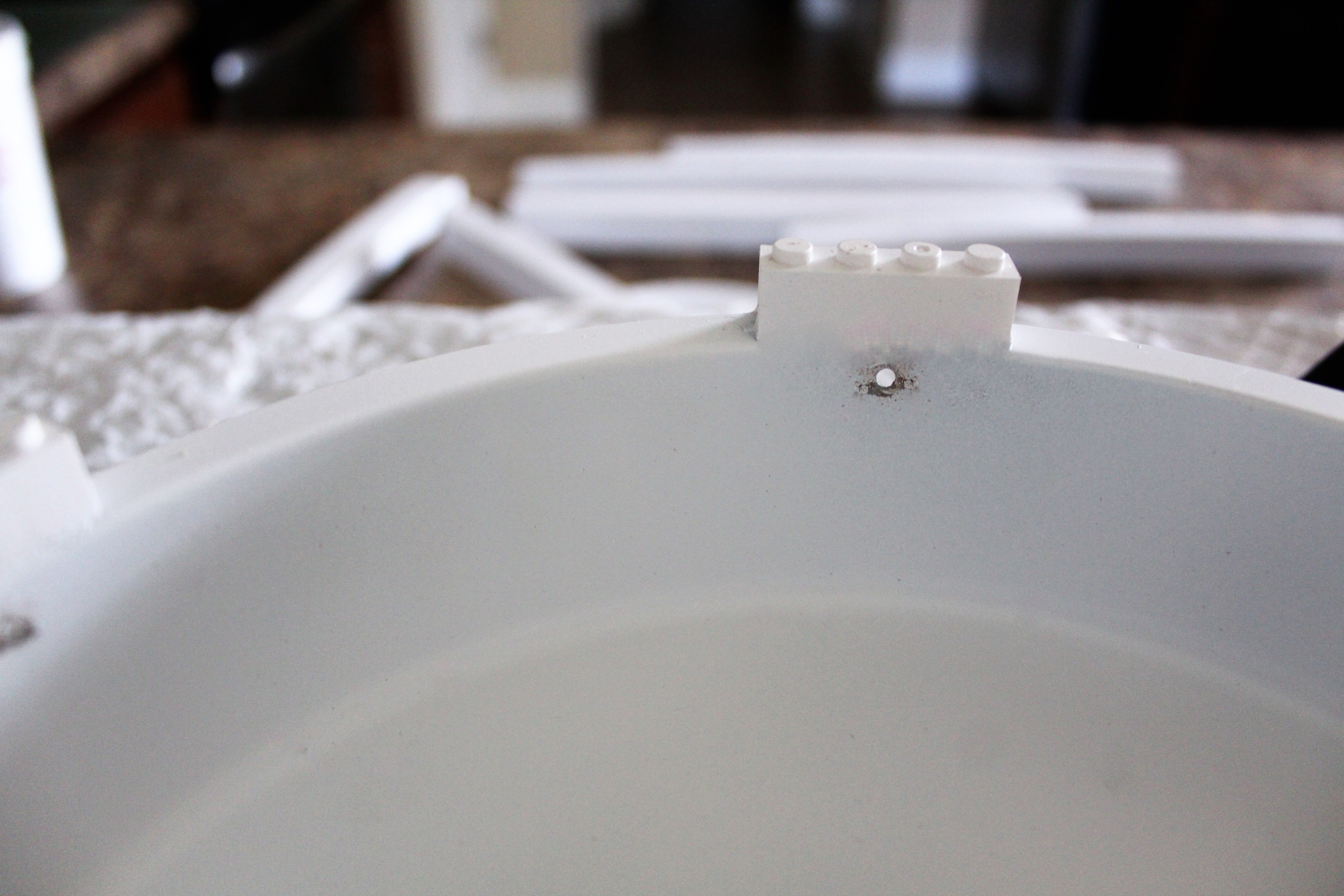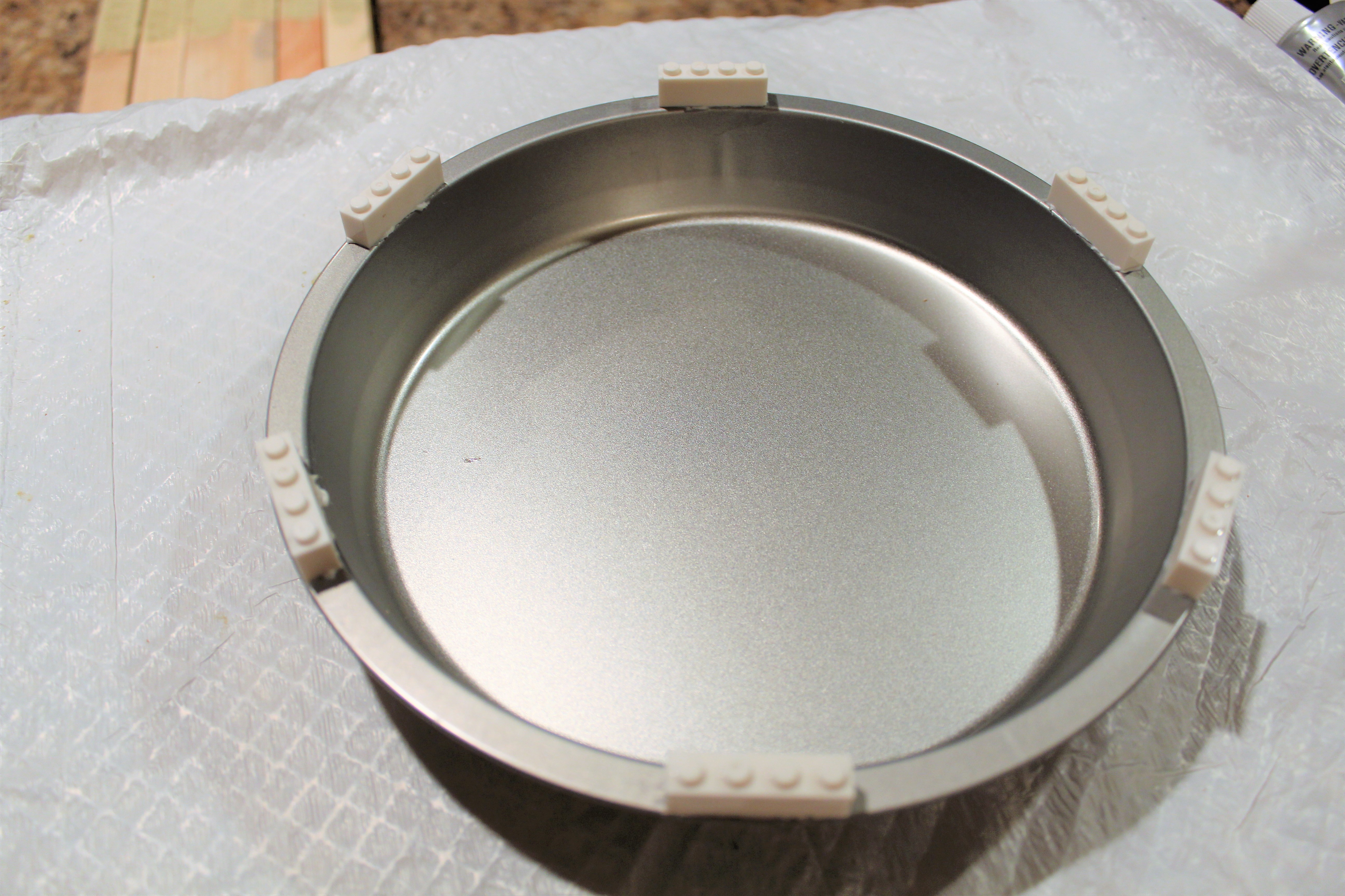 I took a drill and drilled a hole above the legos in the cake pan.