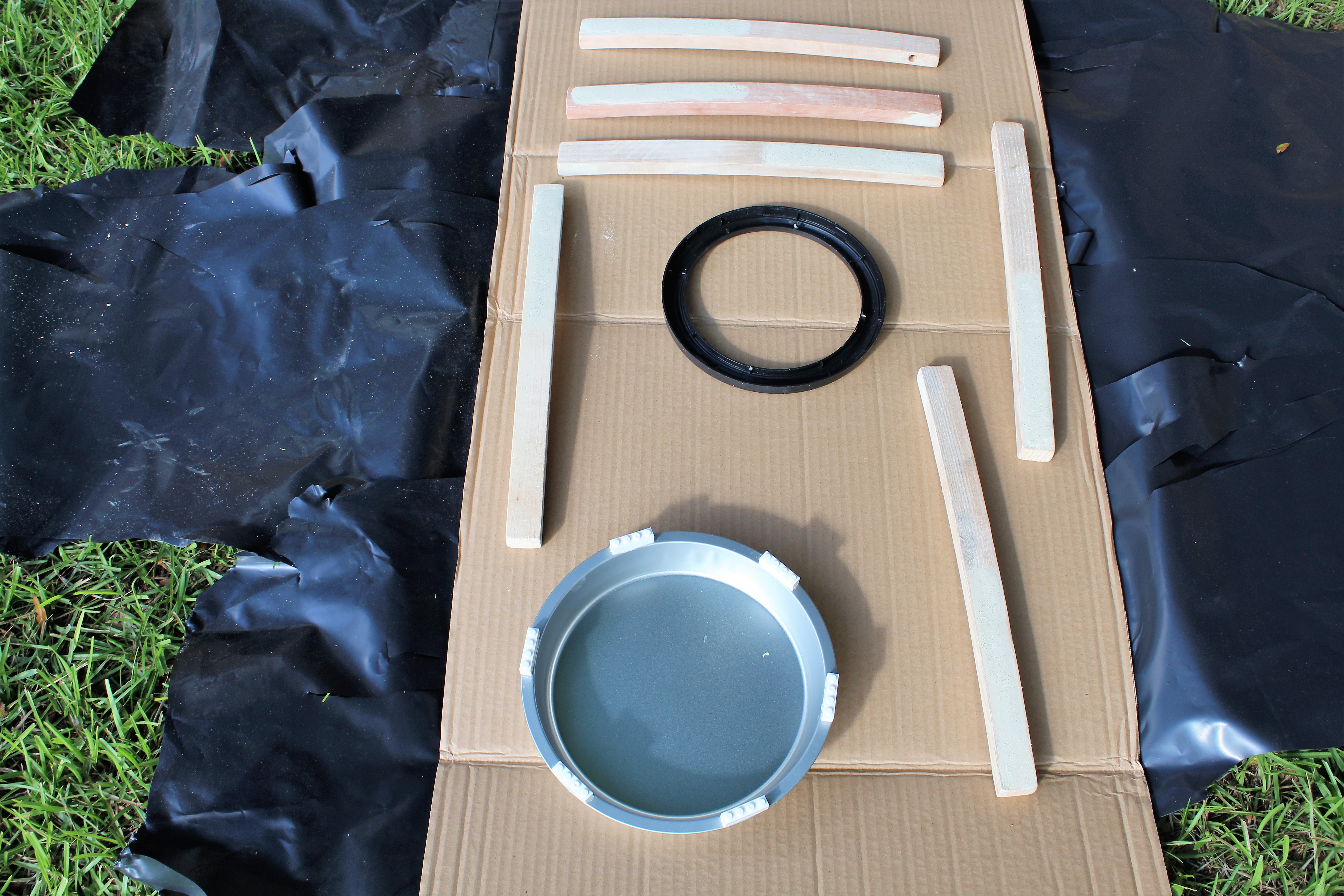 I took wood glue, the two handles with the holes at the end, cake pan, 2 small wood screws and a screwdriver.