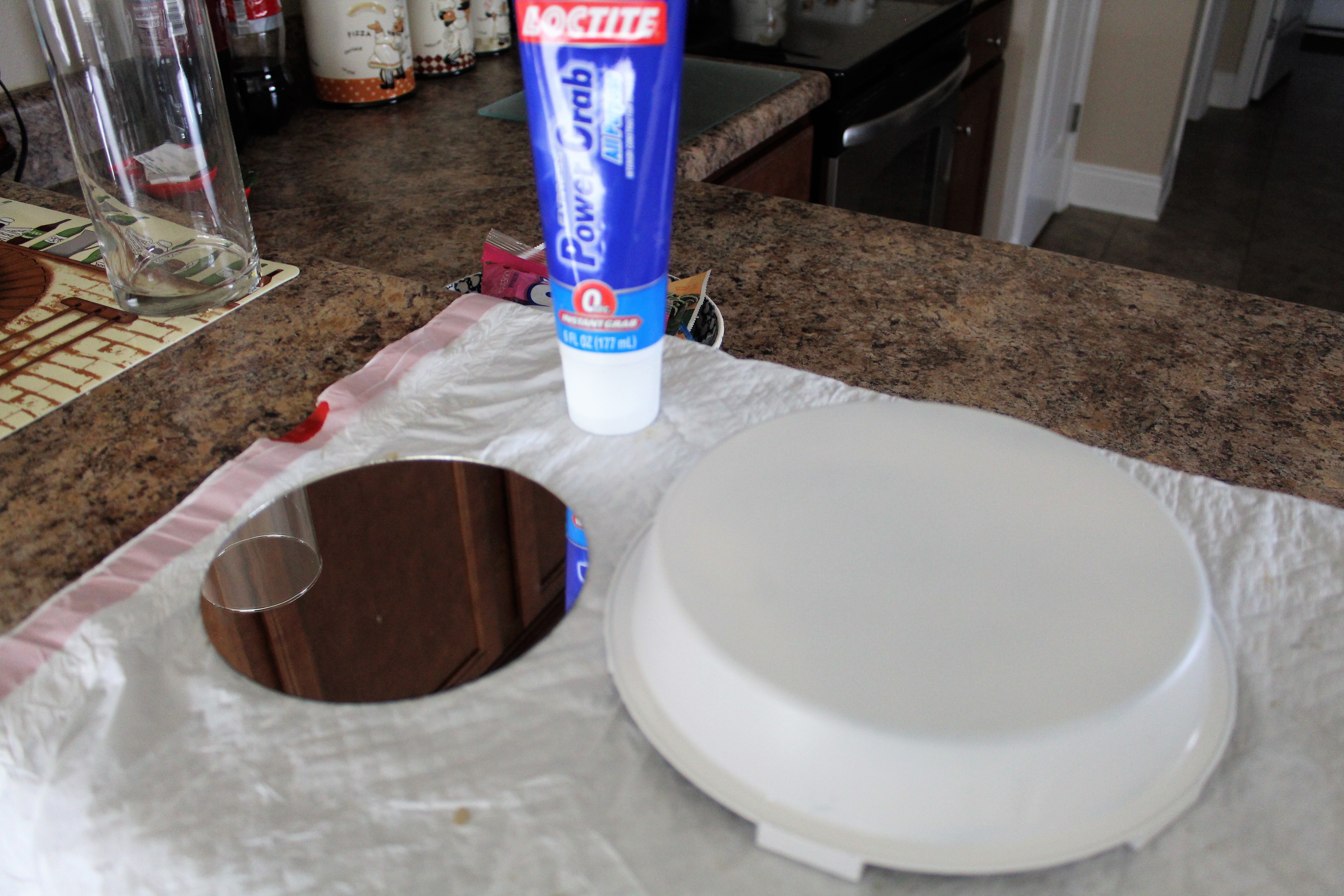 This part is optional: Taking the mirror, power grab and the cake pan. Attaching the mirror to the bottom of the cake pan making sure it is centered. I thought placing the mirror would reflect the candle light.