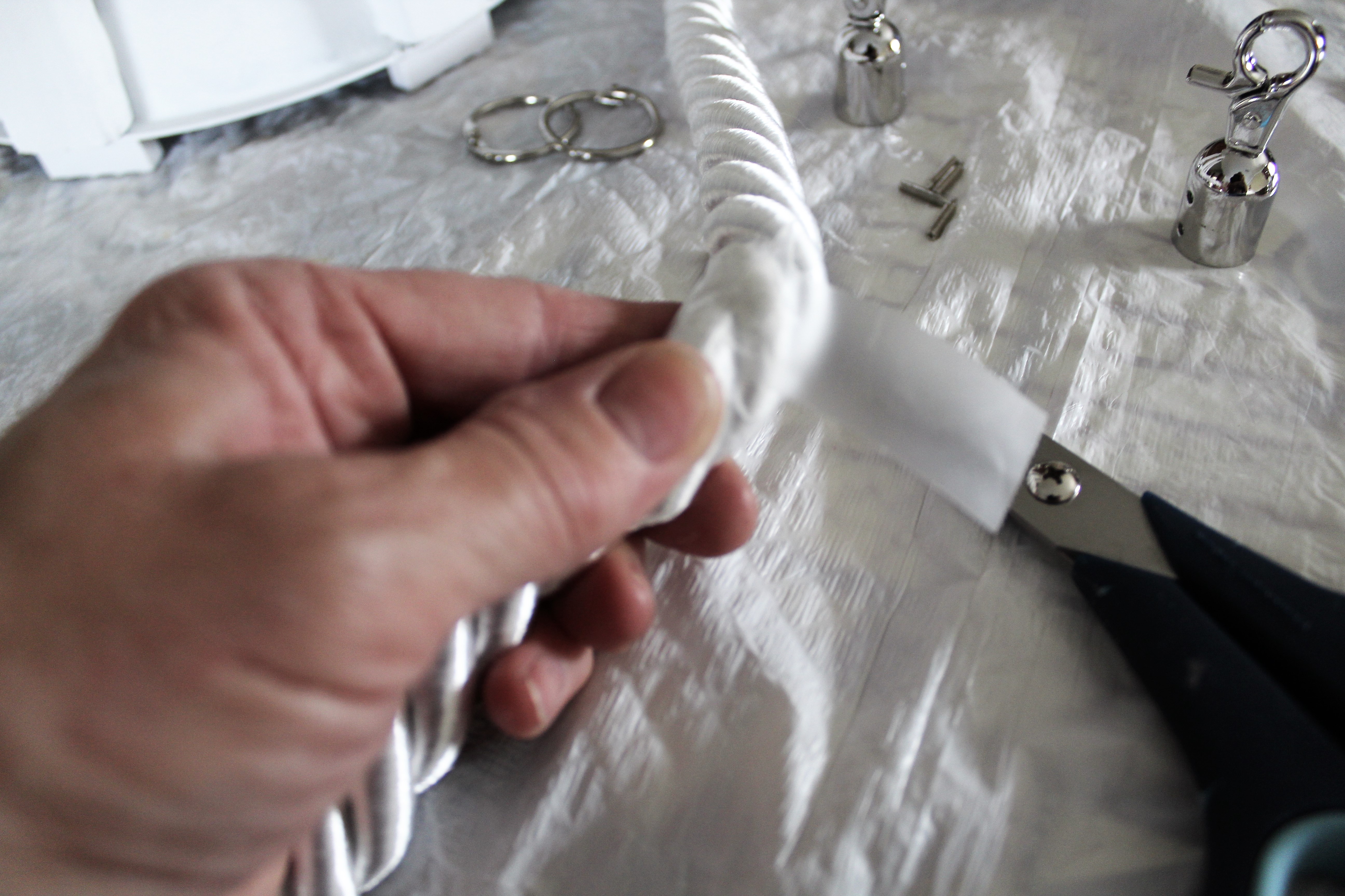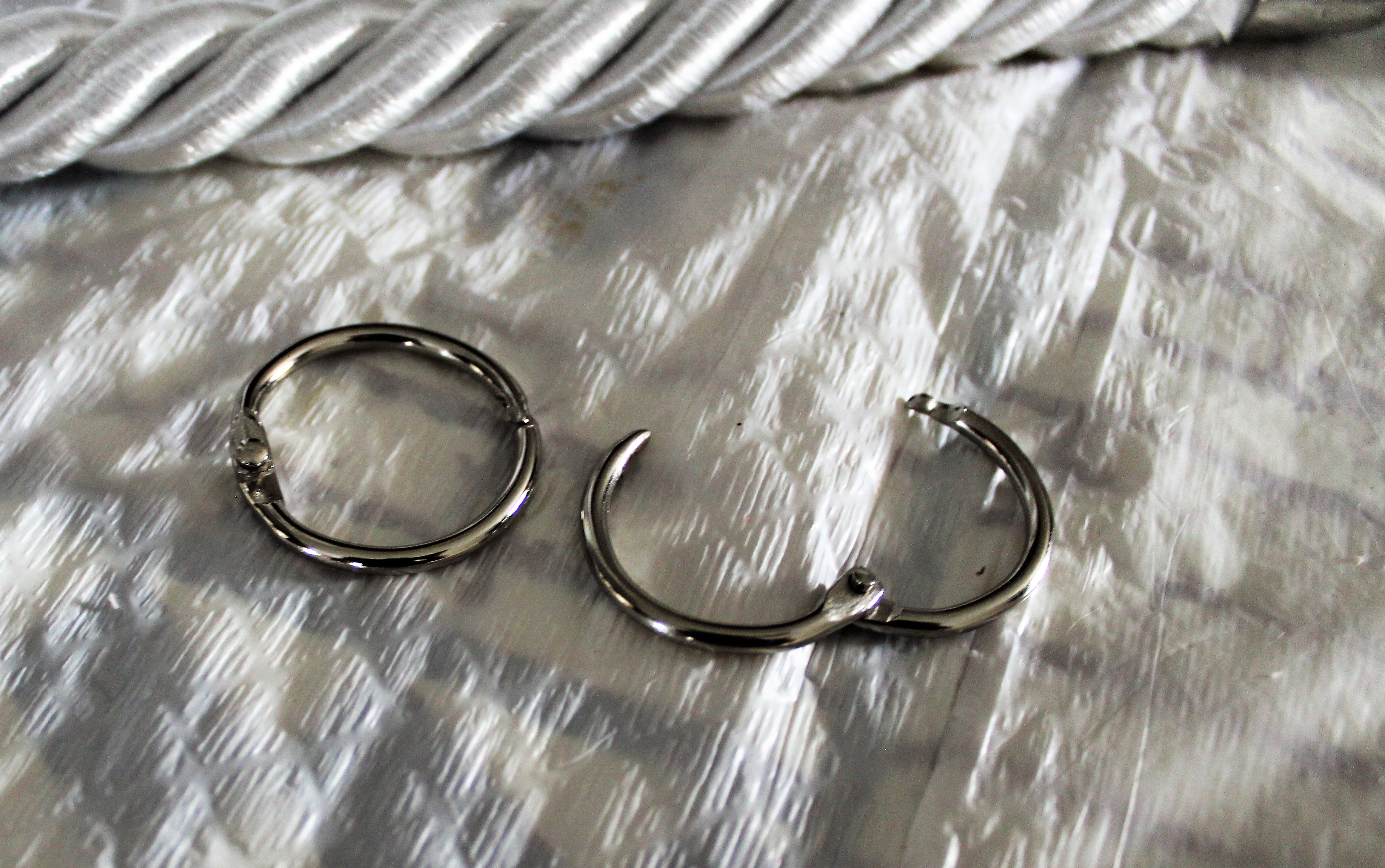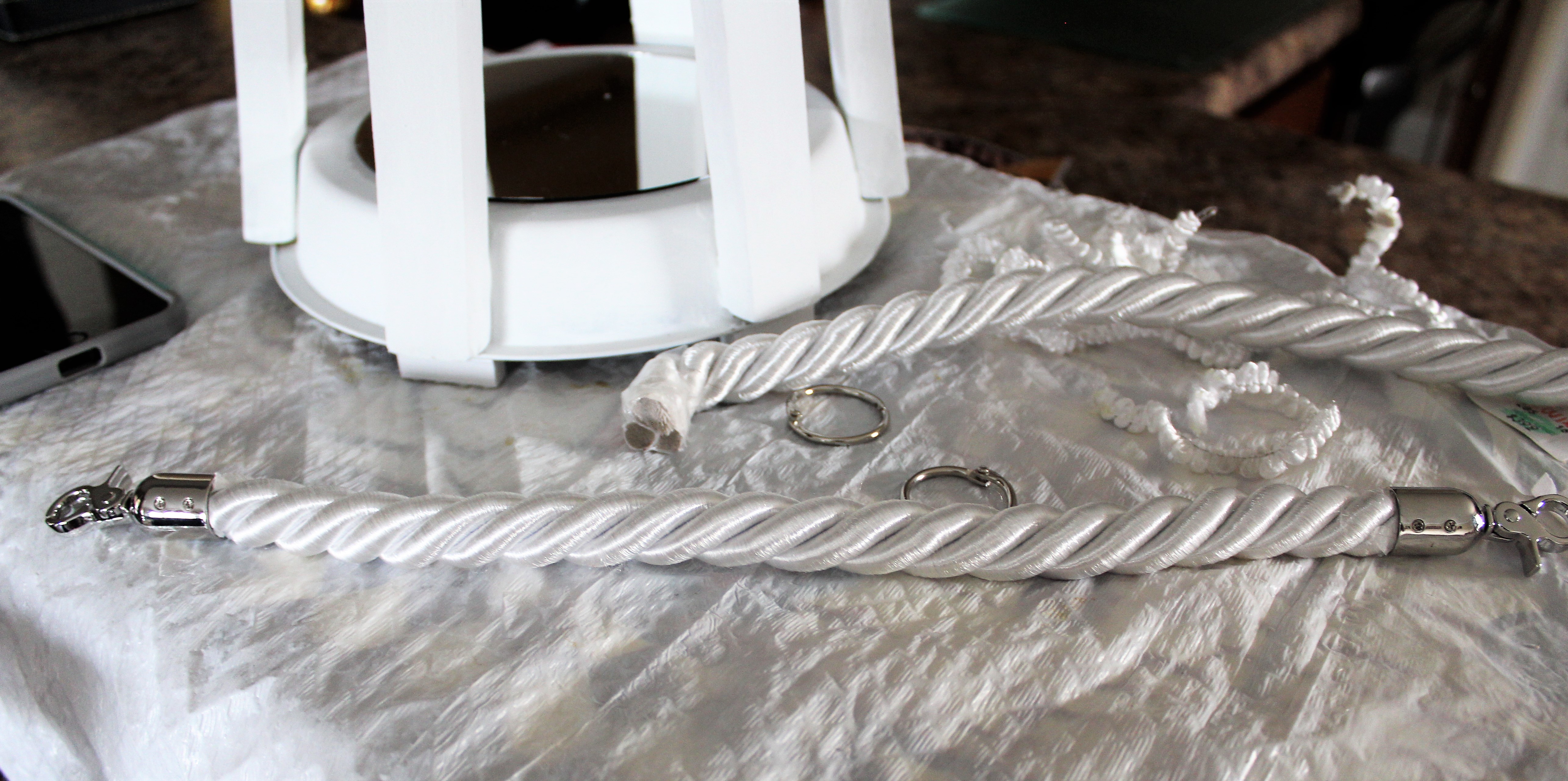 I just couldn’t see myself spending what they wanted for a thick nautical rope. I went over to the fabric department at Hobby Lobby and found a drapery tieback. Perfect, they were 50% off! I also purchased a package of tassel caps to add to the ends of the rope. It was also 50% off as well. To connect the rope to the handle I am using two 1 ½ inch album rings.