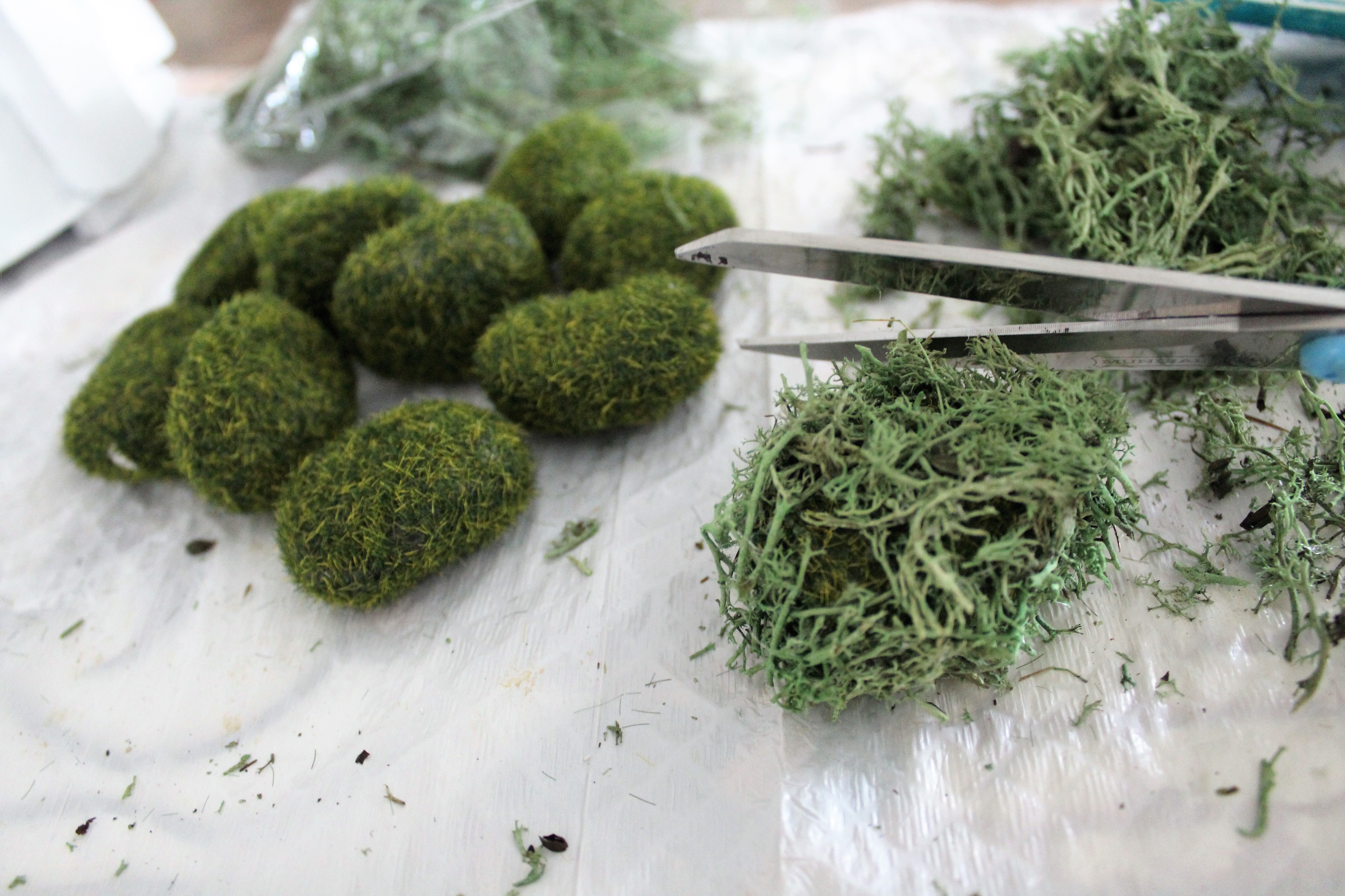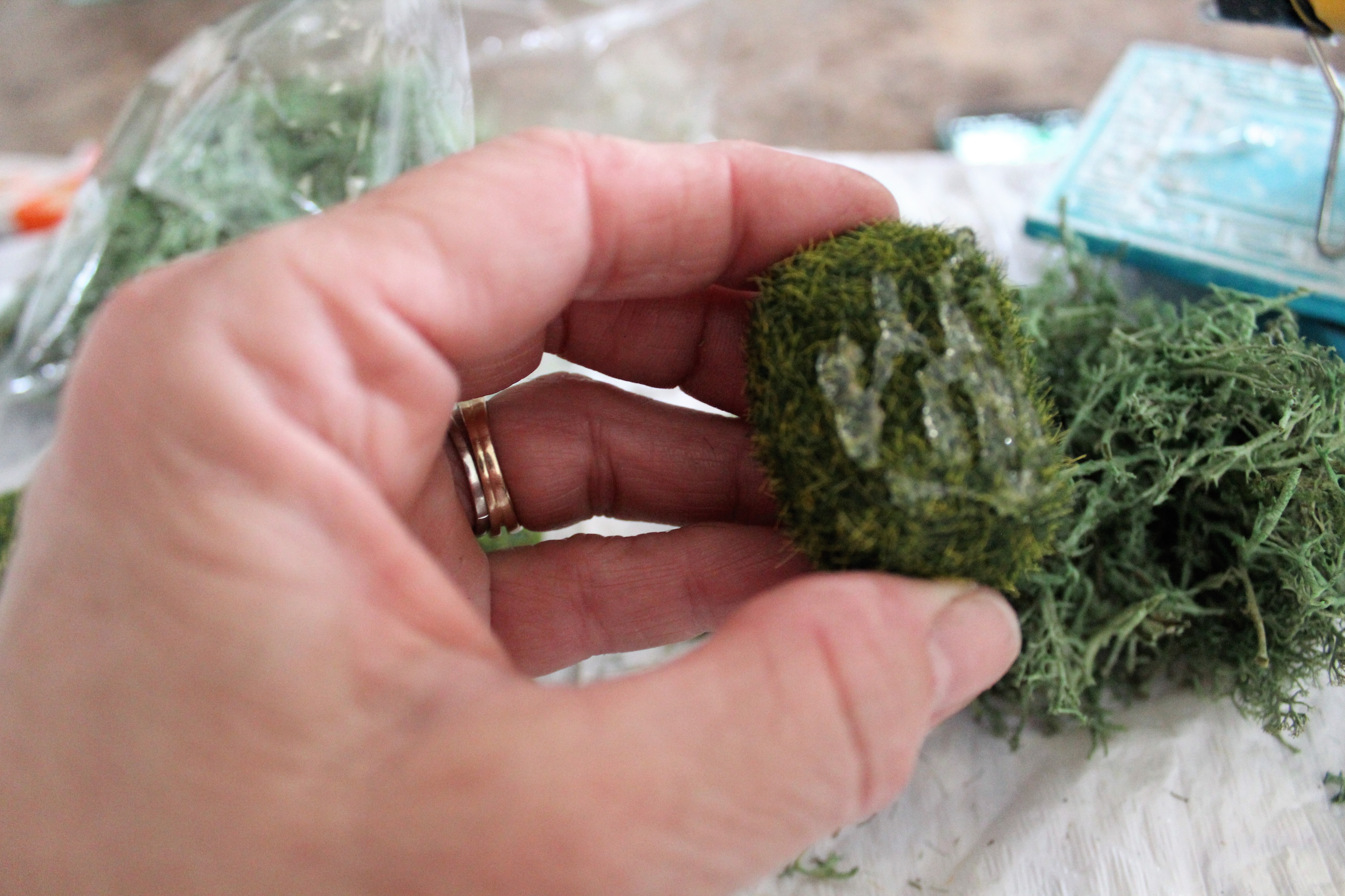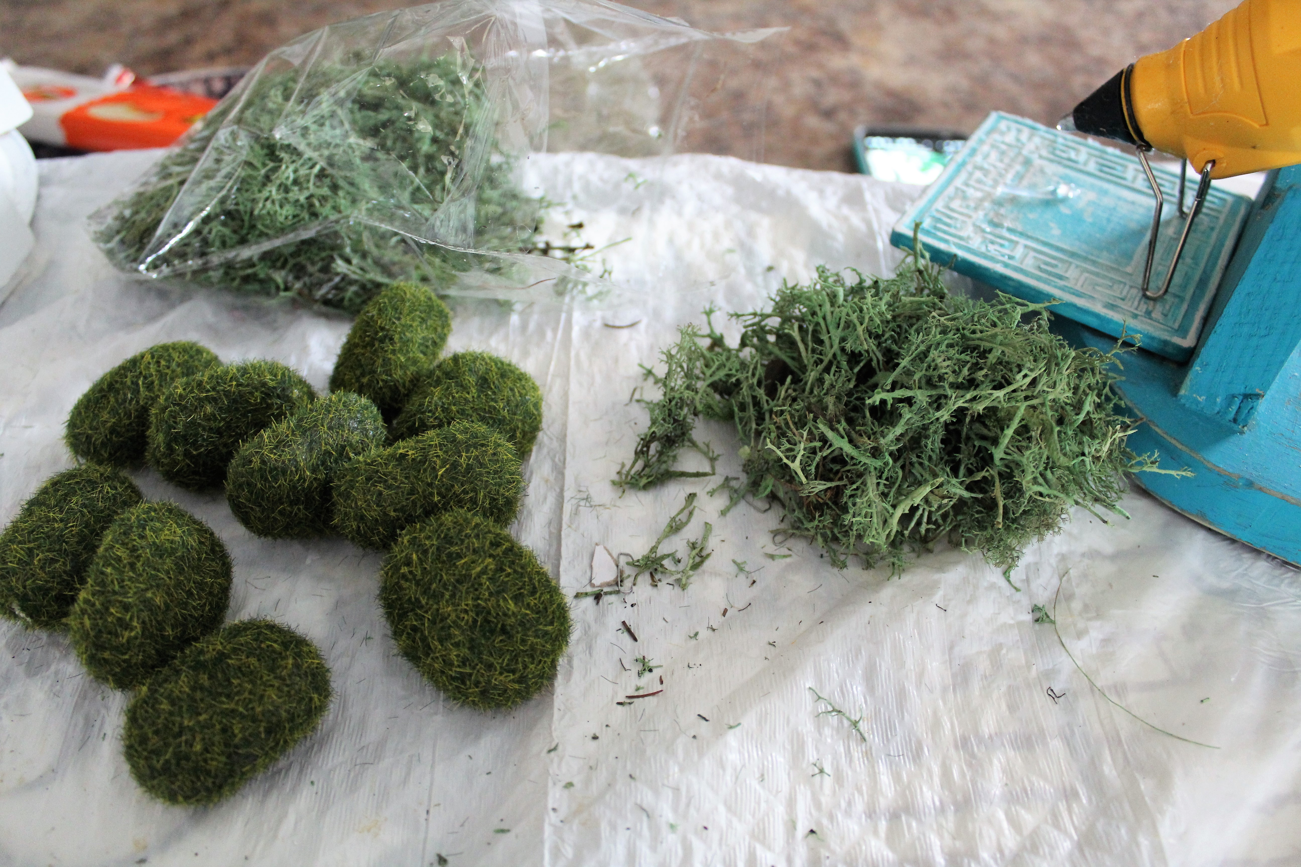 I took the stones added hot glue and applied the reindeer moss on the stones. Cutting to make it all even.