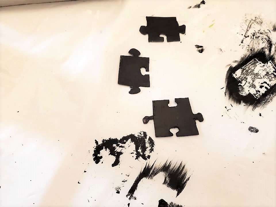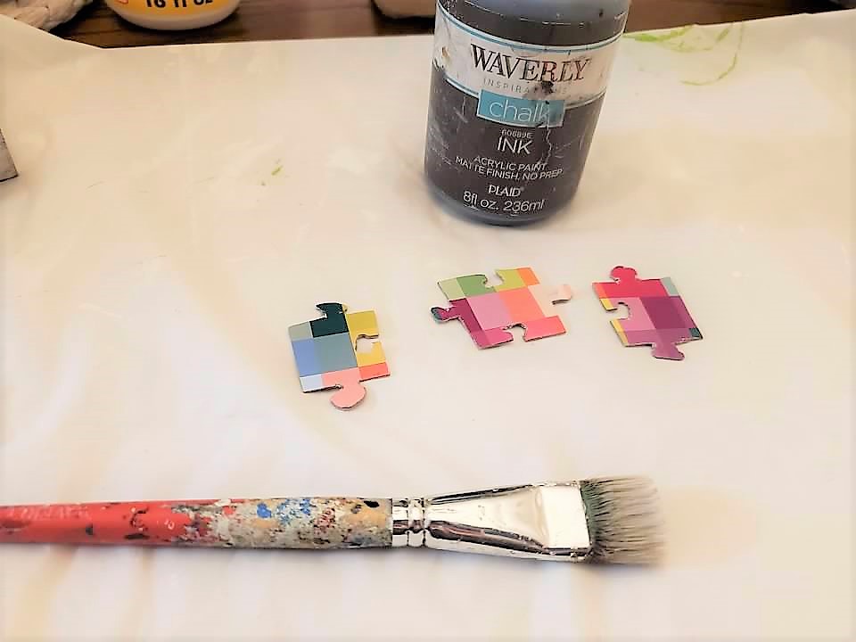 If you have an old puzzle sitting around take three connecting pieces and paint them black. I didn’t have a puzzle so I made my three pieces out of an old note book cover. I painted my three pieces black with Waverly Ink chalk paint. Set aside to let dry.